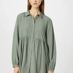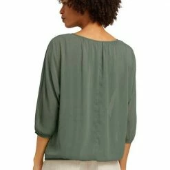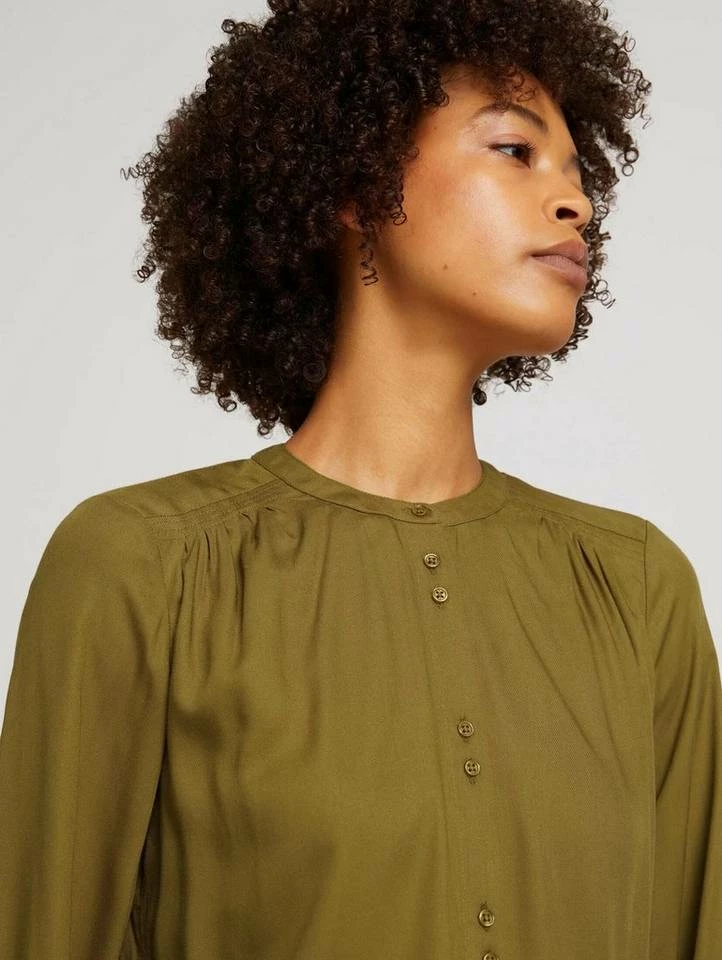 Bluse mit Knopfleiste für Frauen (mit Knopfleiste) aus fließender Viskose, Unifarbe, leichte Ballonärmel mit elastischem Bund, Faltenlegung an den Schultern