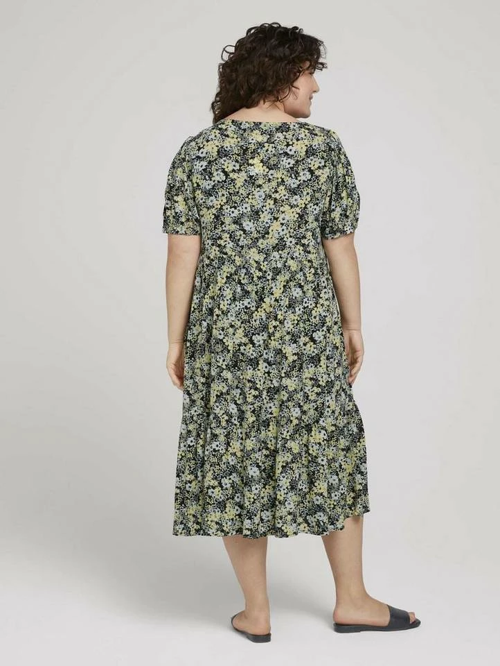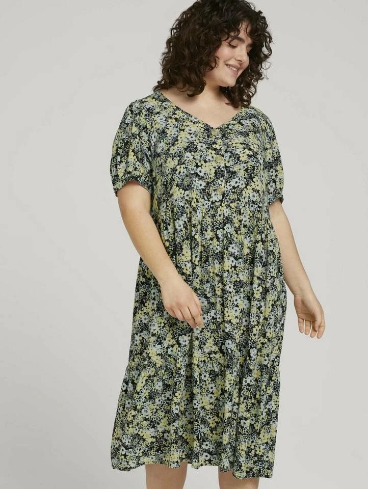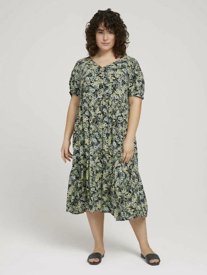 Plus – Blumen Midikleid mit LENZING(TM) ECOVERO(TM) für Frauen (halbarm mit V-Ausschnitt und kurzer Knopfleiste) aus nachhaltigen und feinen Viskosefasern, enthält nachhaltige Viskose, mit Blumenmuster, mit Volants am Rockteil, seitliche Eingrifftaschen