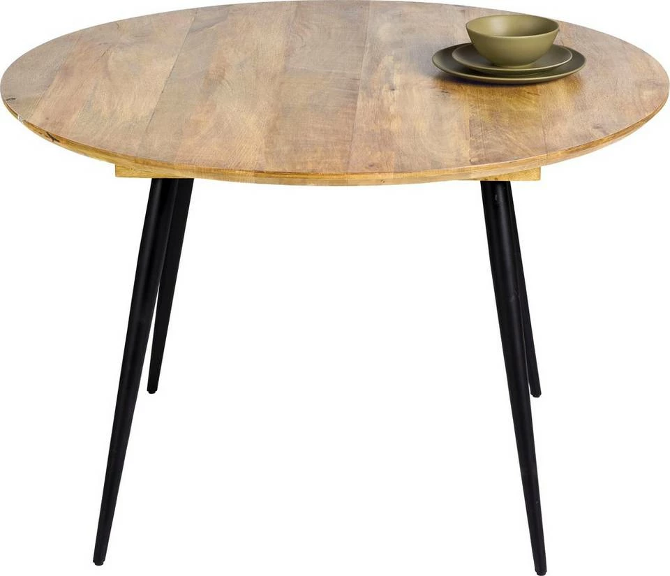 Zum SOHO Tisch gibt es jetzt auch eine runde Version. Aus hellem Mangoholz mit schwarzen Metallbeinen.