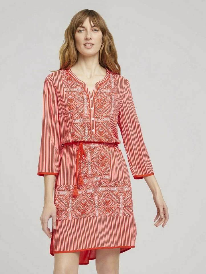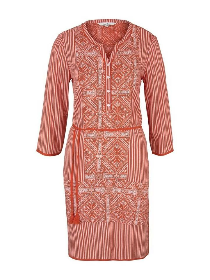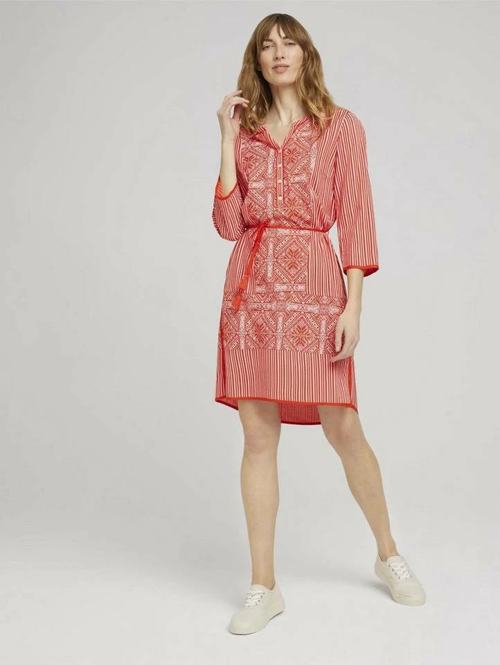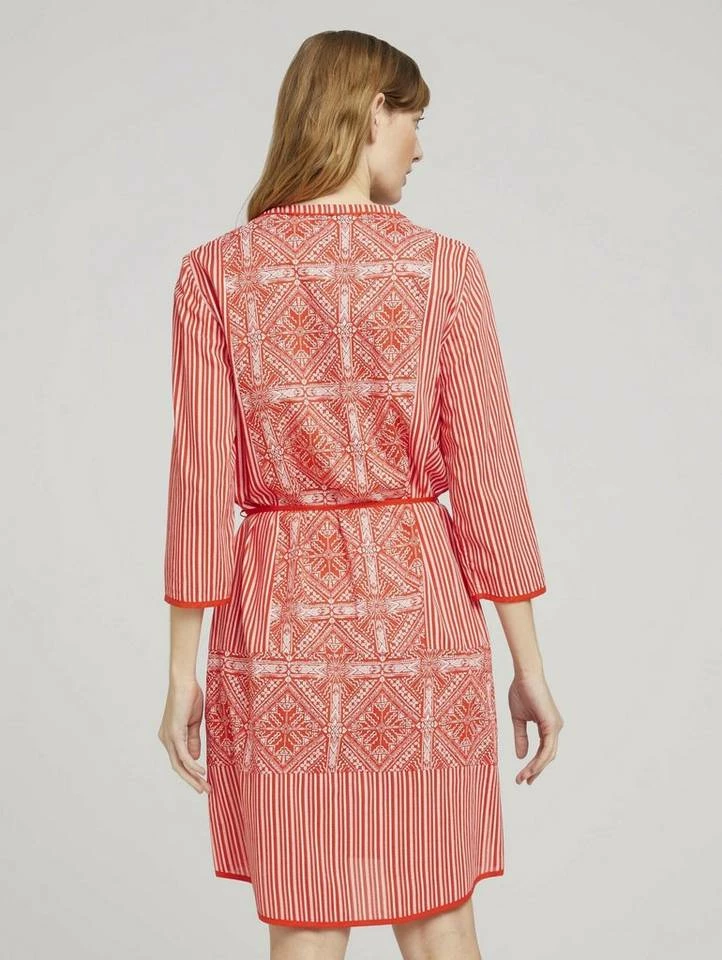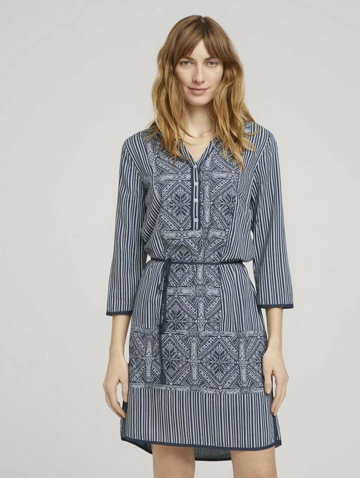 Gemustertes Tunika Kleid für Frauen (3/4 Arm mit Henleyausschnitt und Knopfleiste) aus fließender Viskose, mit Bindegürtel an der Taille, mit Teilungsnähten, gemustert