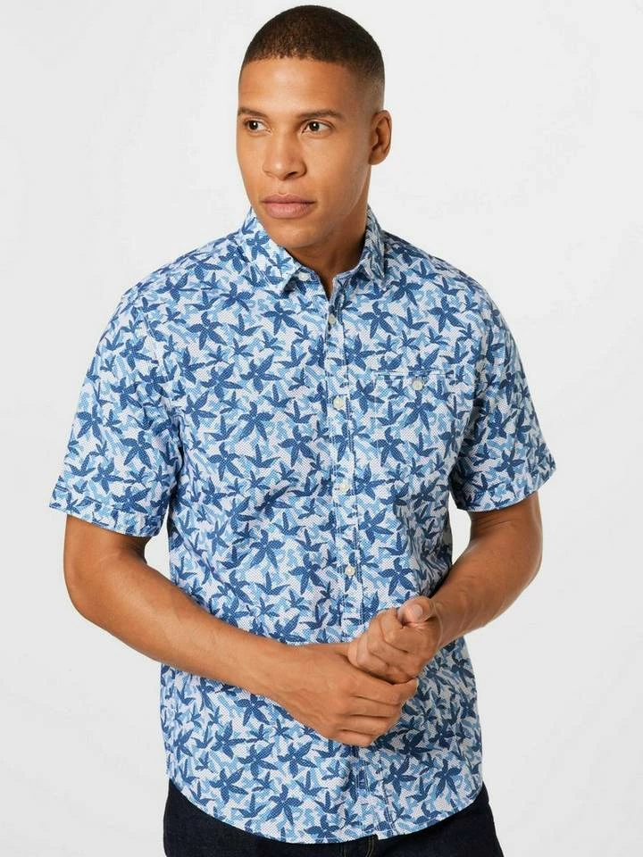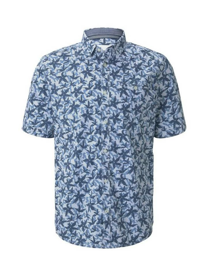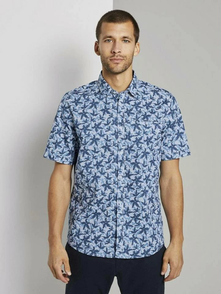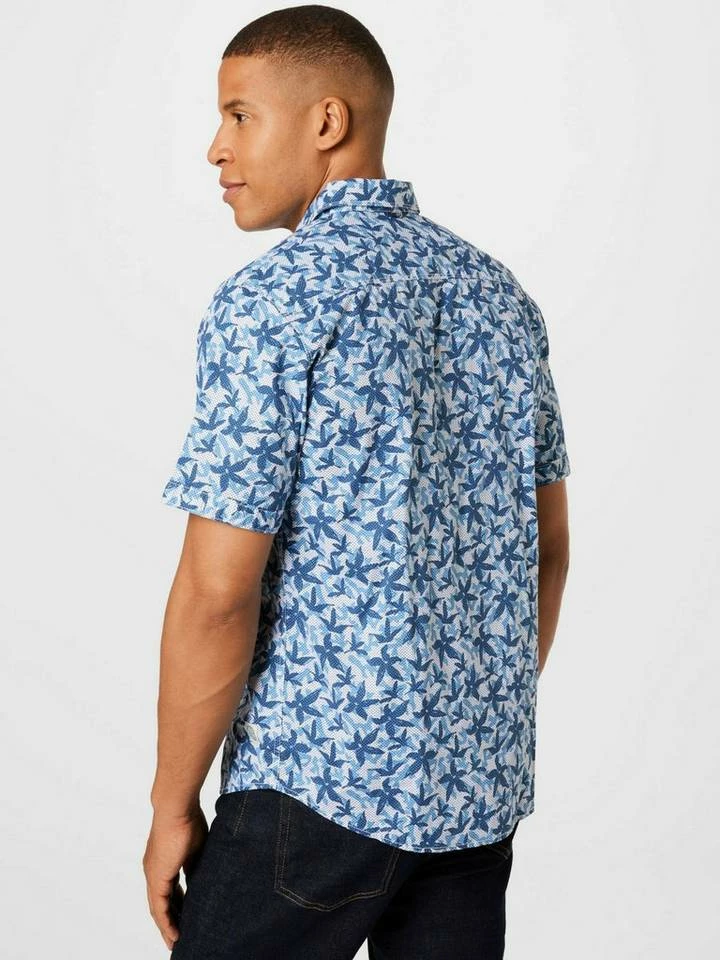 Gemustertes Hemd für Männer (kurzärmlig mit Kent-Kragen und Knopfleiste zum Schließen) aus Baumwolle mit Stretch-Anteil, ganzflächig gemustert, mit aufgesetzter Tasche auf der Brust, mit Logo-Badge vorne seitlich am Saum