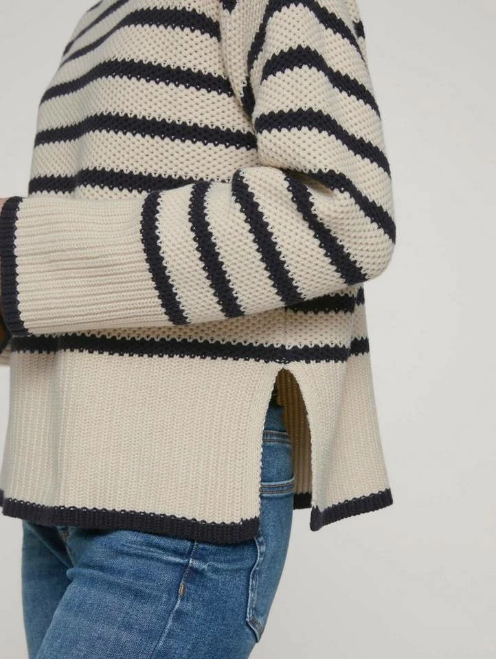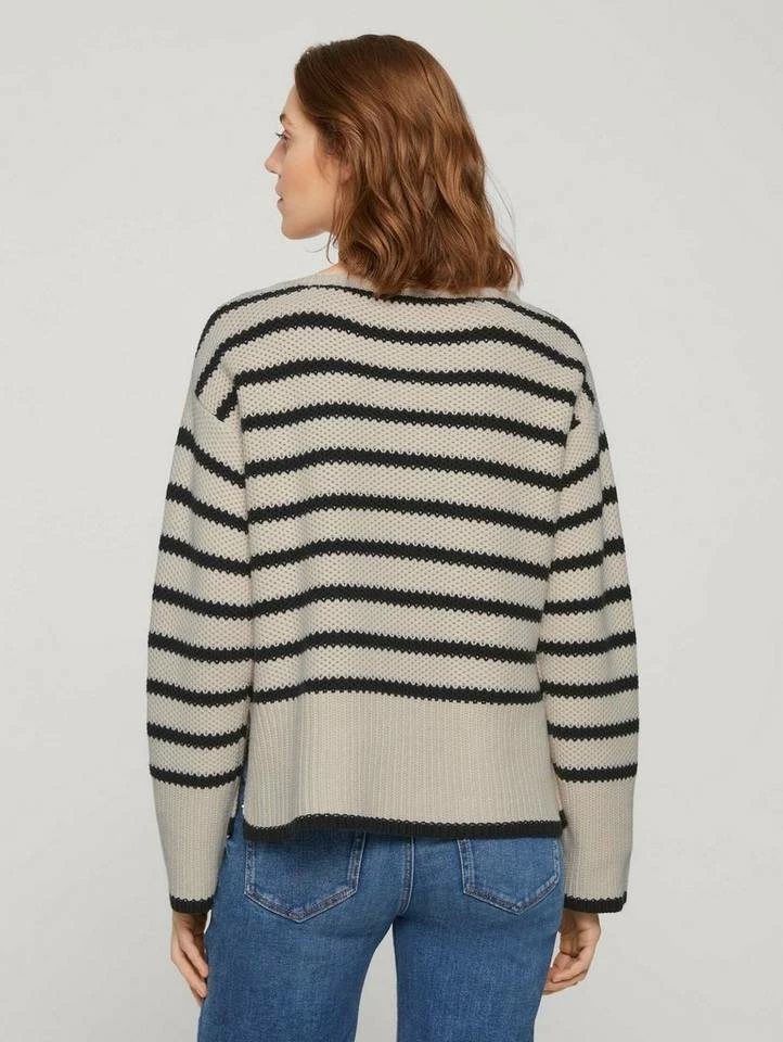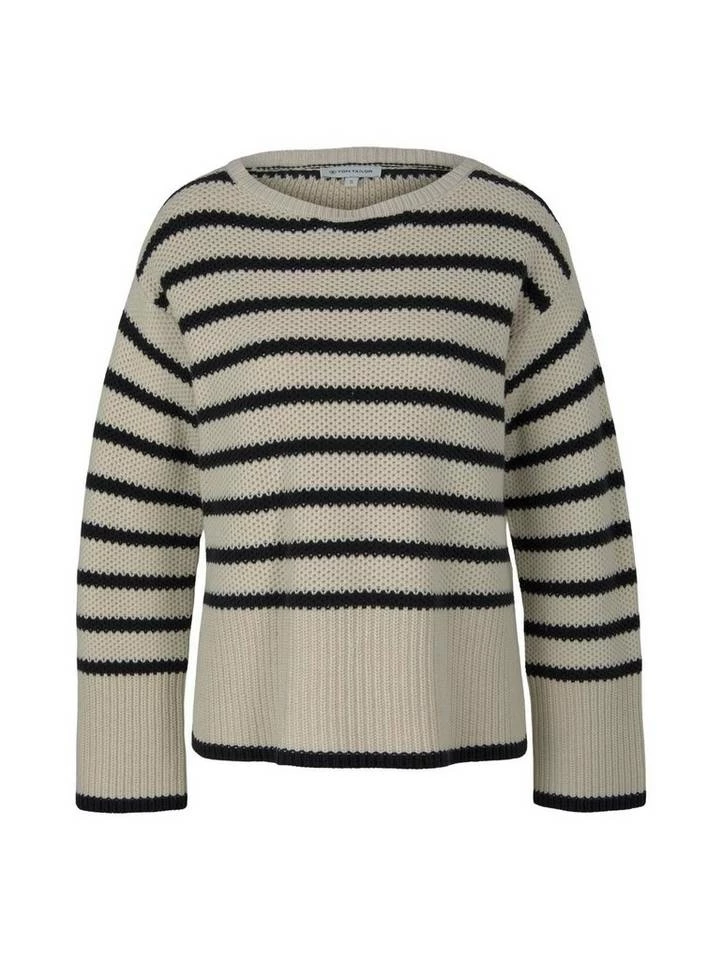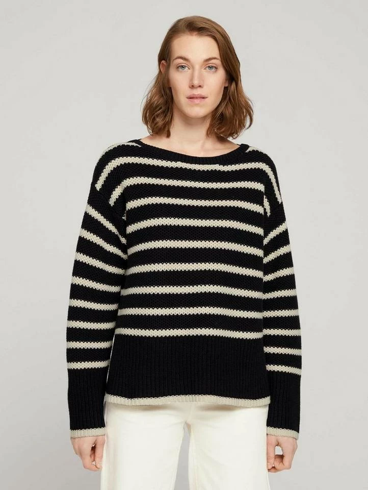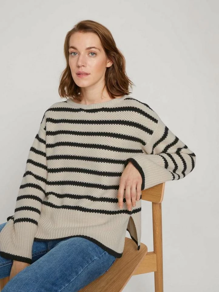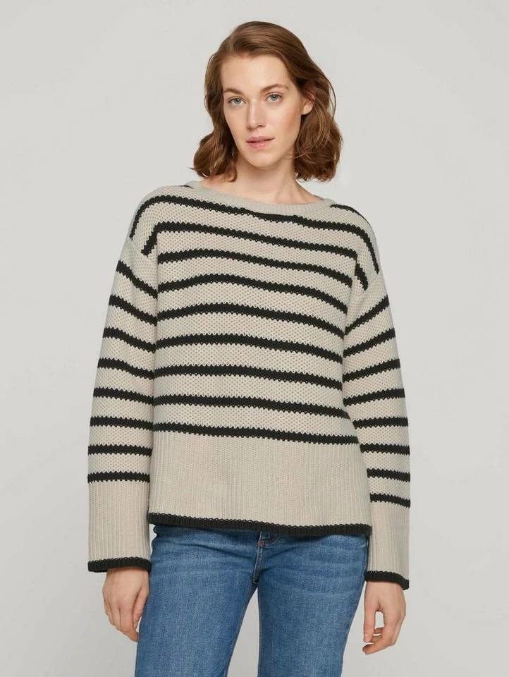 Pullover mit Streifenmuster für Frauen (langärmlig mit U-Boot Ausschnitt) aus atmungsaktiver und gemütlicher Baumwolle, gestreift im Strickmuster, breite Rippbündchen am Saum