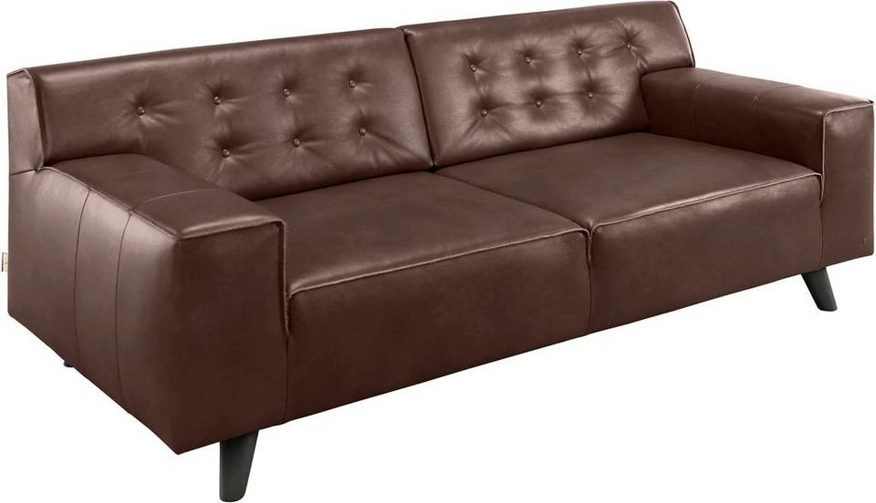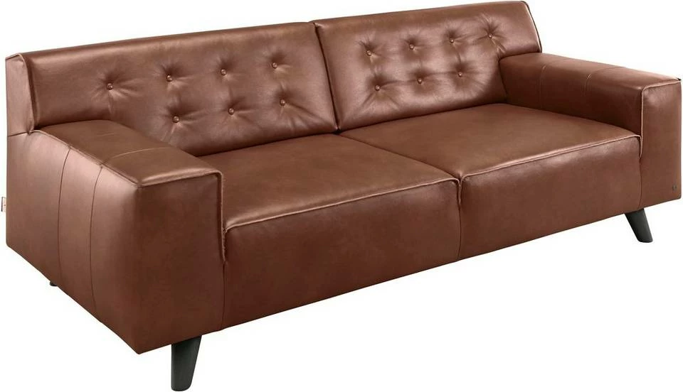 Zum gemütlichen Mittelpunkt im Wohnbereich wird das 2,5-Sitzer Sofa »NORDIC CHIC« von TOM TAILOR im modischen Retrostil. Es ist mit einer dekorativen Kedernaht versehen und zeichnet sich durch die Gestaltung in trendigen Retrofarben aus. Eine schöne Knöpfung an der Rückenlehne sowie auffällige Holzfüße unterstreichen die moderne Vintage-Optik. Ausgestattet ist die frei im Raum stellbare Couch mit einer hochwertigen Polsterung aus Polyätherschaum, welche einen hohen Sitzkomfort ermöglicht. Für viel Gemütlichkeit sorgt auch der weiche und hochwertige Lederbezug, mit dem der 2,5-Sitzer versehen ist. Abgerundet wird seine erstklassige Qualität durch Füße aus stabilem Massivholz. Punktet mit einer hochwertigen Verarbeitung und ausgezeichnetem Sitzgefühl: das 2,5-Sitzer Sofa »NORDIC CHIC« von TOM TAILOR im modischen Retrostil.