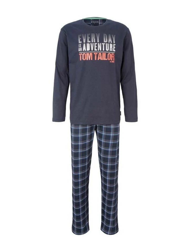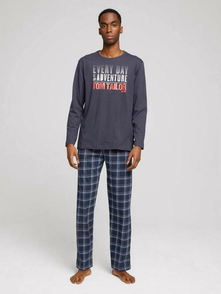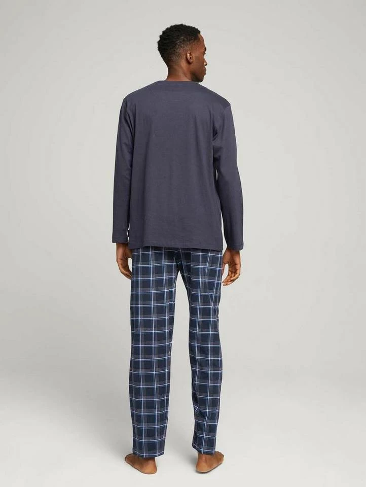 Langärmliges Pyjama Set mit Muster und Logo-Print für Männer (langärmlig mit Rundhalsausschnitt) aus atmungsaktiver und weicher Baumwolle, karierte Hose und Oberteil mit Logo-Print auf der Frontseite, im Set bestehend aus Langarmshirt und langer Stoffhose mit elastischem Bund