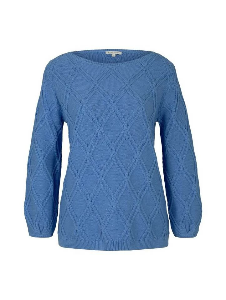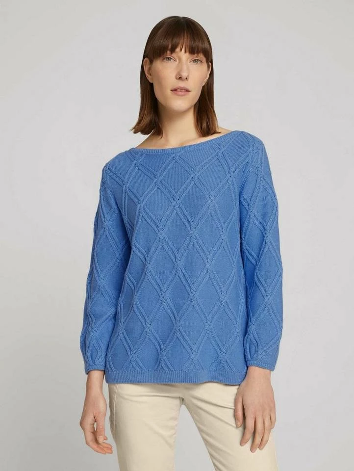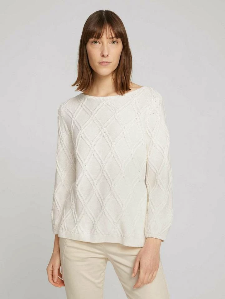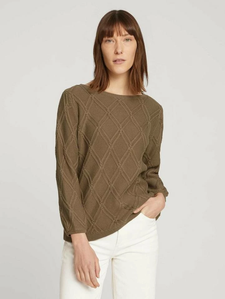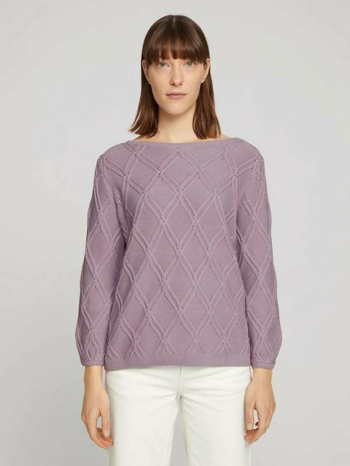 Pullover mit Strukturmuster für Frauen (7/8 Arm mit U-Boot-Ausschnitt) aus atmungsaktiver und weicher Baumwolle, mit Strickmuster, Logo-Badge seitlich am Saum