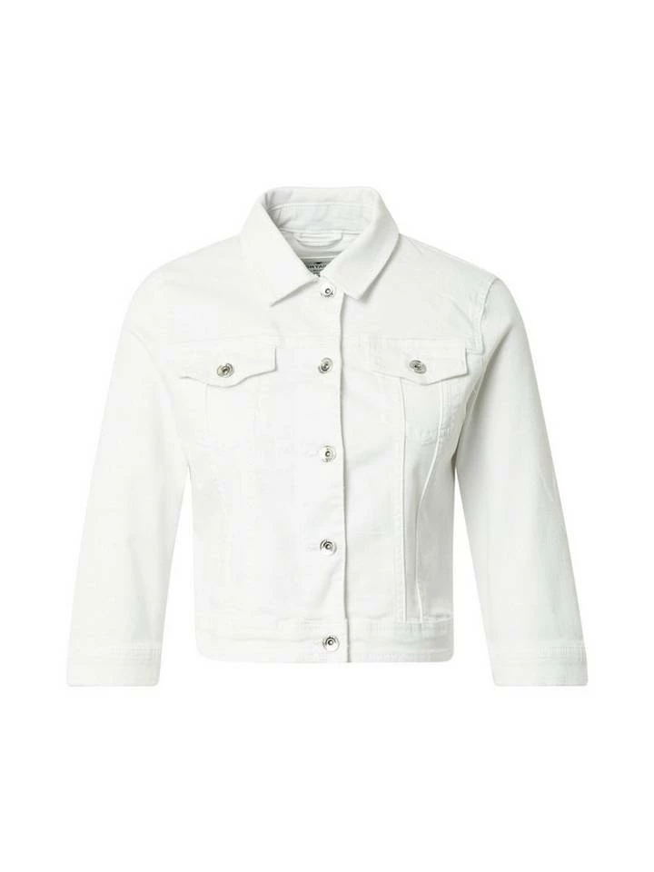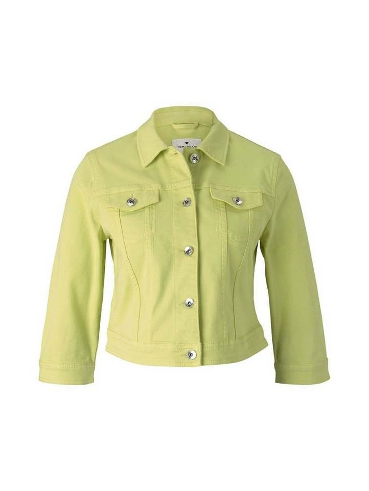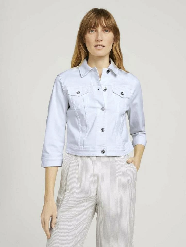 Kurze Jeansjacke für Frauen (3/4 Arm mit Kentkragen und Knopfleiste) aus Denim, geknöpfte Brusttaschen, kurze Schlitze am Ärmel