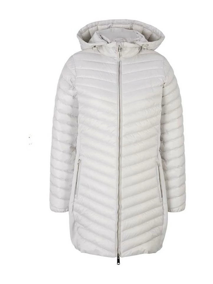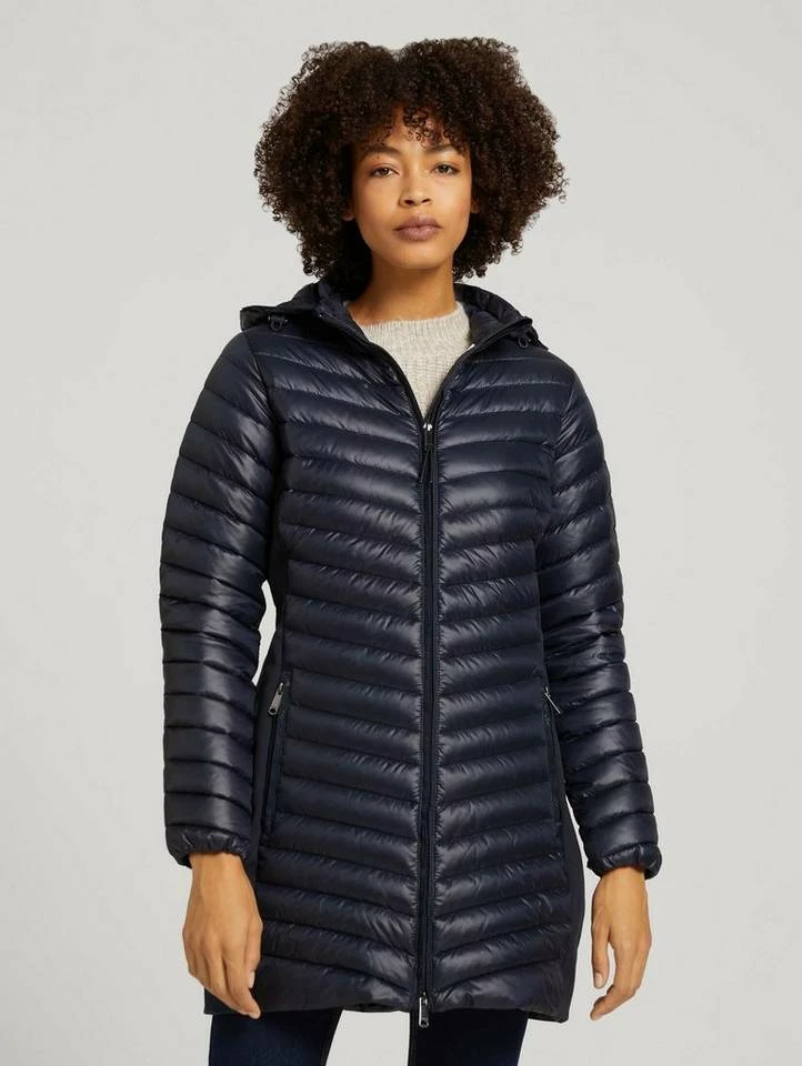 Lange Steppjacke mit recyceltem Polyester für Frauen (langärmlig mit Kapuze und Reißverschluss) mit pflegeleichten und recycelten Polyesterfasern, seitliche Reißverschlusstaschen, mit wasserabweisenden Eigenschaften, mit Softshell-Einsätzen an den Seiten, mit Steppungen und dünnem Innenfutter, mit abnehmbarer Kapuze