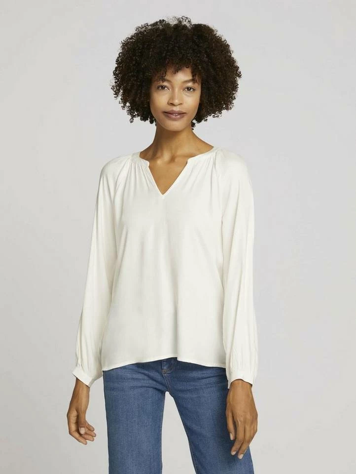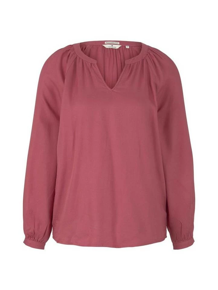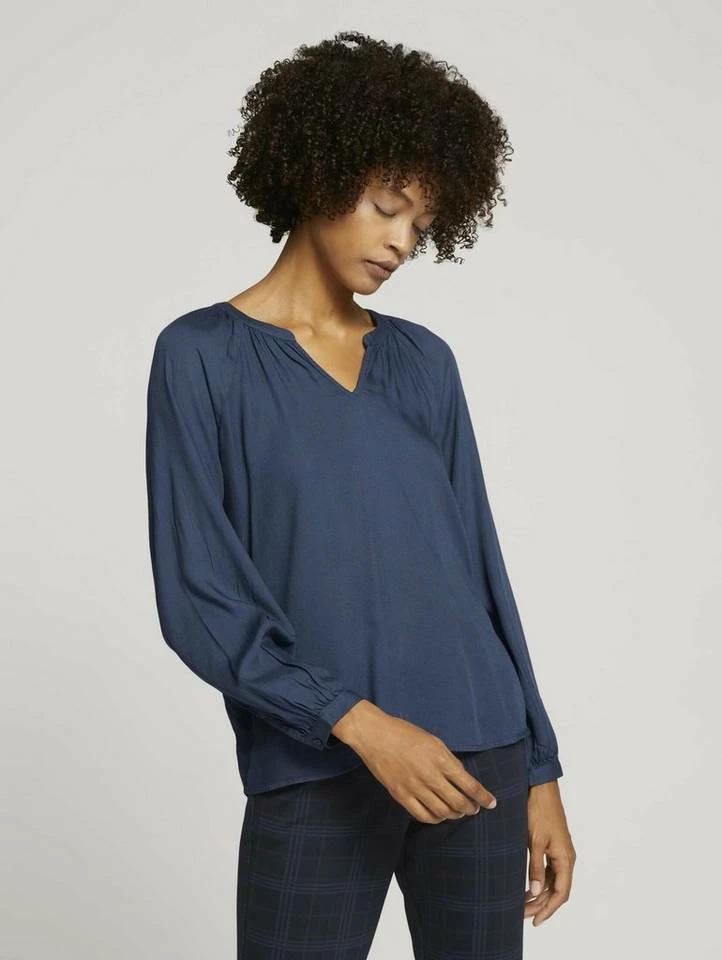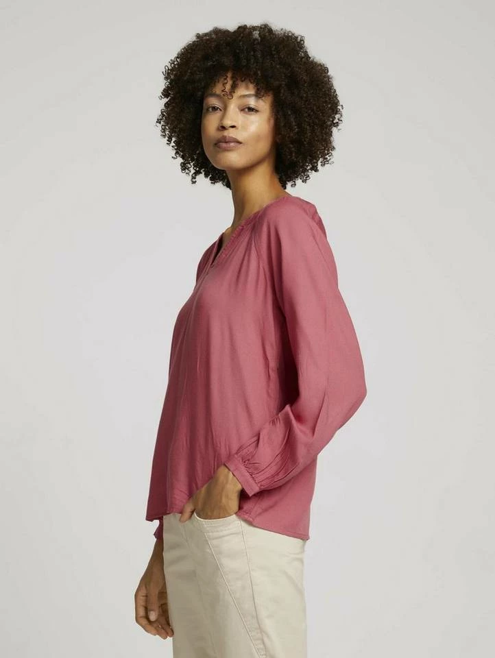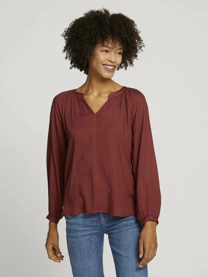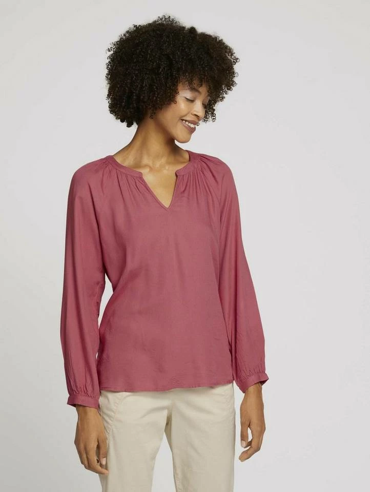 Geraffte Bluse mit LENZING(TM) ECOVERO(TM) für Frauen (langärmlig mit Henleyausschnitt) aus nachhaltigen und feinen Viskosefasern, mit Raffungen an Ausschnitt und Ärmel, mit Raglanärmeln, unifarben