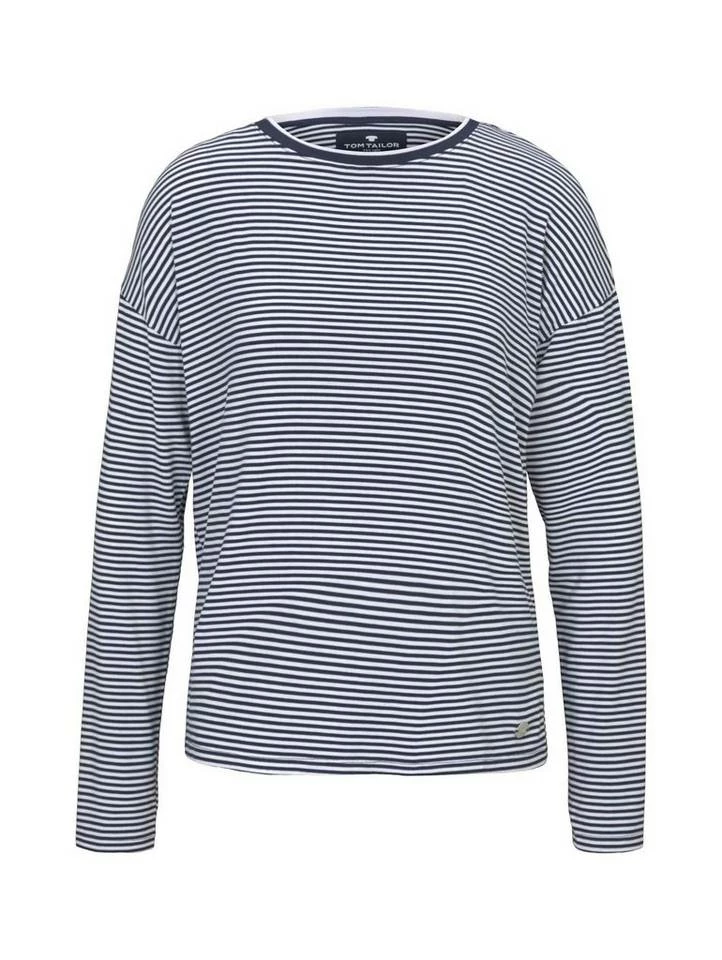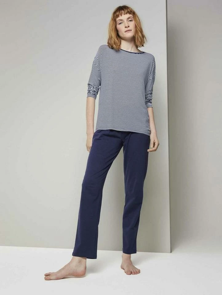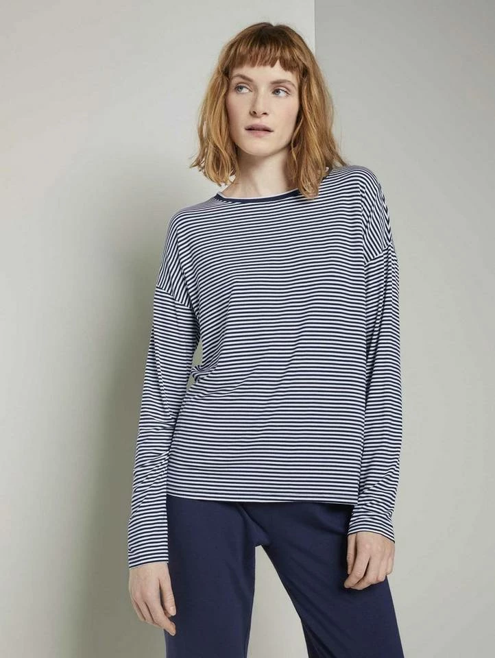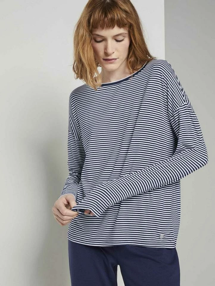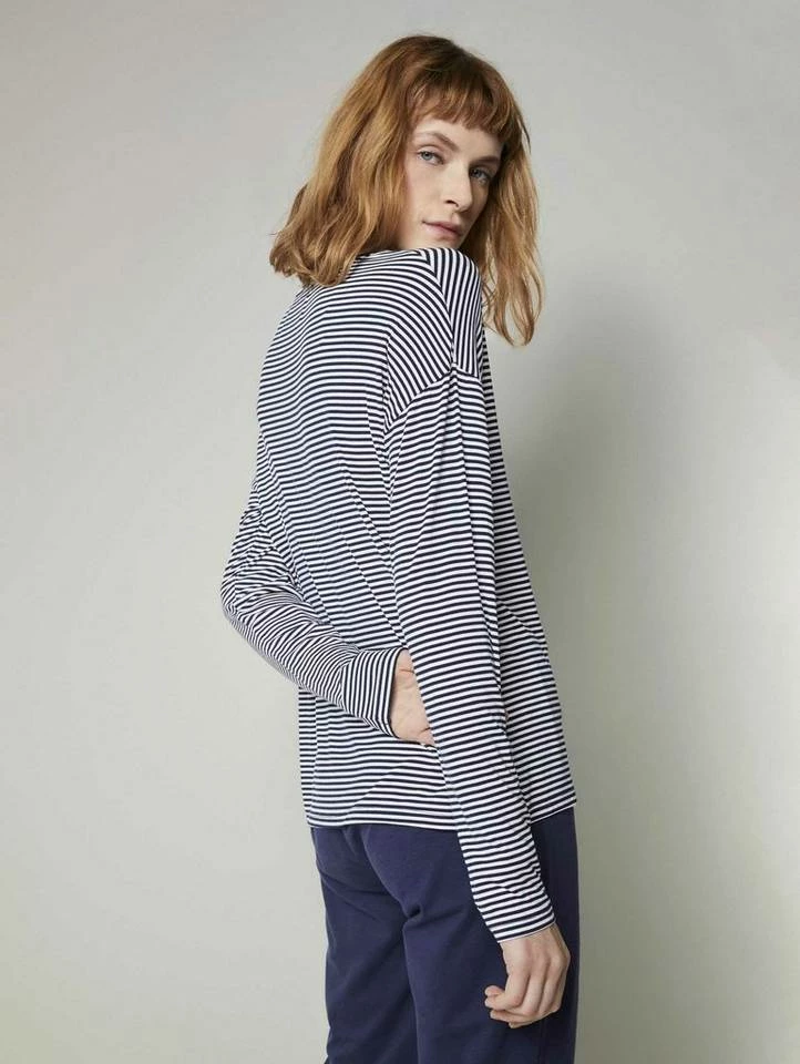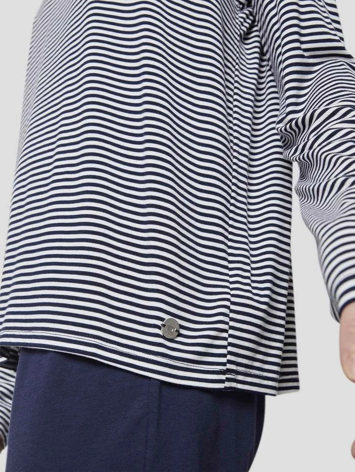 Pyjama Oberteil mit Streifen für Frauen (langärmlig mit Rundhalsausschnitt) aus fließender Viskose, gestreift, mit Logo-Coin seitlich am Saum