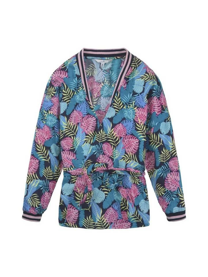 Gemusterte Kimono-Jacke für Mädchen (langärmlig und nach vorne offen geschnitten, mit Bindeband zum Schließen) aus Crépe, mit ganzflächiger, bunter Blatt-Musterung, mit abgesetzten, gestreiften Saumkanten an Ärmel und Ausschnitt