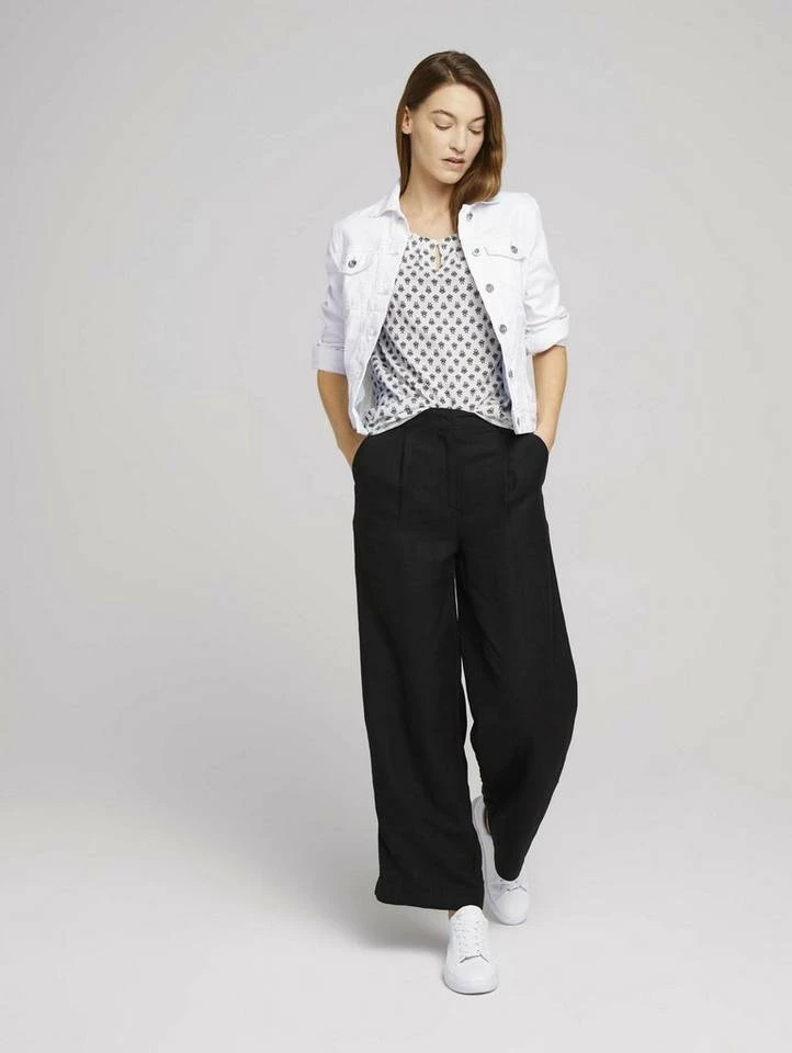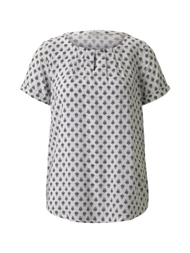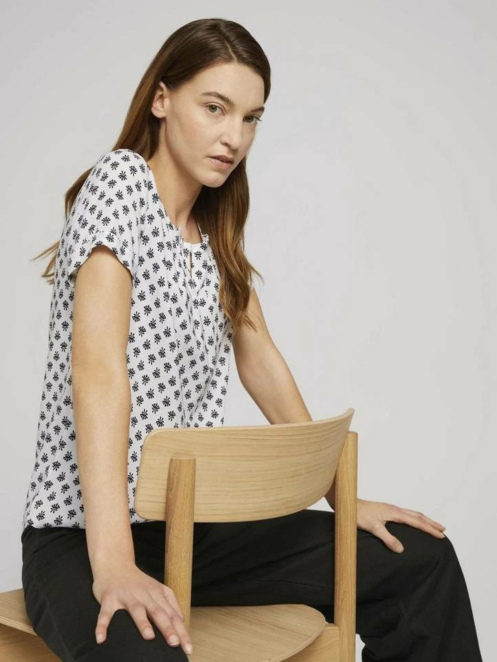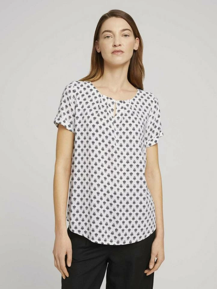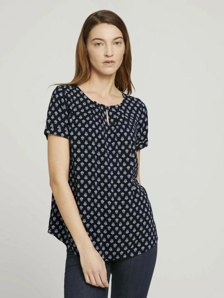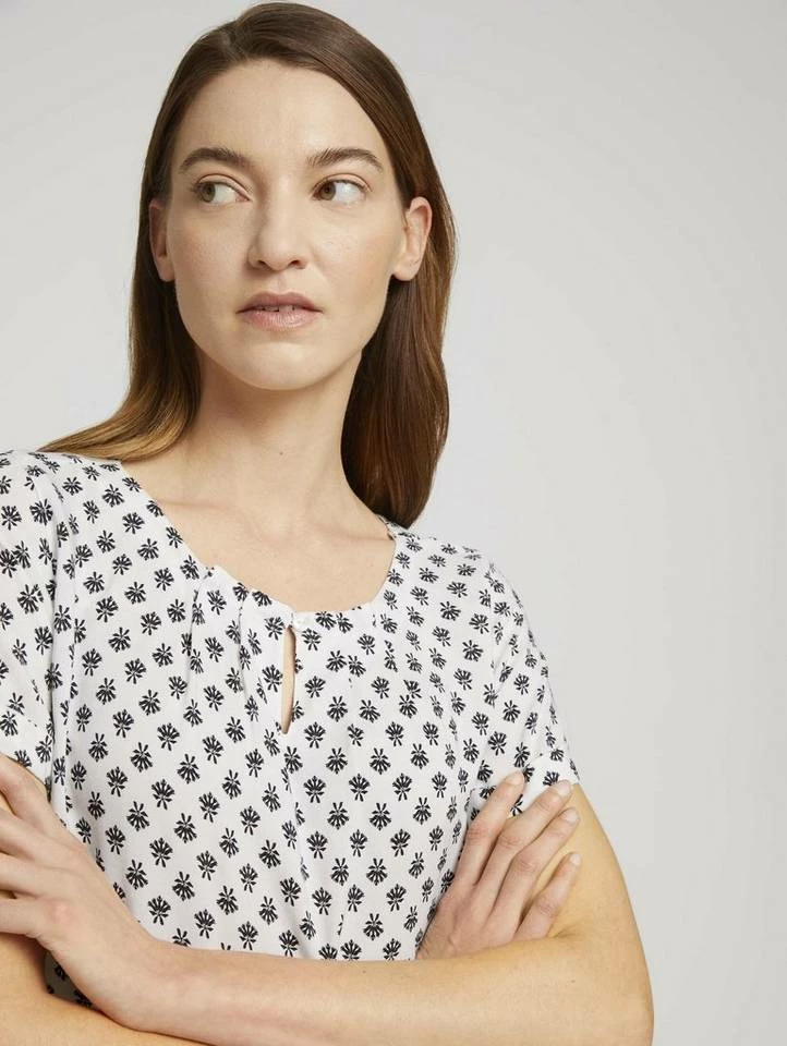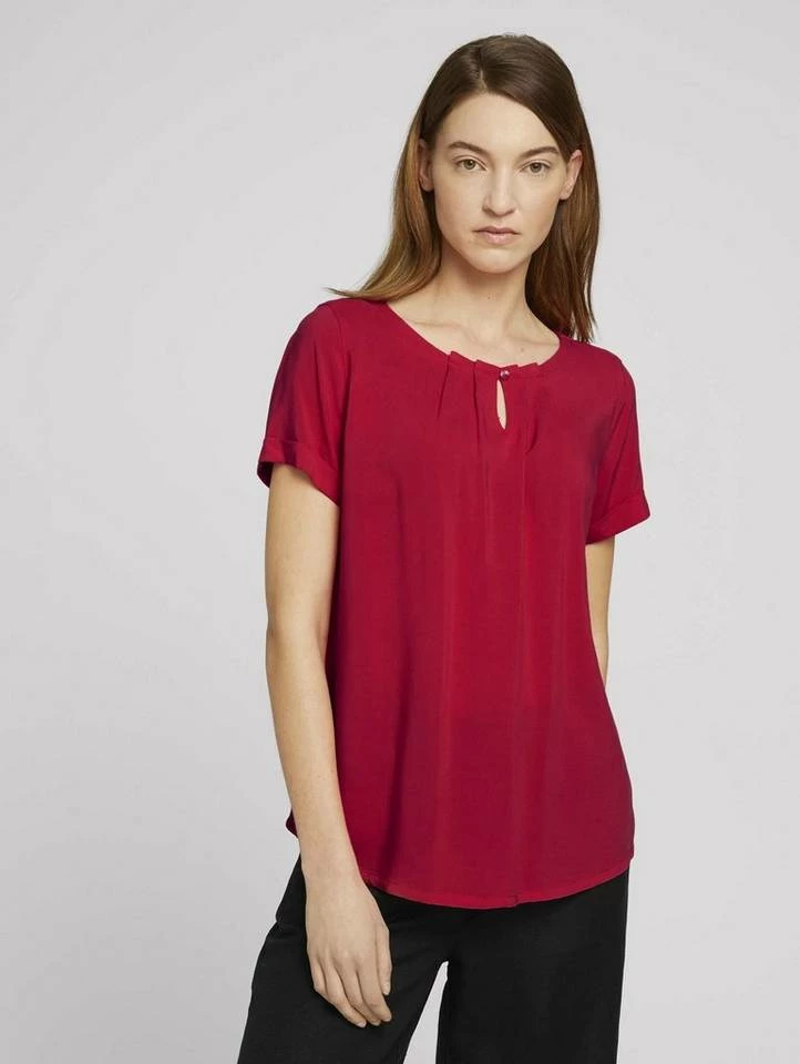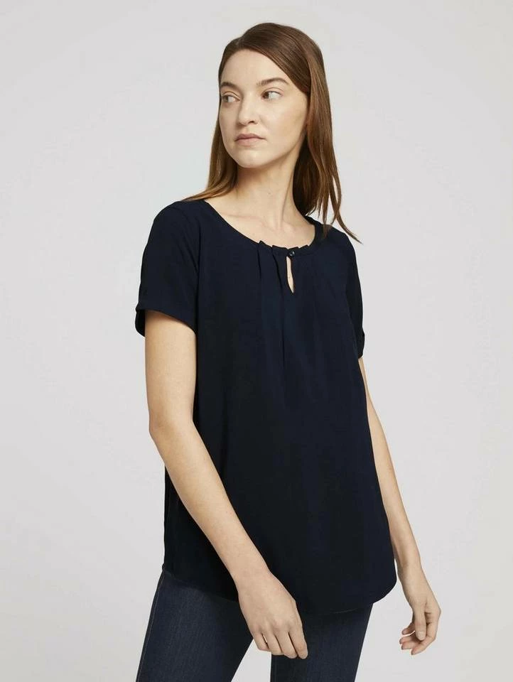 Kurzarmbluse mit Faltendetail für Frauen (kurzärmlig mit Rundhalsausschnitt und Knopfverschluss) aus fließender Viskose, Faltenlegung am Ausschnitt, fixierter Ärmelaufschlag