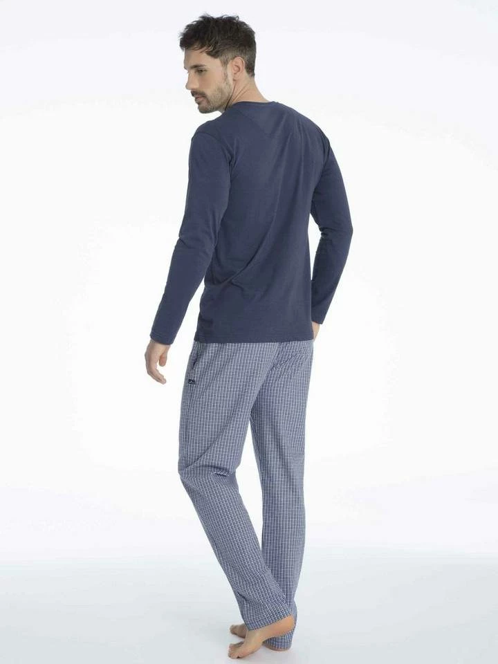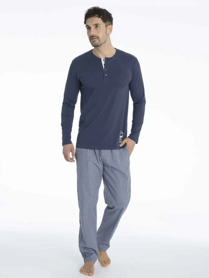 langer Pyjama für Herren Langarmshirt aus Single Jersey Rundhalsausschnitt mit Knopfleiste Logoprint an der Seite karierte Webhose seitliche Taschen Eingriff mit praktischer 1-Knopf Öffnung Gummibund mit Tunnelzug
