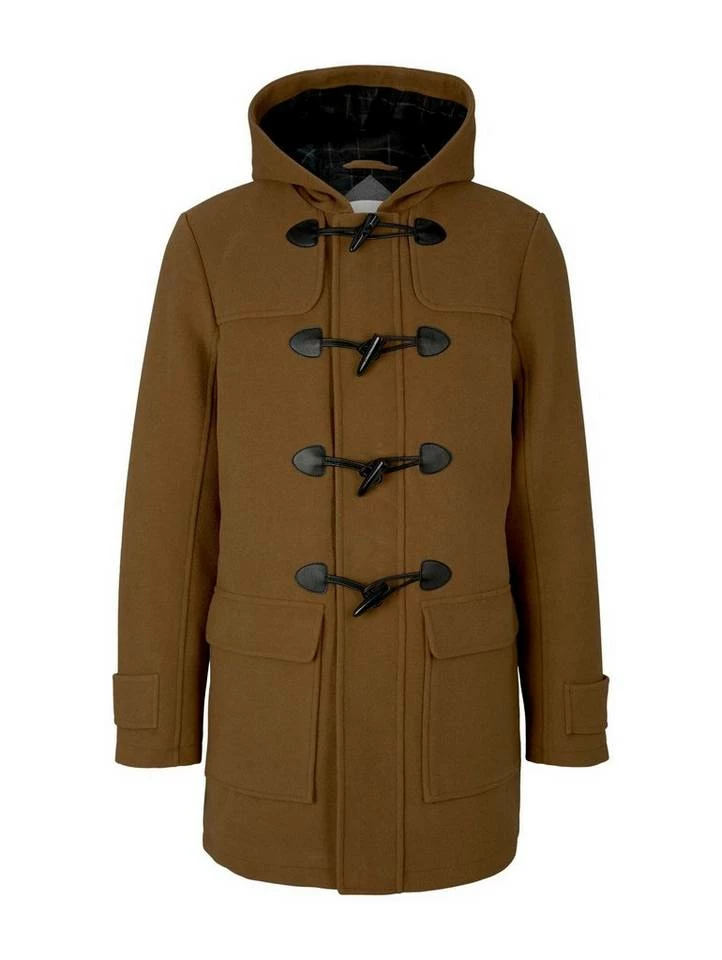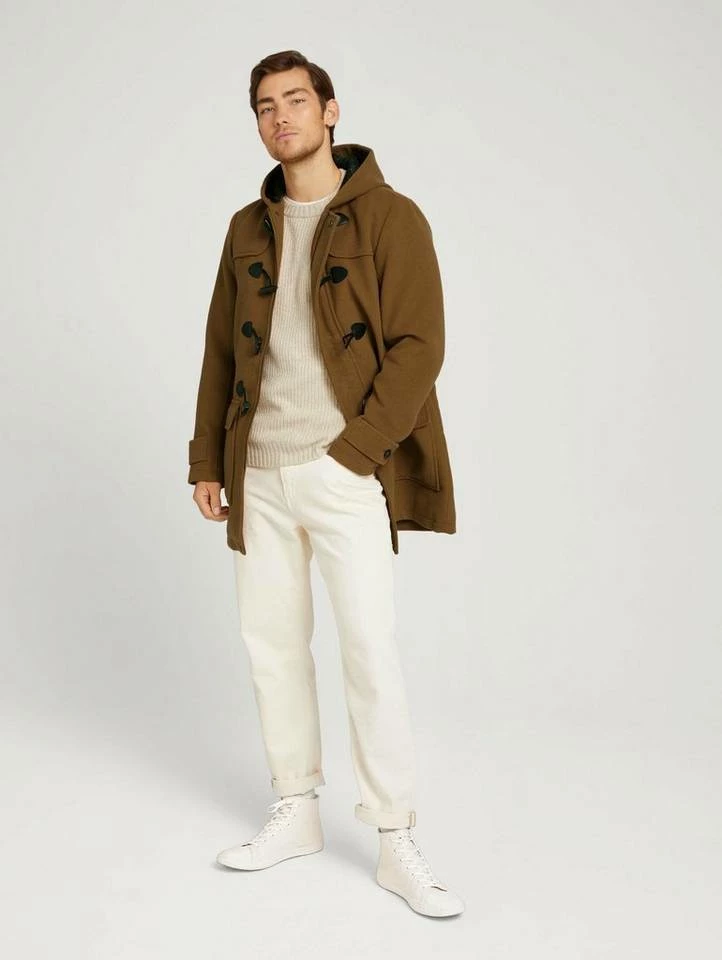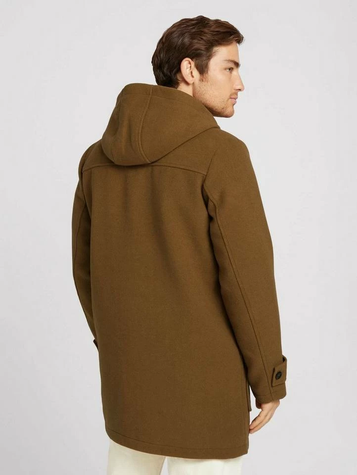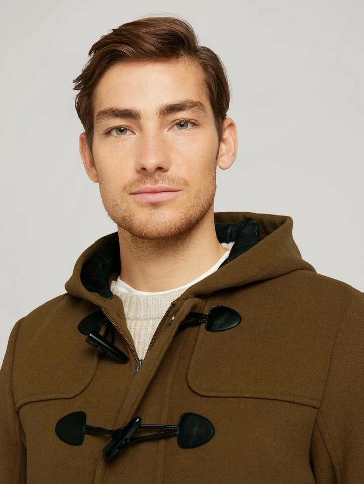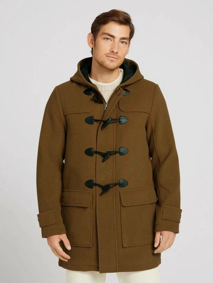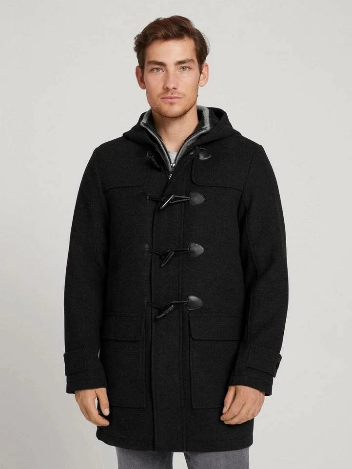 Dufflecoat Wollmantel für Männer (langärmlig mit Kapuze und Reißverschluss mit Knöpfen) mit weichem Wollanteil, Aufgesetzte Taschen auf der Front, mit dünnem Futter und Innentasche