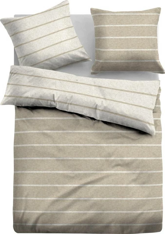 Im zeitlosen Streifen-Design begeistert die wohlig warme Melange-Flanell-Bettwäsche »SHADE« von TOM TAILOR. So gestalten Querstreifen in zwei Farben, die spiegelbildlich auf der Rückseite der Bezüge wieder zu finden sind, eine ansprechende Optik der weichen und kuscheligen Garnitur. Ein praktischer Reißverschluss ermöglicht ein schnelles und unkompliziertes Wechseln. Die Bettwäsche wird durch den Anteil von 60% recycelter Bamwolle, anstelle von reiner Baumwolle, mit weniger Wasser, Energie und Farbstoff hergestellt. Zudem ist die Bettwäsche hautfreundlich, pflegeleicht, trocknergeeignet, bügelfrei und einlaufsicher durch Sanforausrüstung. Made in Germany: die Melange Flanell Bettwäsche "SHADE" von TOM TAILOR im Streifen-Design.