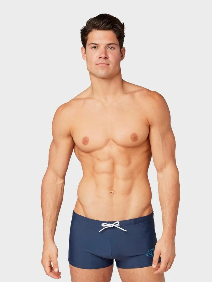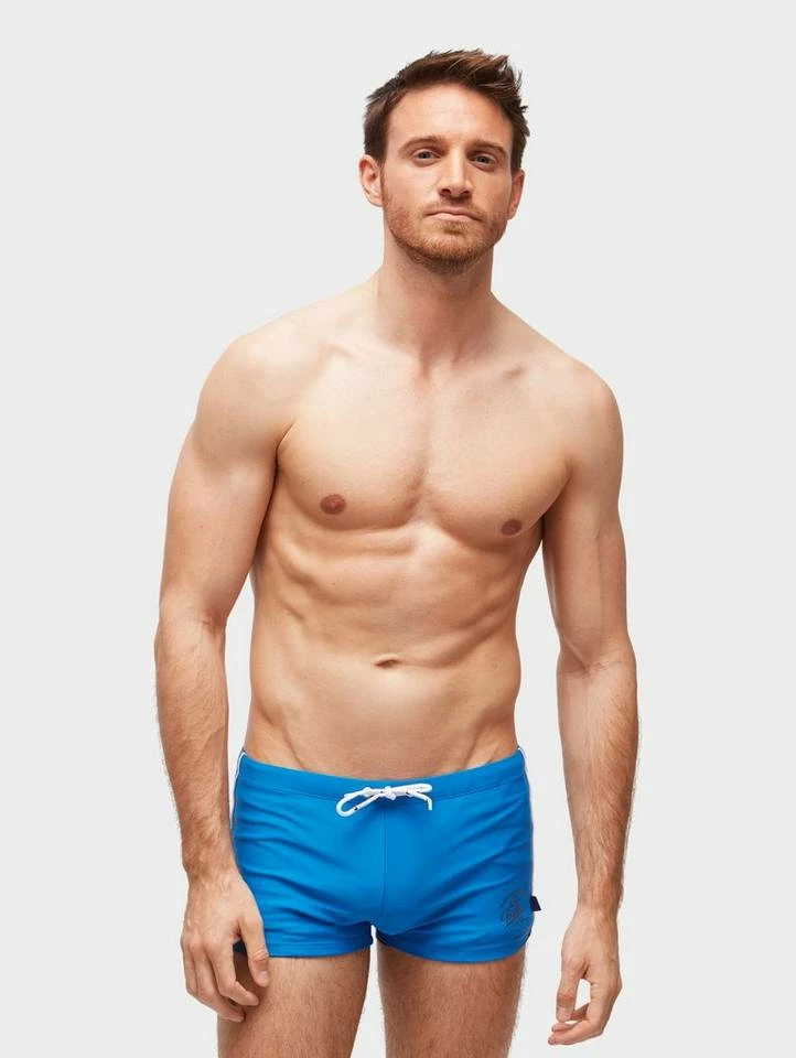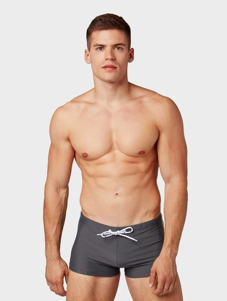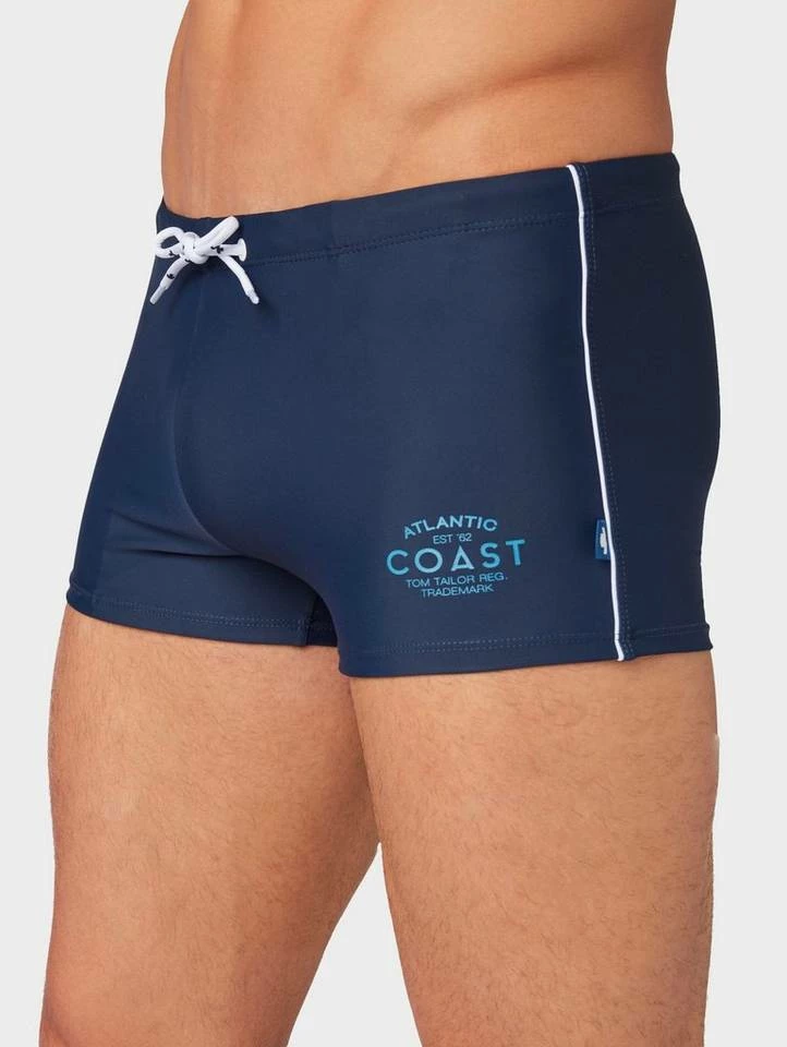 Badehose mit seitlichem Streifen für Männer (unifarben mit Print, elastischer Bund mit integriertem Kordelzug) aus Nylon mit Stretch-Anteil für den hohen Tragekomfort, mit kontrastfarbigen Streifen seitlich, mit Logo-Print vorne am Bein