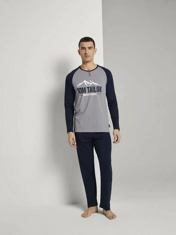 Langes Pyjama Set mit Print für Männer (langärmlig mit Rundhalsausschnitt) aus weicher und atmungsaktiver Baumwolle, Hose: Unifarben mit elastischem Bund, Set bestehend aus Langarmshirt und langer Hose, Shirt: Melange Optik mit Raglan Ärmeln und Brustprint