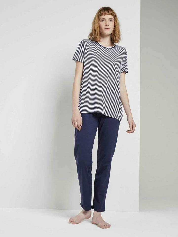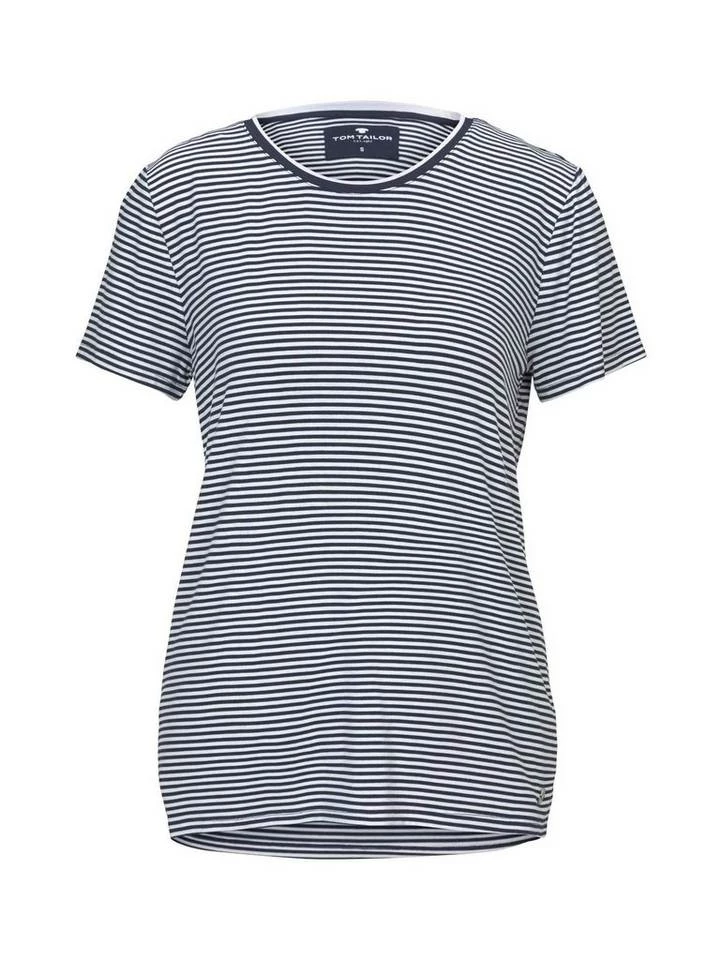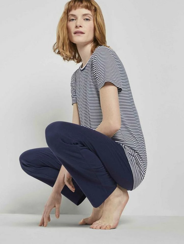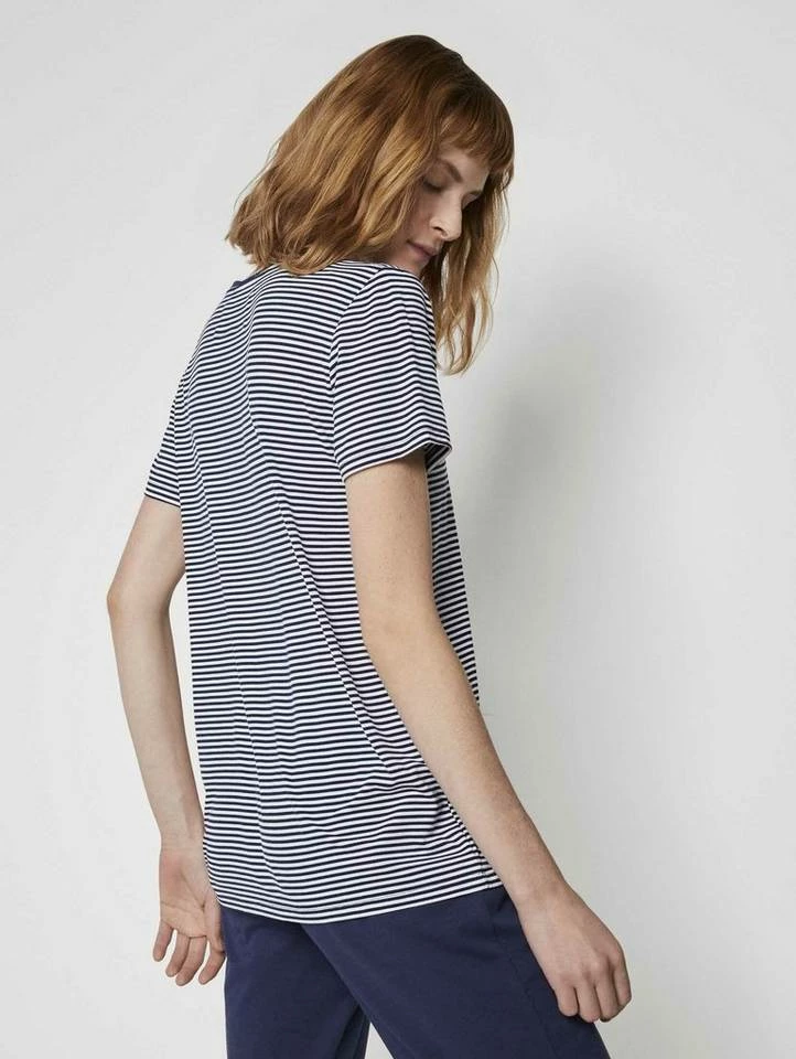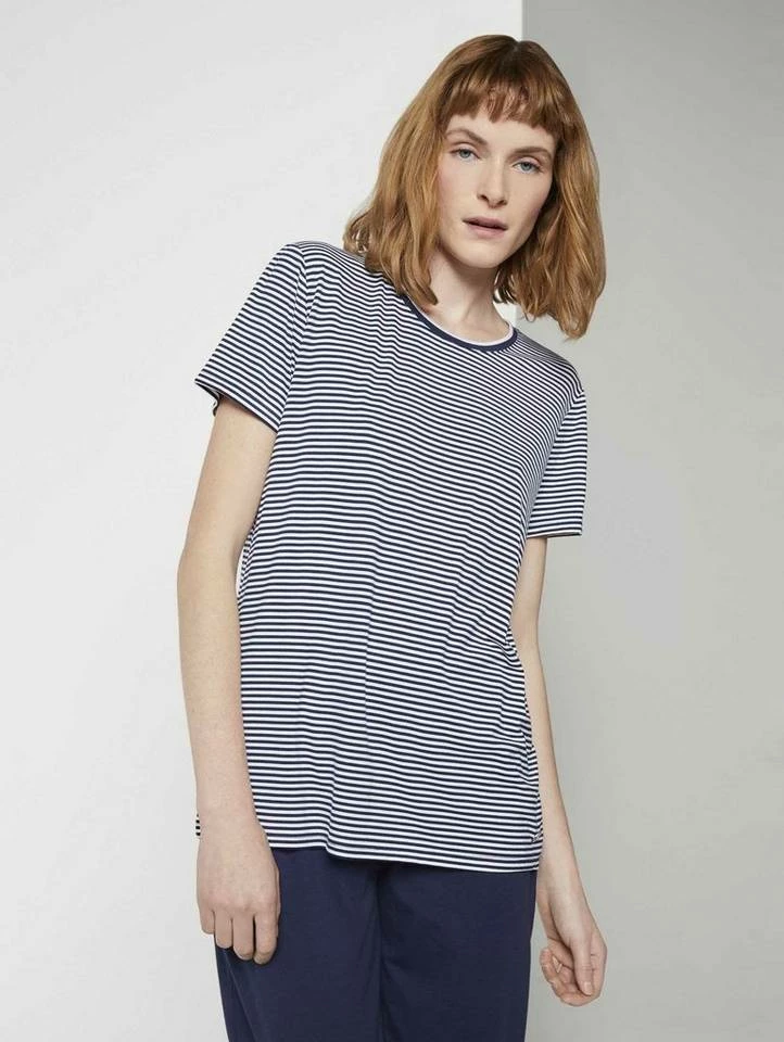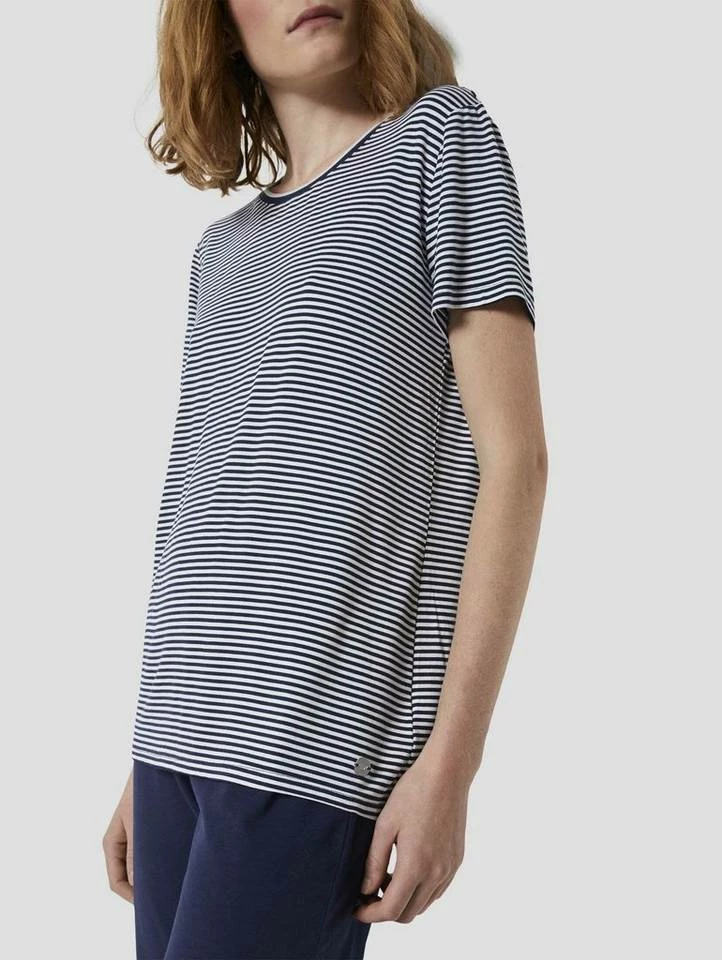 Kurzes Pyjama Oberteil mit Streifen für Frauen (kurzärmlig mit Rundhalsausschnitt) aus fließender Viskose, gestreift, mit Logo-Coin seitlich am Saum