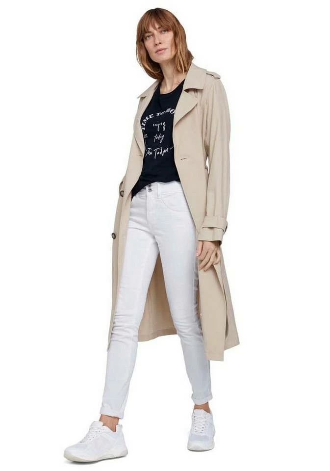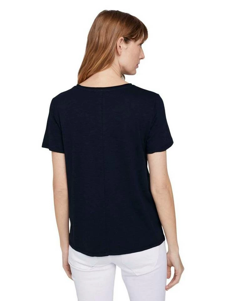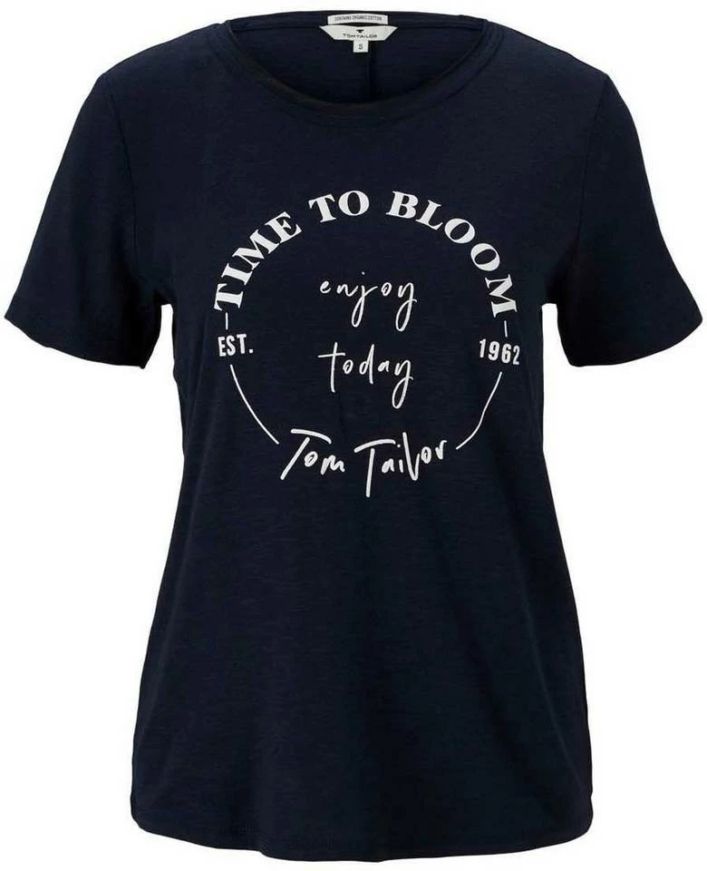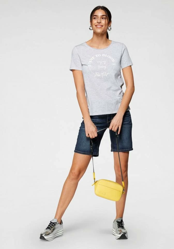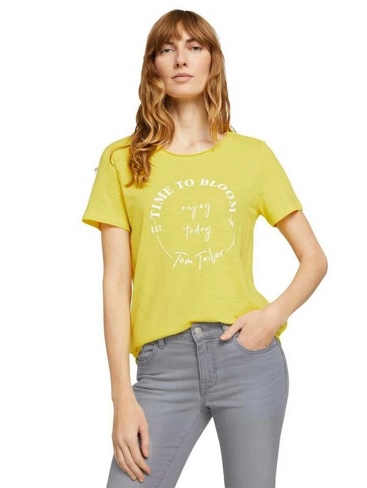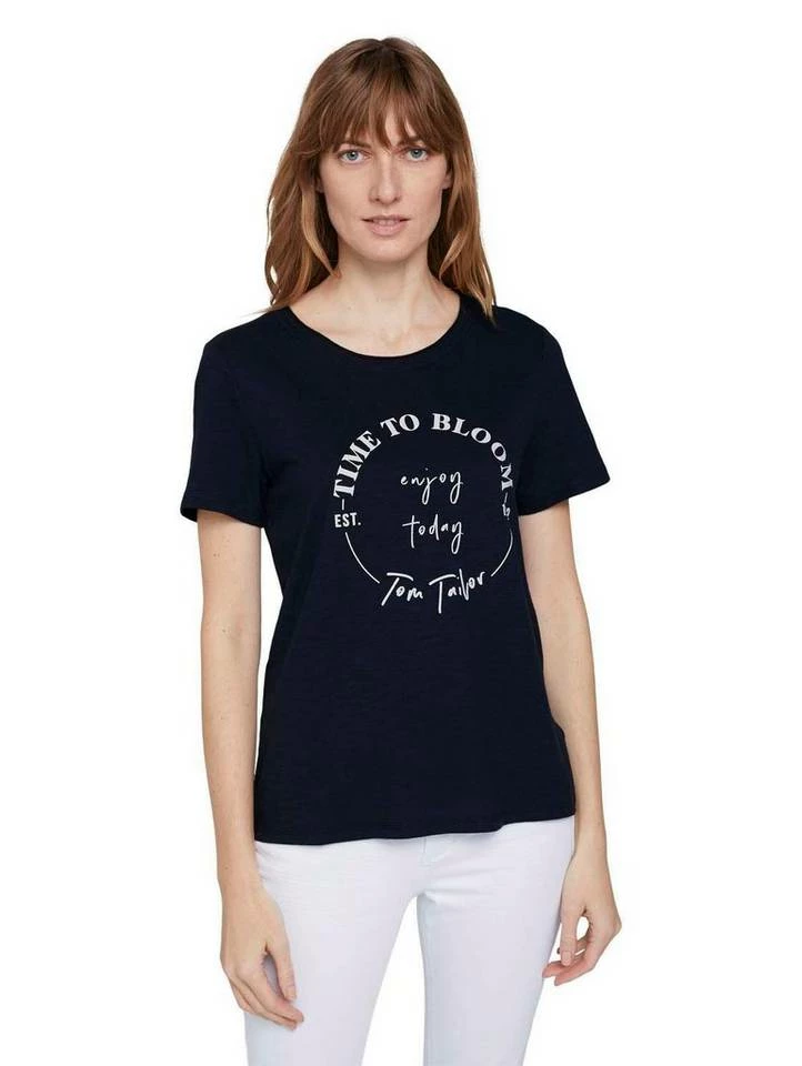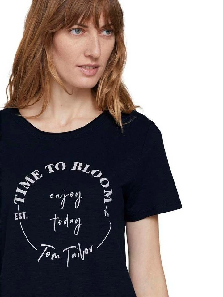 Das T-Shirt von Tom Tailor ist ein Basic mit coolem Touch. Es hat einen offenkantigen Rundhalsausschnitt und einen großen Schriftzugprint auf der Vorderseite. Die angenehme Jerseyqualität fühlt sich weich an und beschert dir den ganzen Tag lang ein entspanntes Tragegefühl. Du kannst das Shirt ganz unkompliziert mit einer Jeans- oder Strickjacke, deiner Lieblingsdenim und trendy Sneakers stylen. Mit dem T-Shirt von Tom Tailor fühlst du dich rundum wohl.