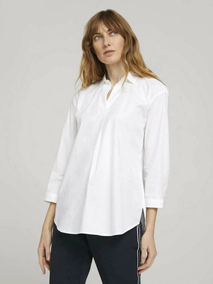 Popeline Bluse mit Knopfleiste am Rücken für Frauen (7/8 Arm mit Henley-Kragen) aus dehnbaren und atmungsaktivem Popeline, vertiefte Schulternähte, mit Faltenlegung am Ausschnitt vorne, kurze Seitenschlitze, mit Knopfleiste am Rücken
