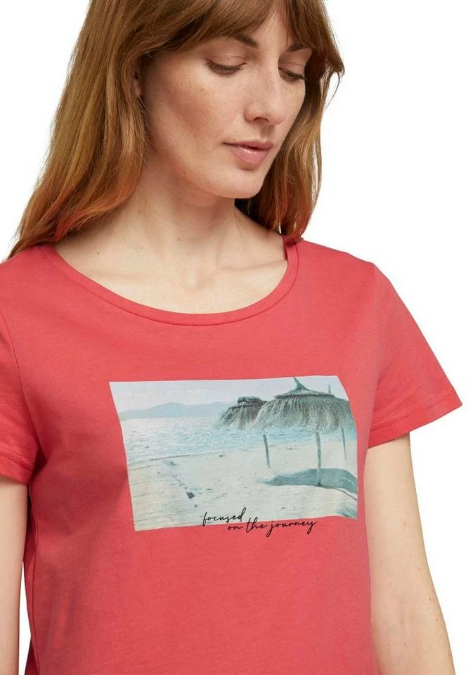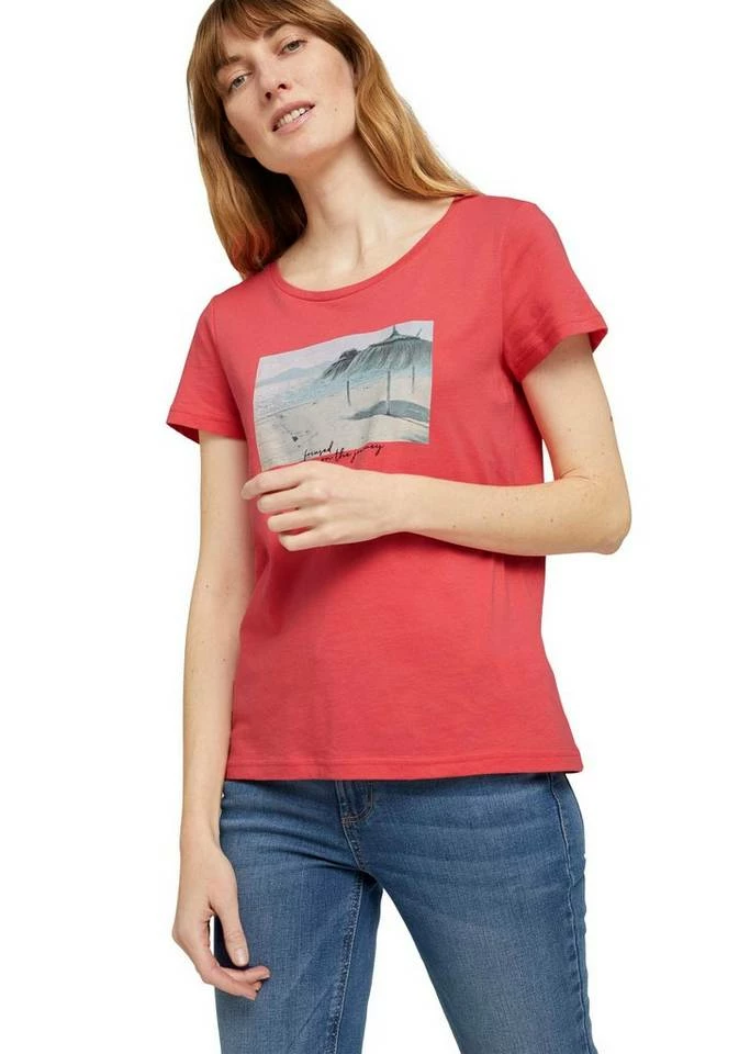 Mit dem Print-Shirt von TOM TAILOR stellst du im Handumdrehen ein neues Outfit zusammen. Mit dem Aufdruck sieht es sowohl locker als auch frisch aus. Dieses Shirt hat einen Rundhalsausschnitt mit eingefasster Kante und ist hüftlang sowie figurbetont geschnitten, sodass es deine Silhouette schön betont.