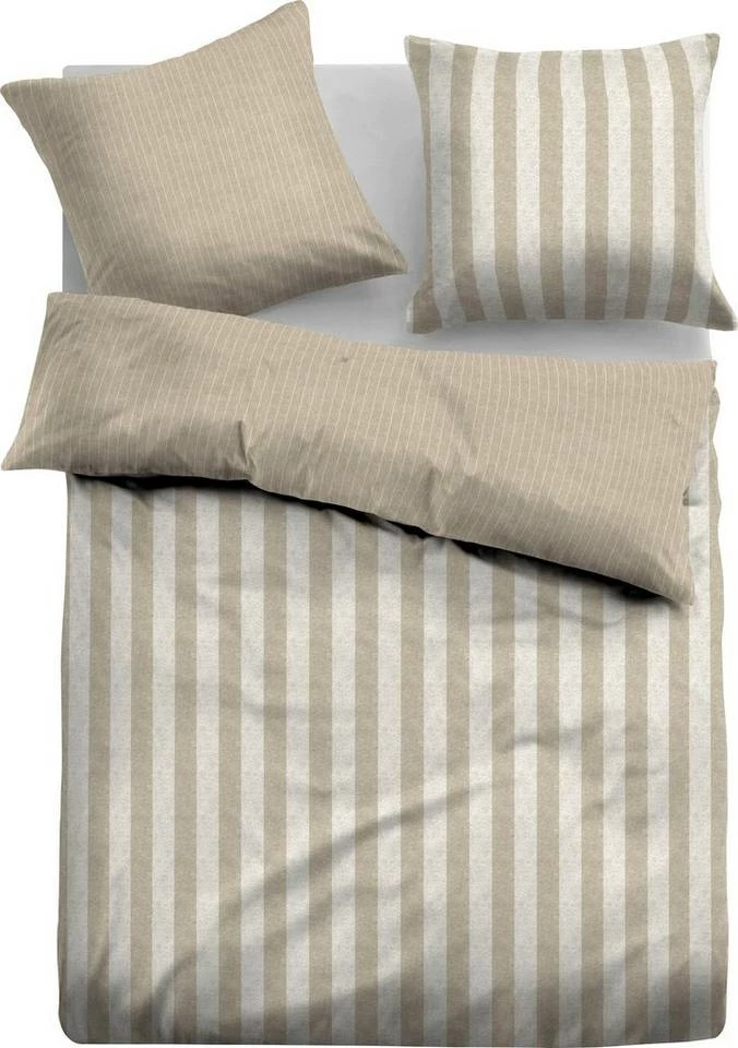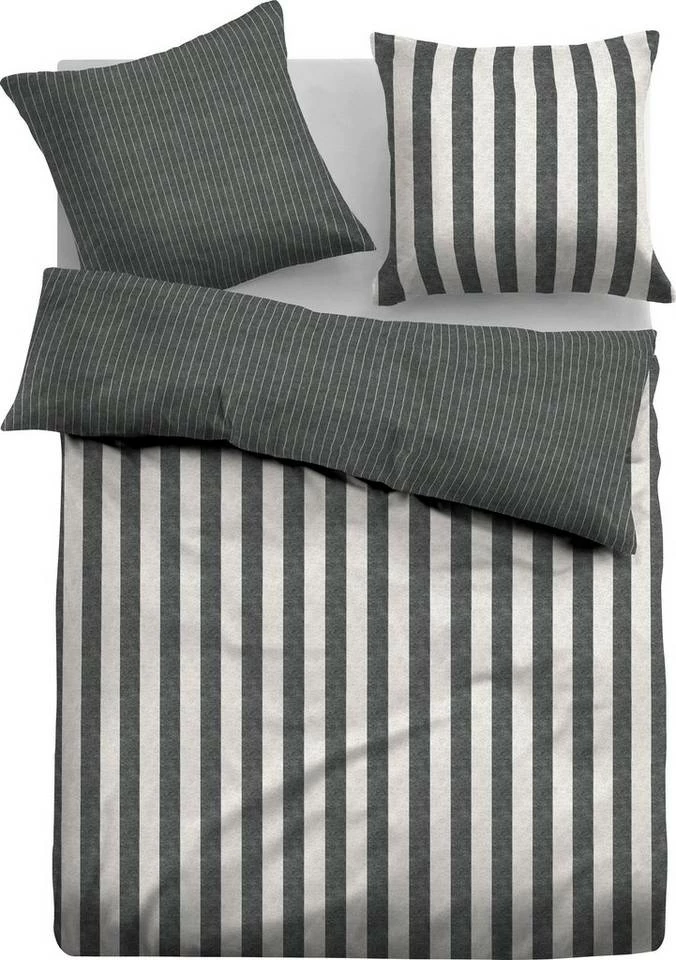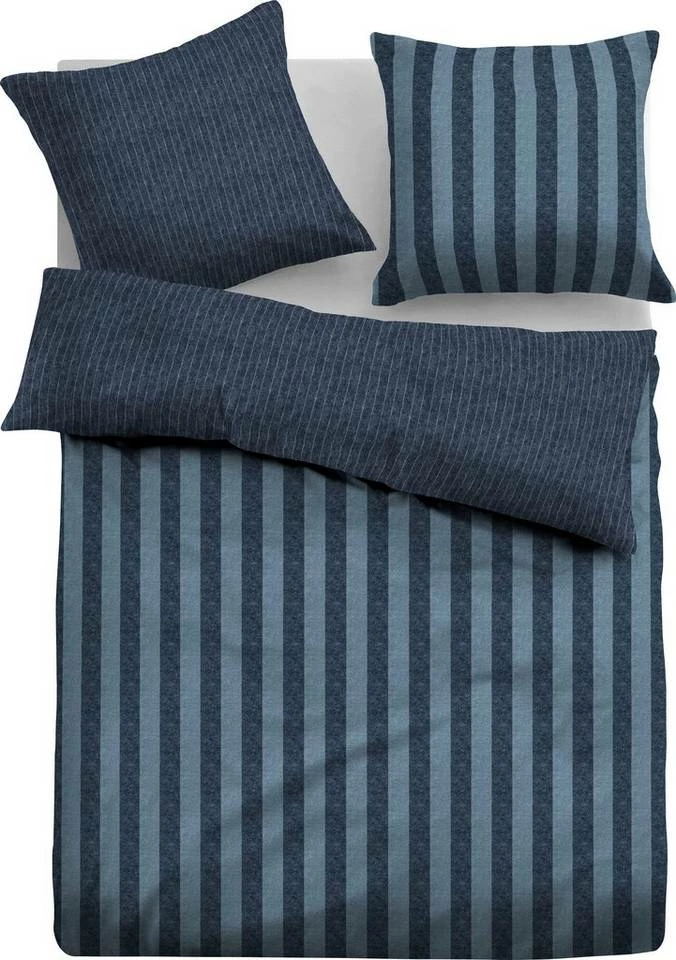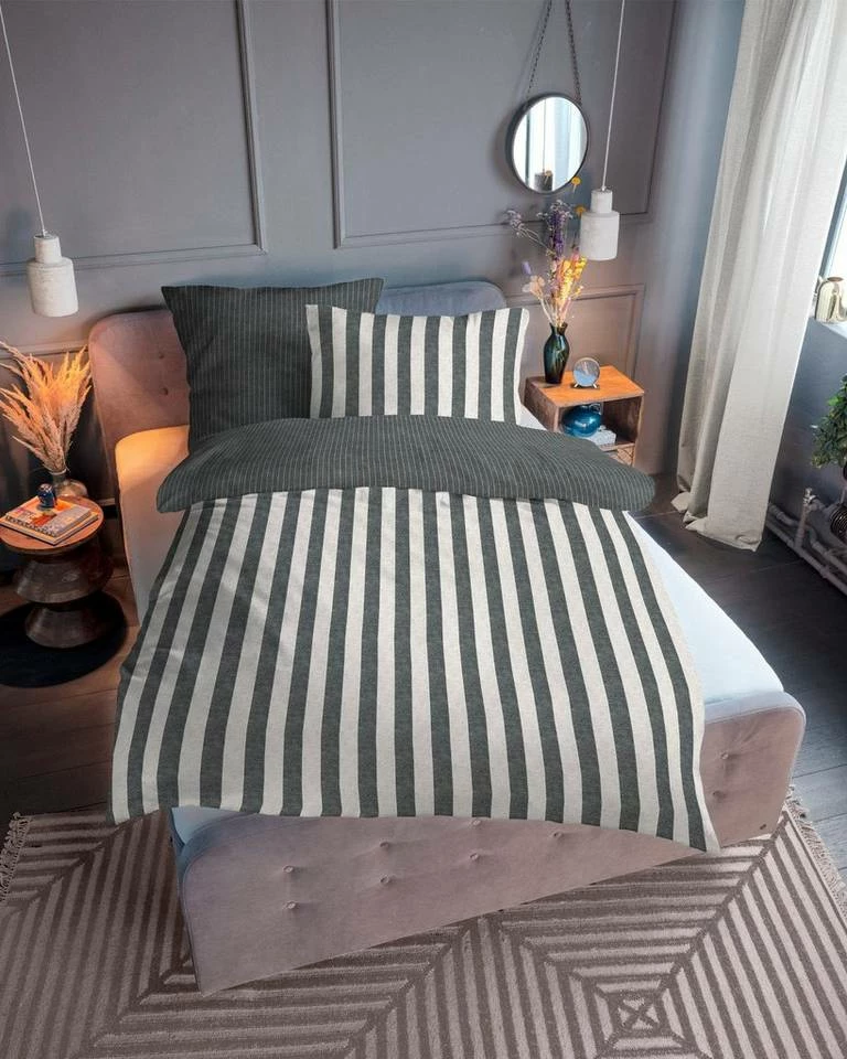Für Gemütlichkeit "made in Germany" sorgt die kuschelige und wohlig warme Flanell Bettwäsche »MATTEO«. Ihre tollen breiteren Streifen auf der Vorderseite und die schmalen Streifen in aktuellen Farben auf der Rückseite macht die Bettgarnitur zum Hingucker im jedem Schlafraum. Die Melange-Bettwäsche ist hautfreundlich, fühlt sich angenehm weich an und unterstützt einen erholsamen Schlaf. Durch den Anteil von 60% recycelter Baumwolle, anstelle von reiner Baumwolle, wird "MATTEO" nachhaltig produziert, da weniger Wasser, Energie und Farbstoff benötigt werden. Zudem punktet sie mit pflegeleichten Eigenschaften, wie Maschinenwaschbarkeit bei 60°C und Trocknereignung. Bügeln ist nicht notwendig. Reißverschlüsse erleichtern das schnelle Wechseln nach jeder Wäsche. Die attraktive TOM TAILOR Bettwäsche »MATTEO« mit aktuellen Streifen sorgt für mehr Gemütlichkeit im heimischen Schlafzimmer.
