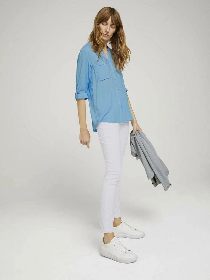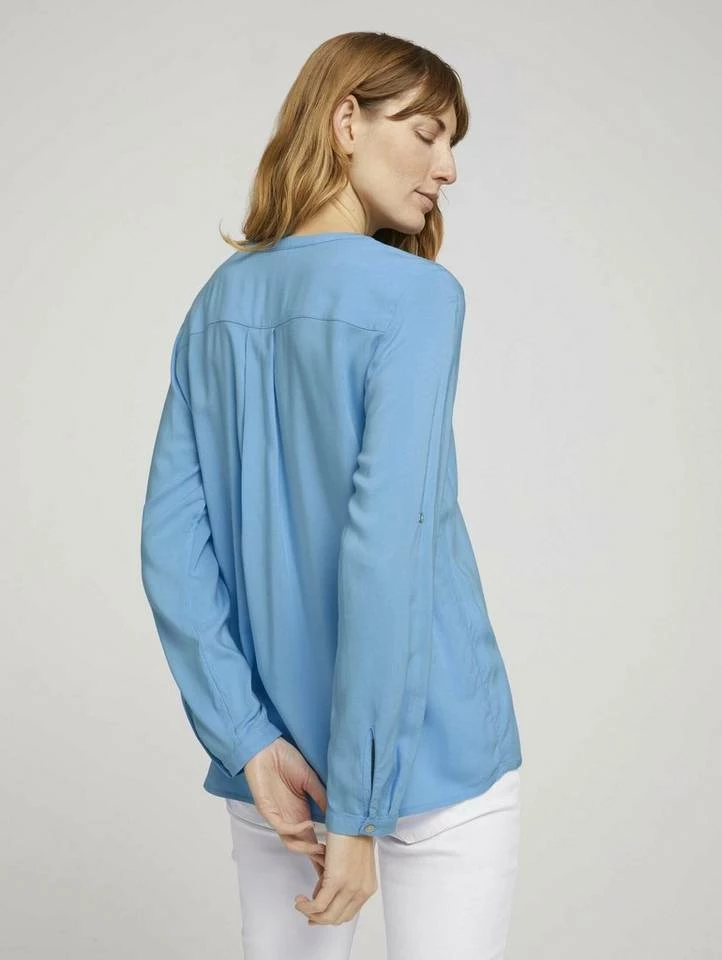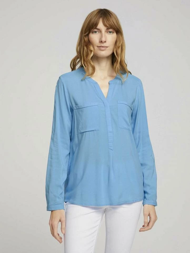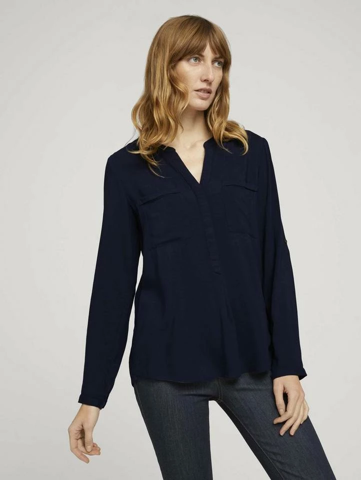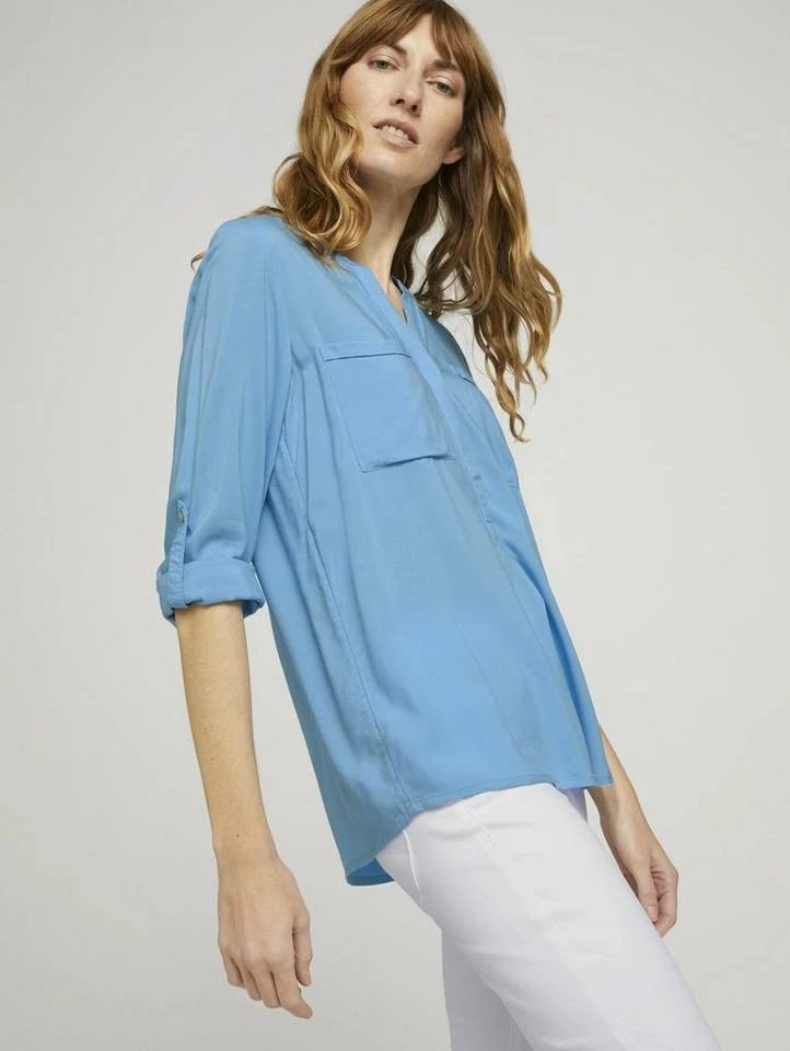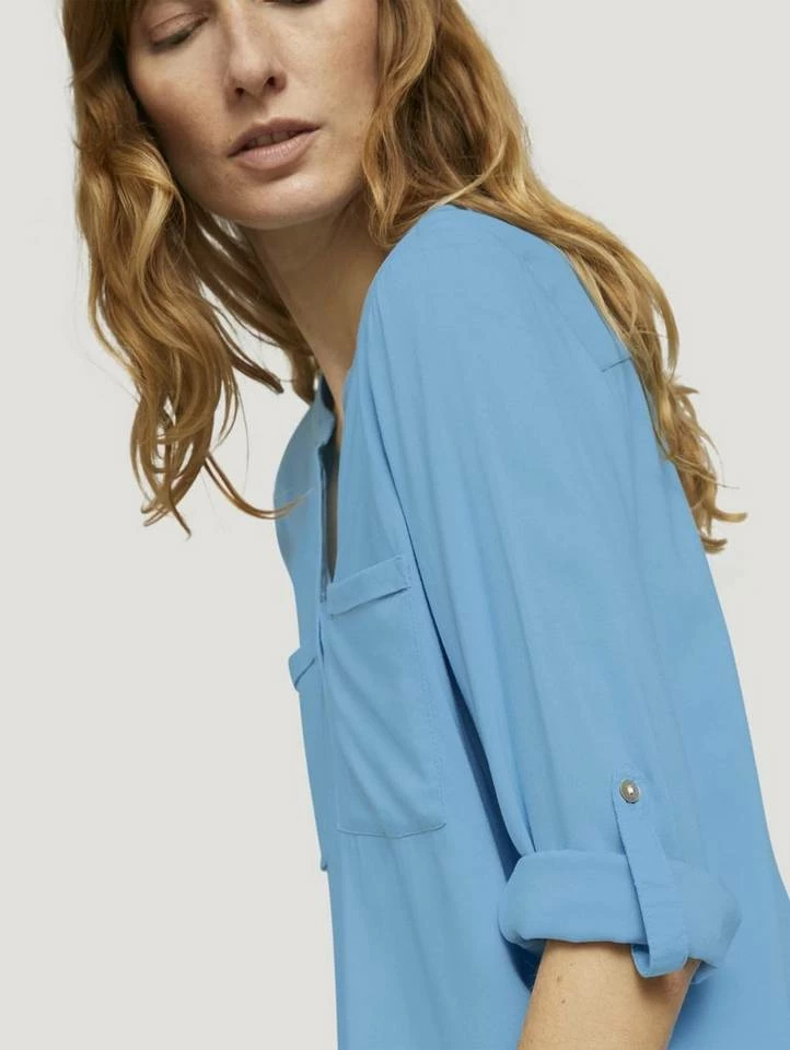 Tunikabluse mit Turn-Up Ärmeln für Frauen (3/4 Arm mit Rundhalsauschnitt und falscher Knopfleiste) aus fließendem, leicht transparentem Gewebe, Lange Ärmel mit Turn-Up-Option, Unifarben, mit aufgesetzten Brusttaschen, mit feinen Faltendetails