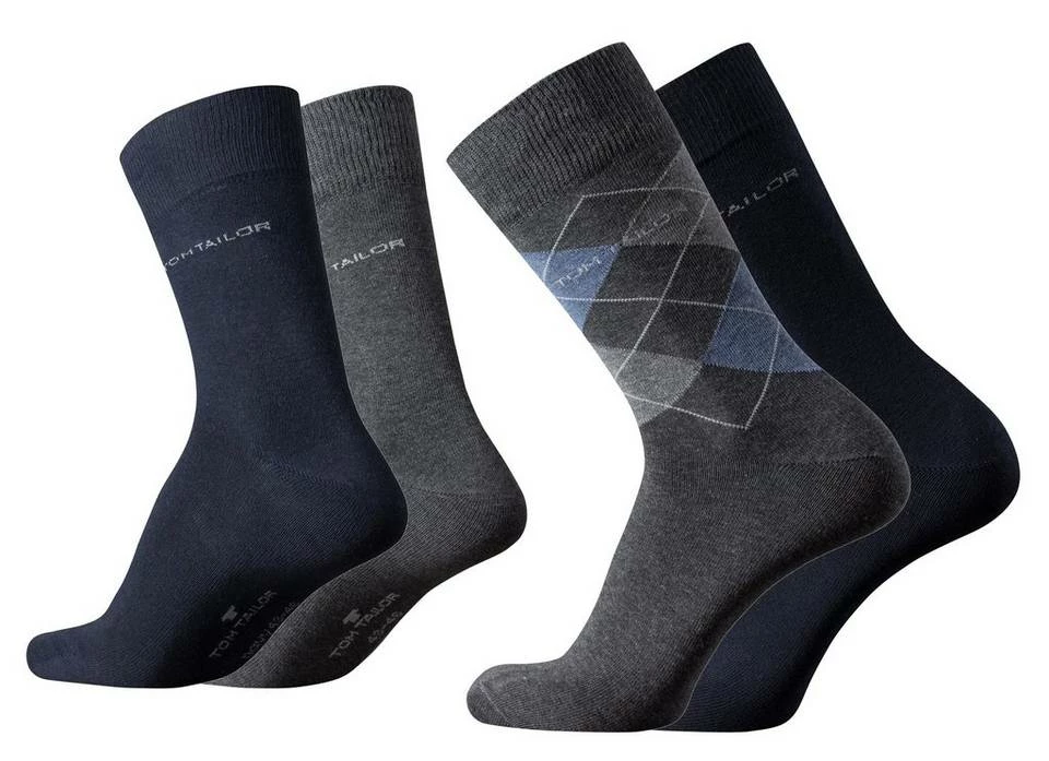 Für alle, die täglich über sich hinauswachsen und dabei immer sie selbst bleiben.Die das Gute im Leben suchen und finden.Für alle, die mutig sind und andere ermutigen. Die selbst Farbklecks sind, wenn die Nachrichten auch tiefschwarz sind.Für alle, die mittem im Leben stehen und mit ihrer Lebensfreude anstecken, gibt es nur eine richtige Entscheidung. TOM TAILOR ist bunt wie das Leben selbst!!!Tom Tailor Herren Socken 4er Pack Argyle (1Paar) + 3 Paar uni basic anthrazit und dunkelblau mit dem markentypischen Schriftzug am Schaft. Der hohe Baumwollanteil sorgt für eine perfekte Passform und ein bequemes Tragegefühl.