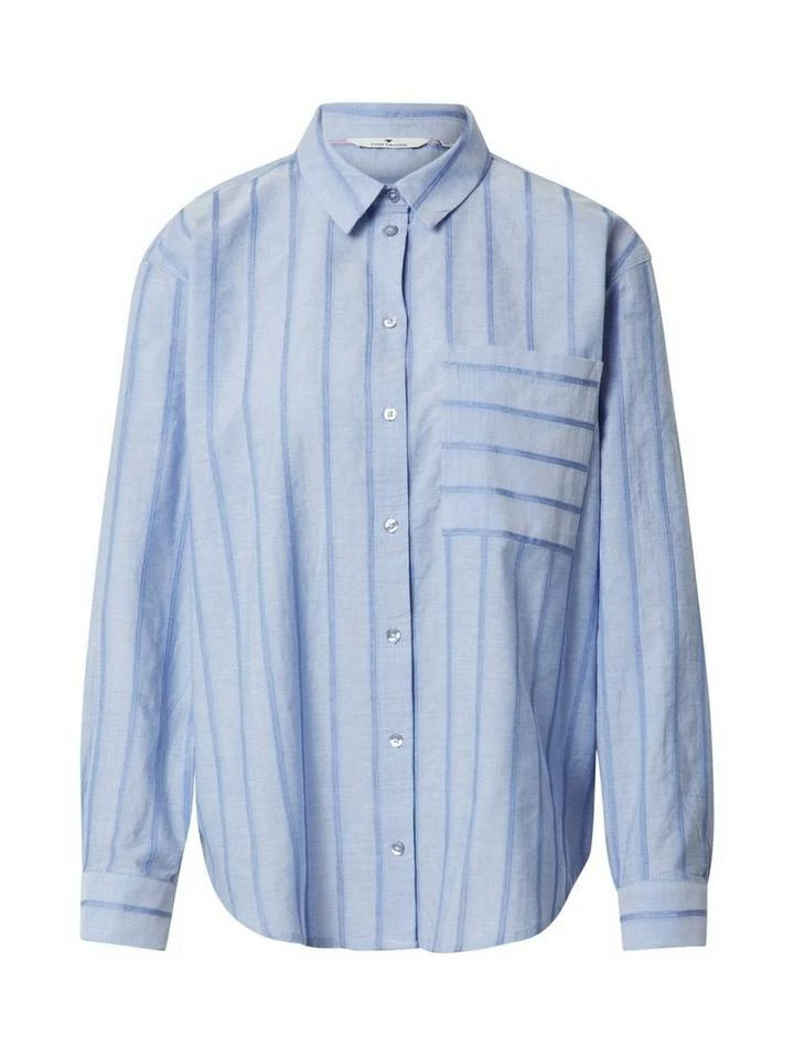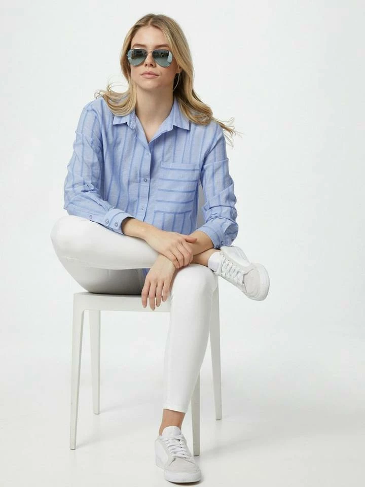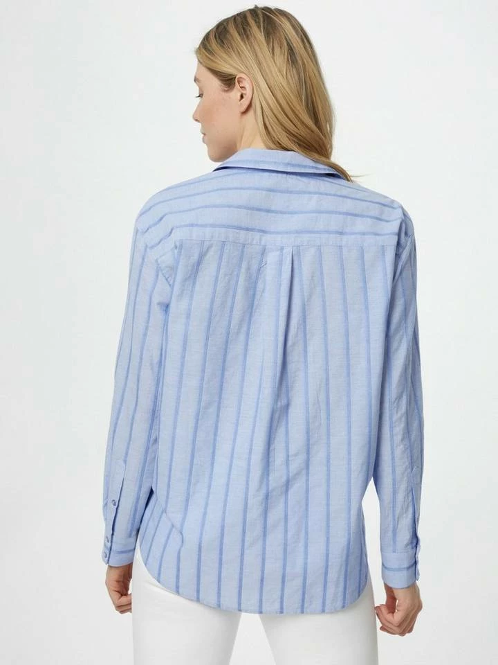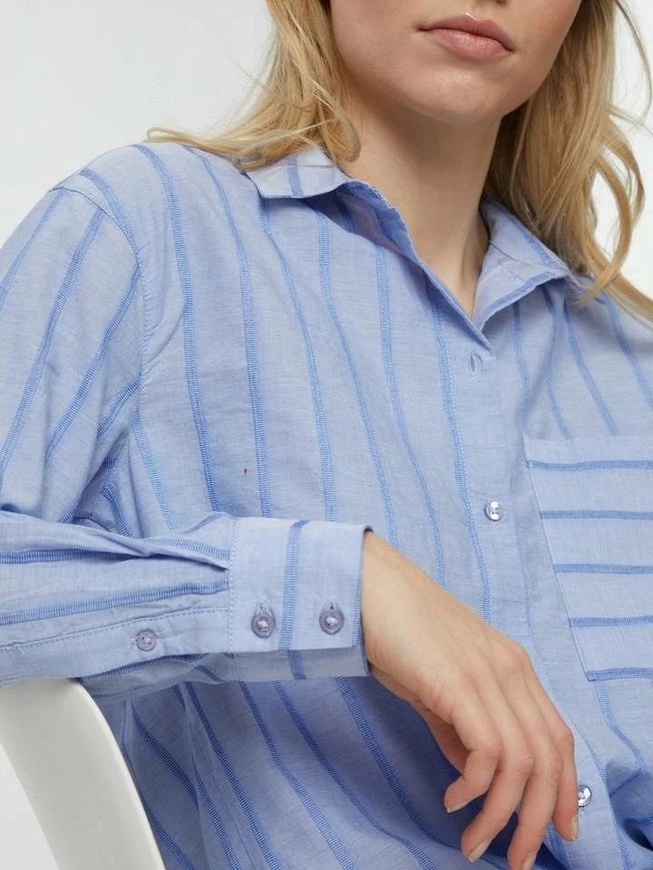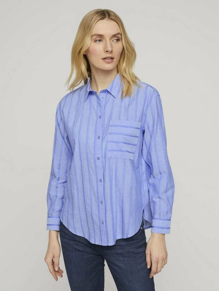 gestreifte Hemdbluse für Frauen (langärmlig mit Kentkragen und Knopfleiste) aus texturierter Baumwolle, gestreift, mit aufgesetzter Brusttasche, mit Seitenschlitz