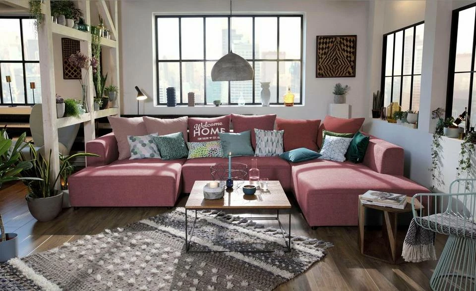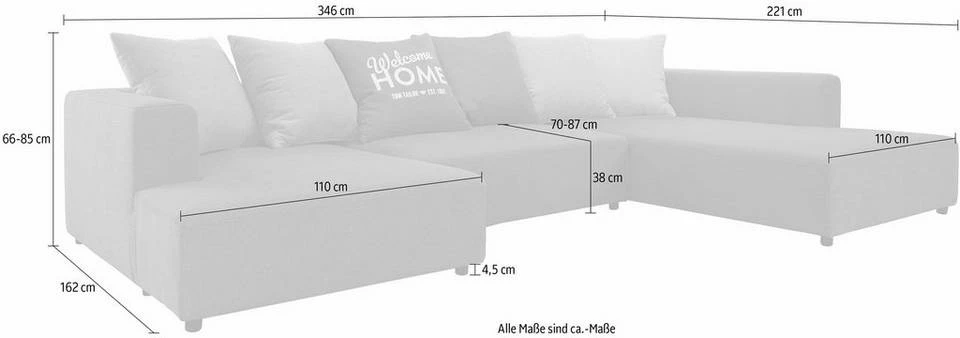 | Hinweis Lieferumfang | Inklusive Kissenset U: Bestehend aus 6 Rückenkissen, davon 1 Kissen mit »Welcome HOME« Flockdruck Zierkissen nicht im Lieferumfang enthalten |