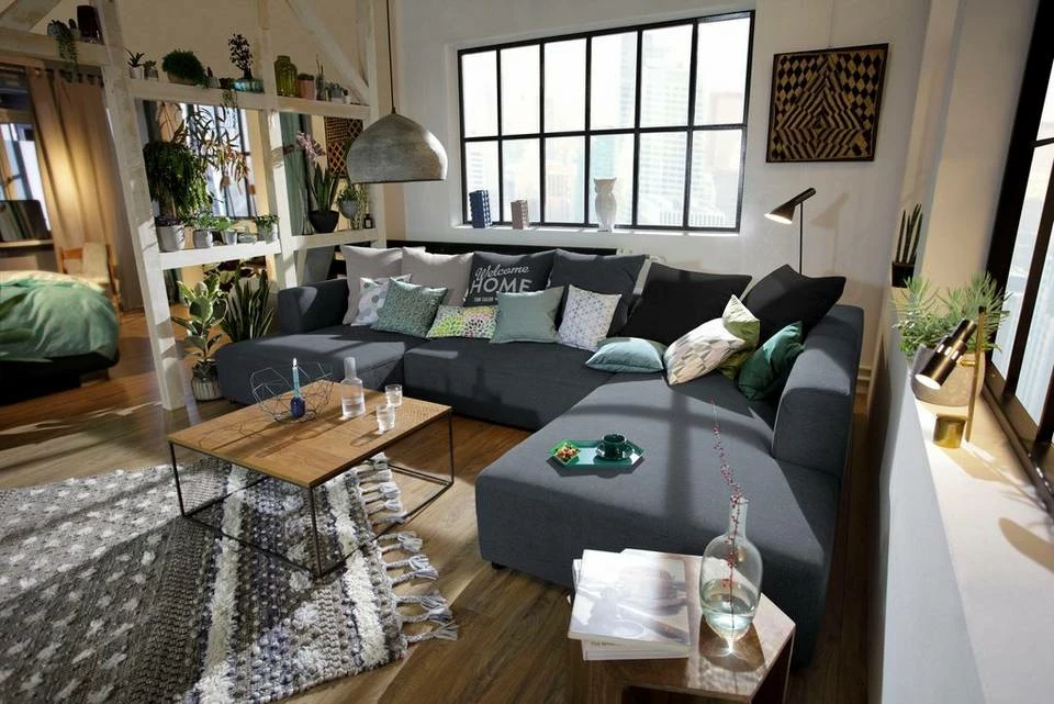- Moderne Wohnlandschaft mit farblich abgesetzten Rückenkissen