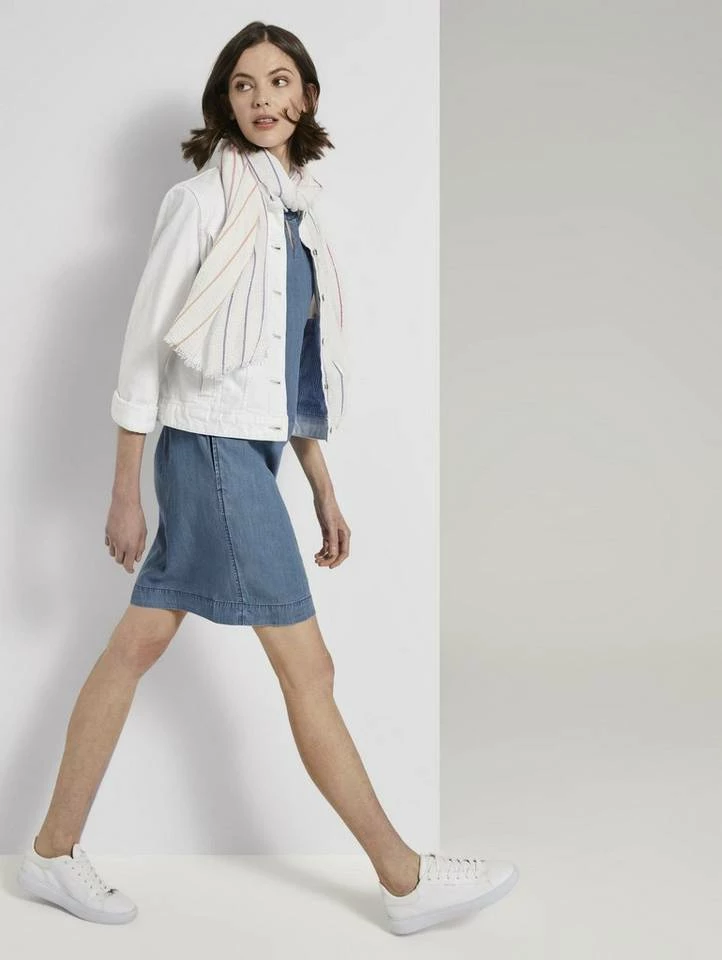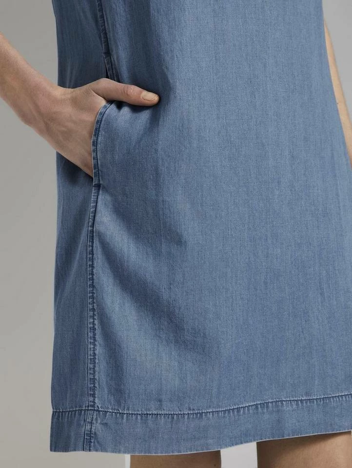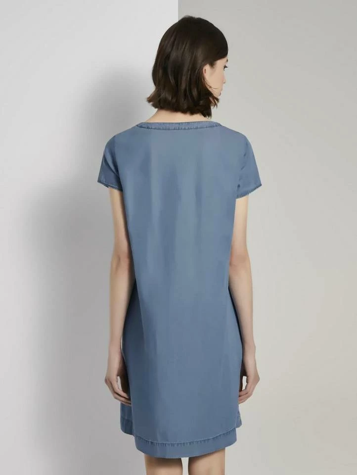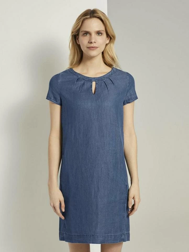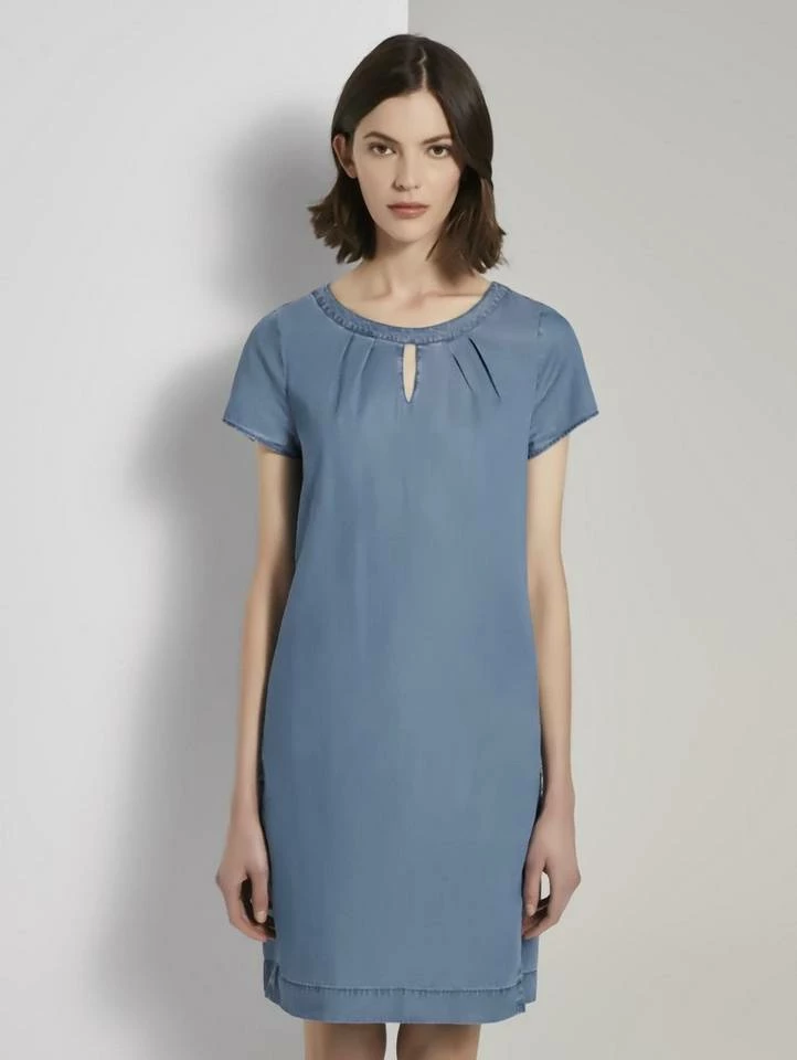 Lyocell T-Shirt-Kleid im Jeanslook für Frauen (kurzärmlig mit weitem Rundhalsausschnitt) aus Lyocellgemisch, mit Weichwaschung für ein angenehmes Tragegefühl, mit vorvelegten Seitennähten und zwei eingeschnittenen Taschen, mit Faltenlegung und Cut-Out am Ausschnitt