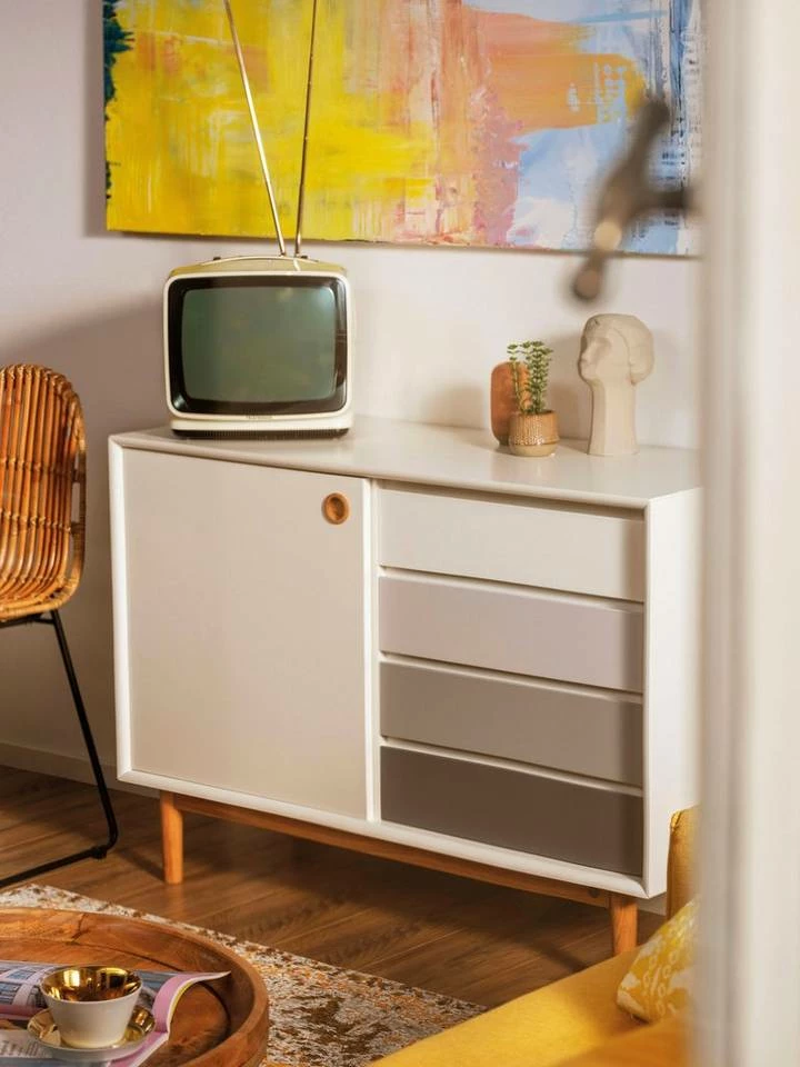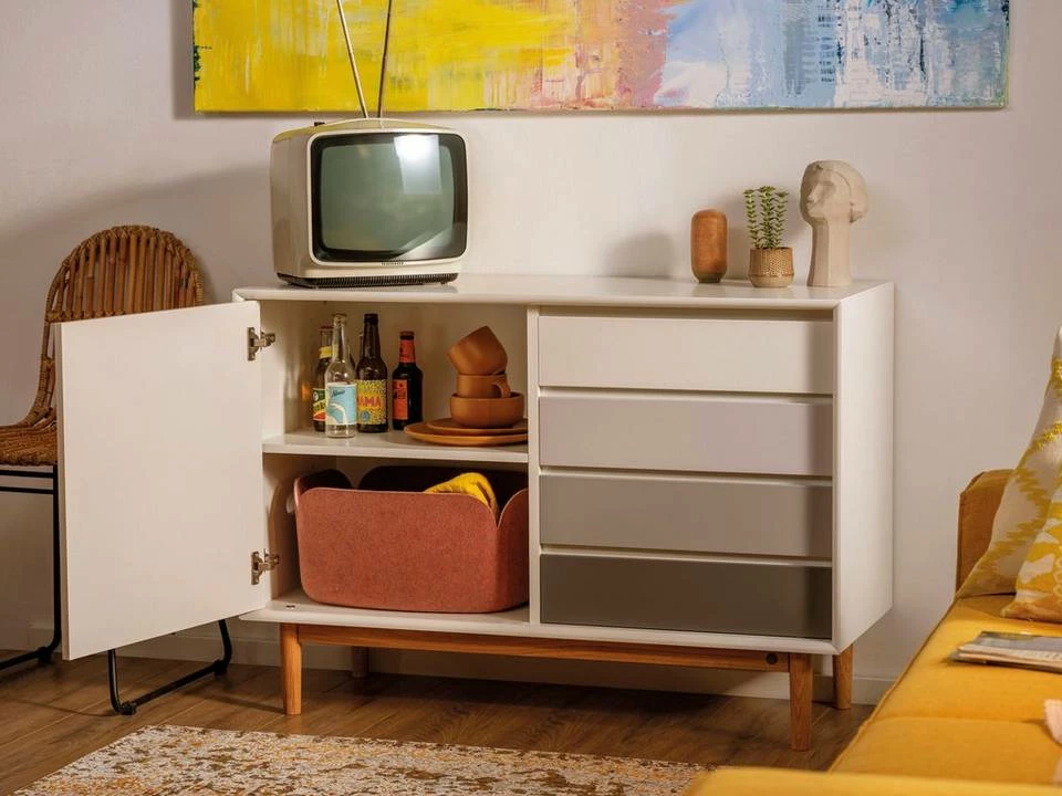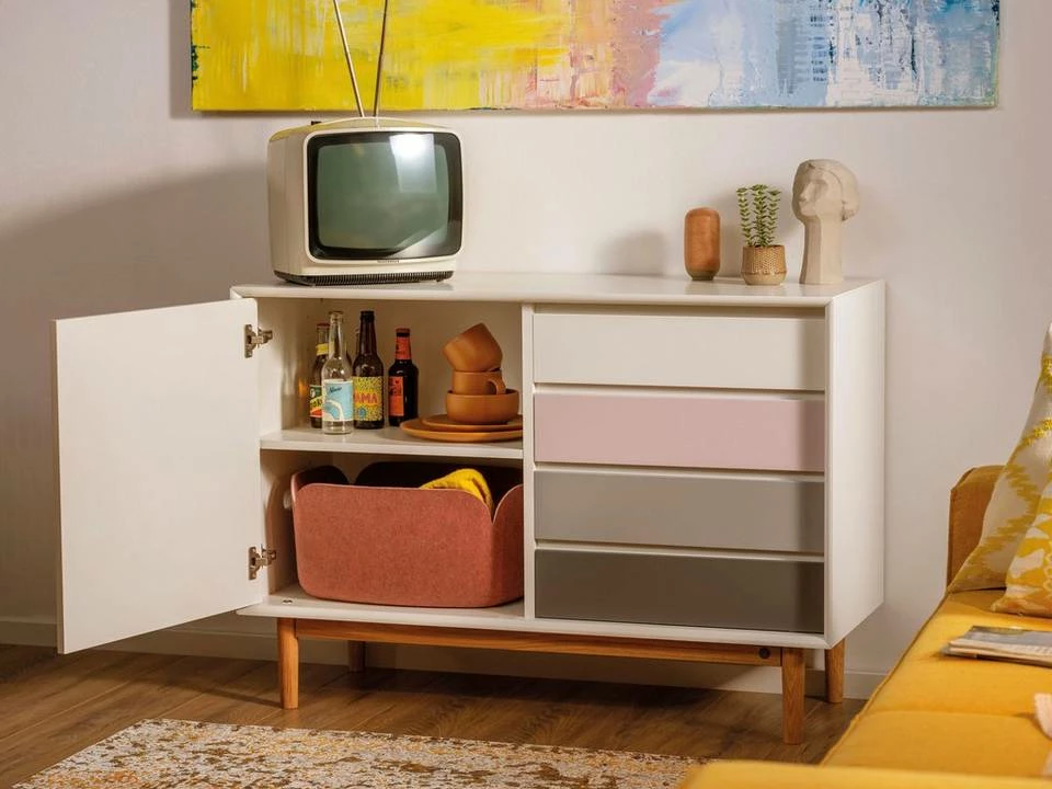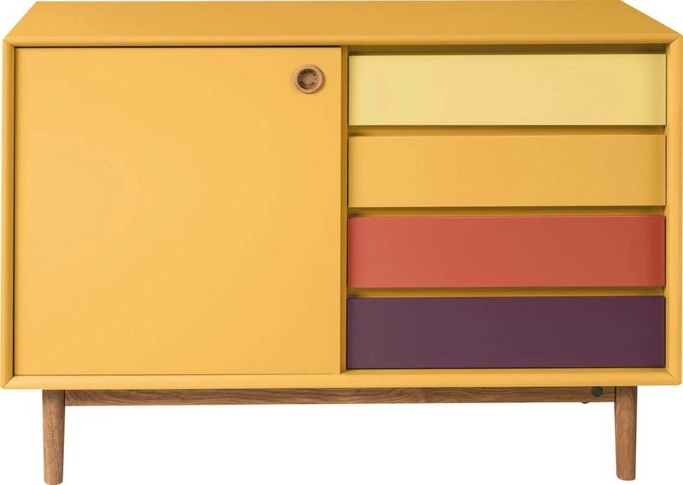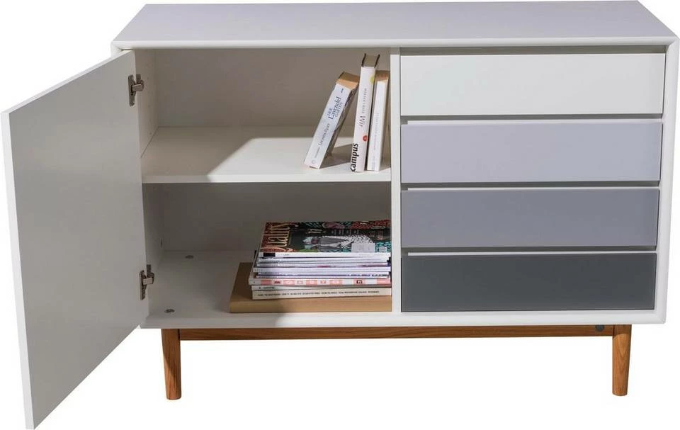 Zieht sämtliche Blicke im Wohnraum auf sich: Das in Schweden gefertigte Sideboard »COLOR BOX« von TOM TAILOR in stilvoller Optik. Es verfügt über einen dekorativen Knopfgriff und begeistert durch attraktive Schubladenfronten in unterschiedlichen, harmonischen Farben. Ausgestattet ist die edle Kommode zudem mit Füßen in Eiche-Massivholz. Da sie in mehreren Farben bestellbar ist, fügt sie sich in unterschiedlichste Einrichtungen ein. In ihren Schubladen sowie hinter der Tür bietet die Anrichte jede Menge Stauraum, ob für Bücher, Unterlagen oder Wohnaccessoires. Für ein leises und materialschonendes Schließen ist sie mit einer funktionalen Soft-Close-Funktion versehen. Der Knopfgriff fügt sich ideal in die bestehende Optik ein. Für die Herstellung des Schranks kommen ausschließlich Materialien in hochwertiger Qualität zum Einsatz. Schafft ein modernes Wohnambiente in den heimischen vier Wänden: das Sideboard »COLOR BOX« von TOM TAILOR im edlen Design.