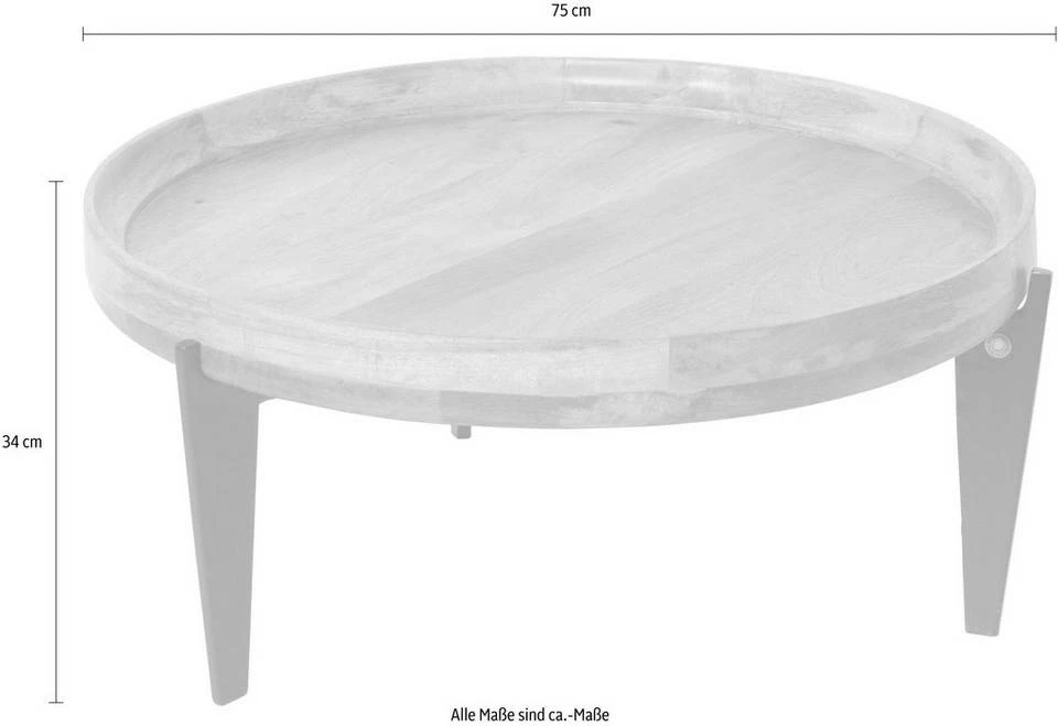 Der runde Couchtisch »T-TRAY TABLE LARGE« aus dem Hause TOM TAILOR begeistert durch seine ausgefallene Konstruktion mit integriertem Tablett. Die Tischplatte liegt auf dem Fußgestell auf und kann bei Bedarf als formschönes Tablett verwendet werden. Der nach innen gewölbte Rahmen bietet dafür eine großzügige Grifffläche und verhindert zugleich das Gegenstände herunterfallen. Aus FSC®-zertifiziertem Mangoholz gefertigt besticht die Servierplatte durch die gut sichtbare Maserung und den warmen Farbton des Holzes. In Verbindung mit dem dreibeinigen Stahlgestell entsteht ein stimmiger Kontrast. Die harmonische Optik des Wohnzimmertischs lässt sich ideal zu modern-natürlich orientierten Einrichtungsstilen kombinieren. Der runde TOM TAILOR Couchtisch »T-TRAY TABLE LARGE« mit integriertem Tablett überzeugt durch Design und Funktionalität in hochwertiger Verarbeitung.