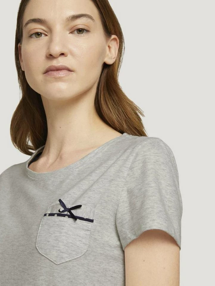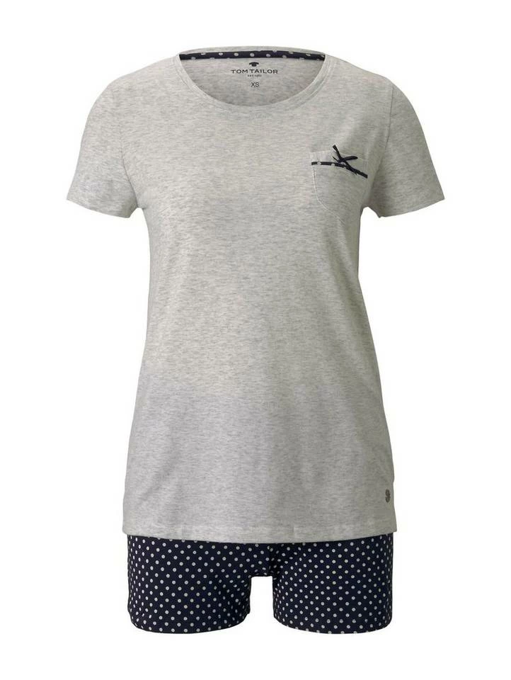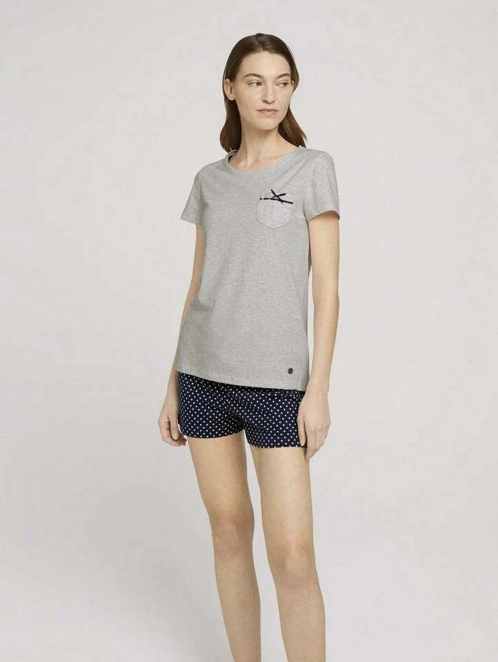 Gemustertes Pyjama-Set mit Shorts für Frauen (kurzärmlig mit Rundhalsausschnitt) aus dehnbarem und weichen Baumwolljersey, Hose: kurz und gepunktet mit elastischem Bund, T-Shirt: mit Schleife auf der Brusttasche