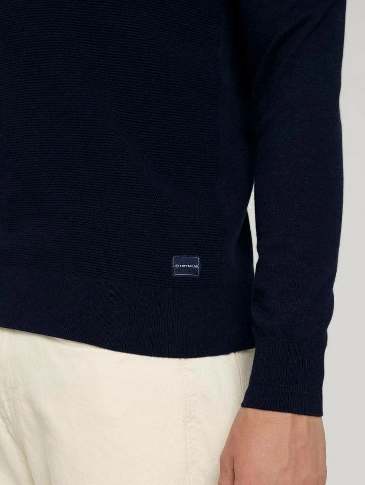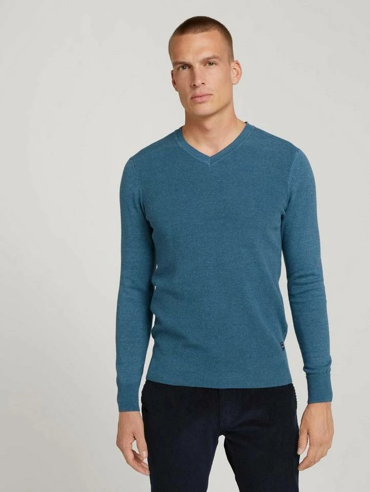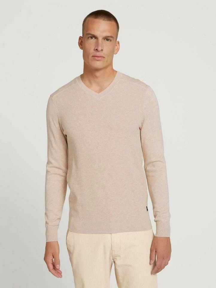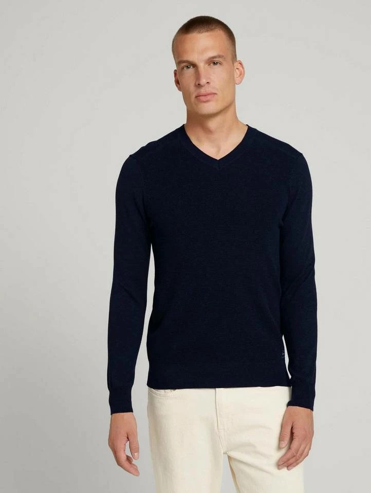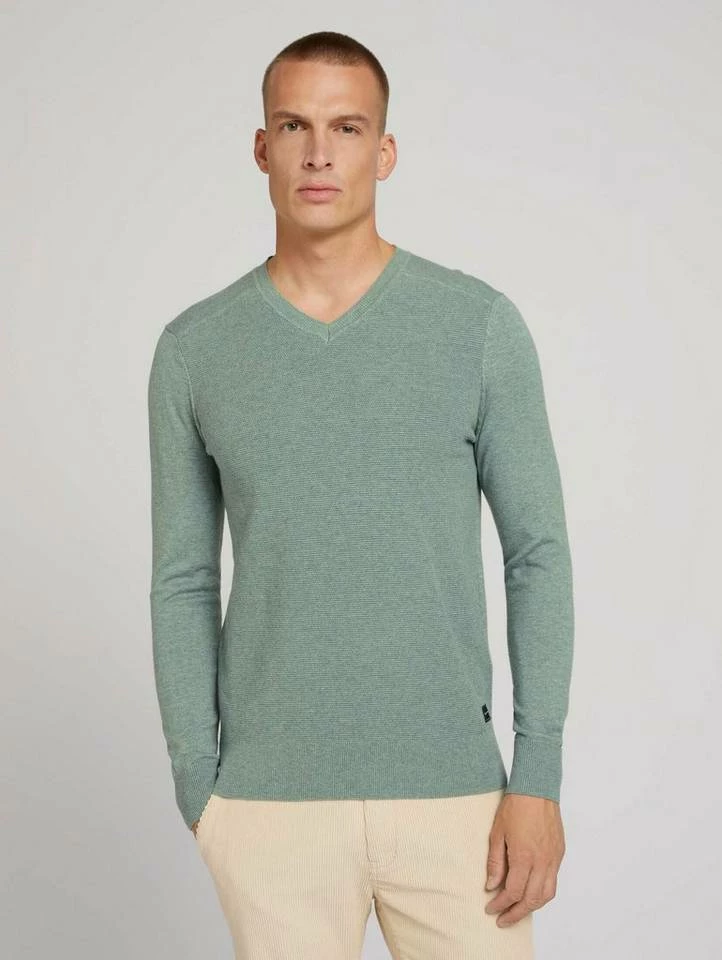 Strickpullover mit Struktur für Männer (langärmlig mit V-Ausschnitt) aus atmungsaktiver und weicher Baumwolle, in Mélange-Optik, aus feinem Ripp in Unifarben, mit abgesetztem Rippbündchen am Ärmel und am Saum, mit Logo Stickerei am Saum