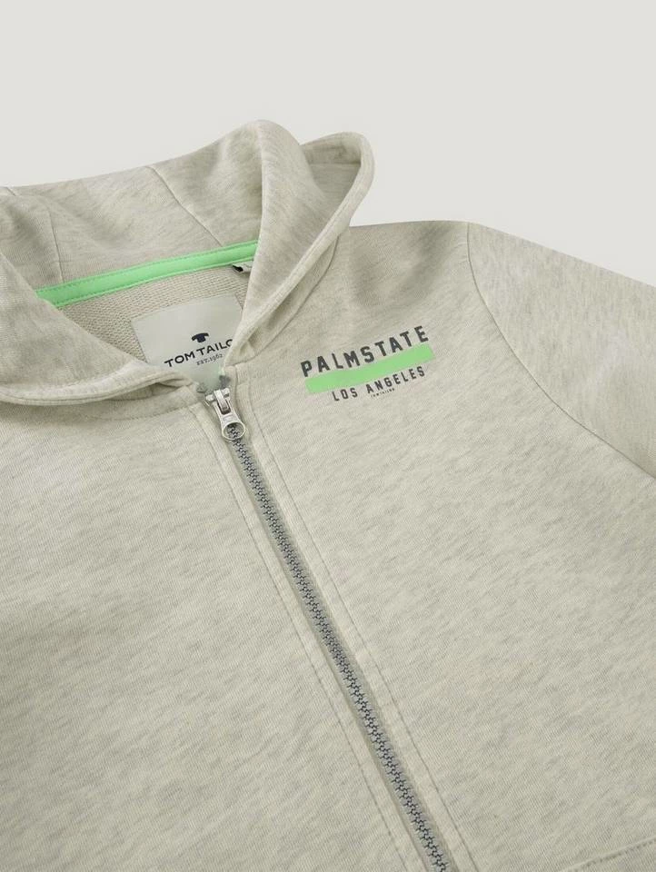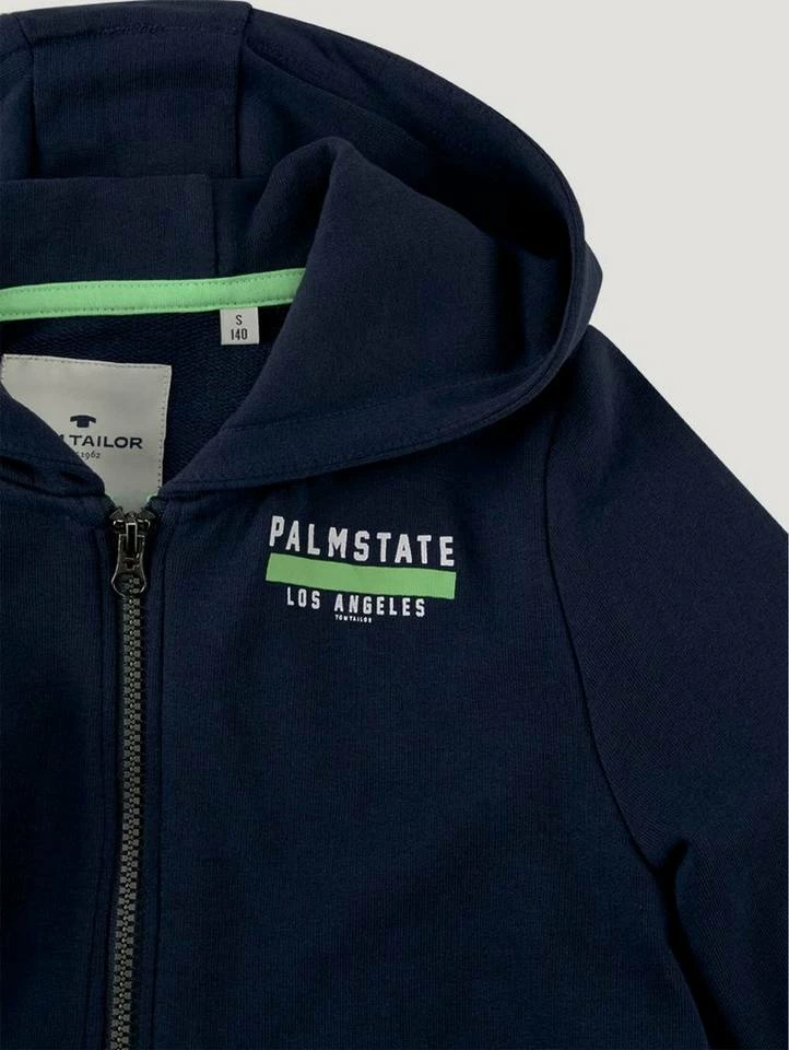 Sweatjacke mit Schrift-Print für Jungen (langärmlig mit Kapuze und Reißverschluss zum Schließen) aus reiner Baumwolle, mit dezentem Schrift-Print auf der Brust, mit großflächigem Schrift-Print auf der Kapuze