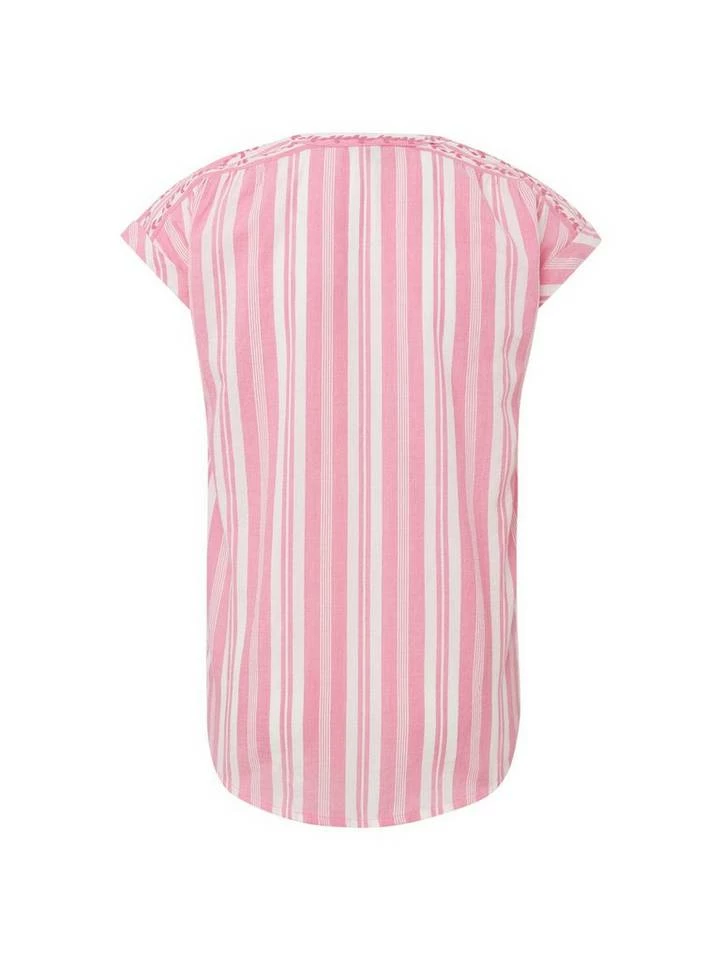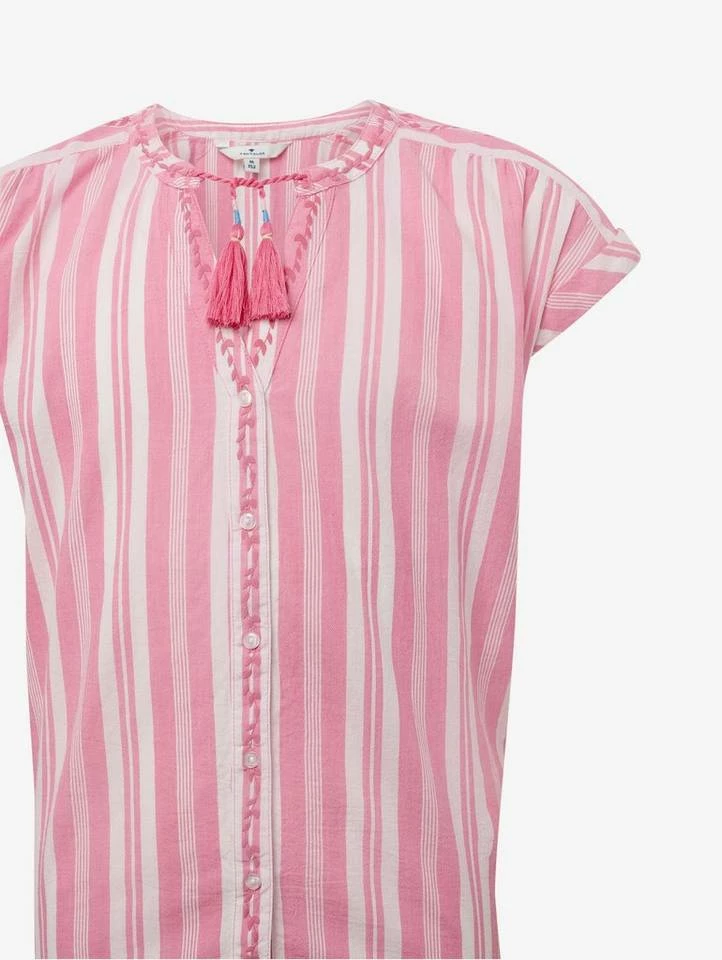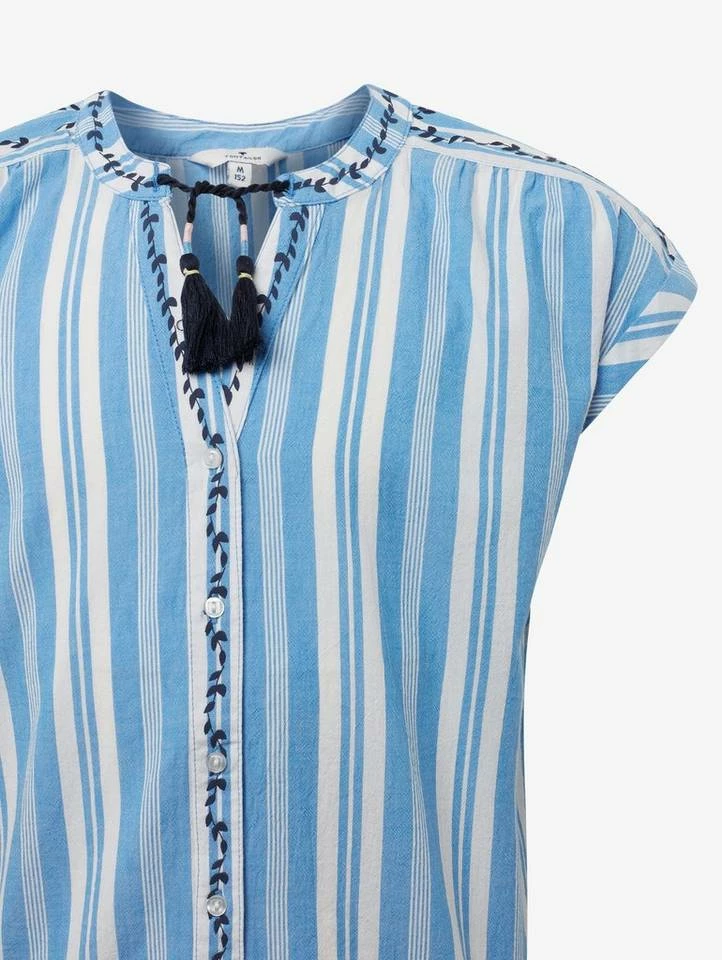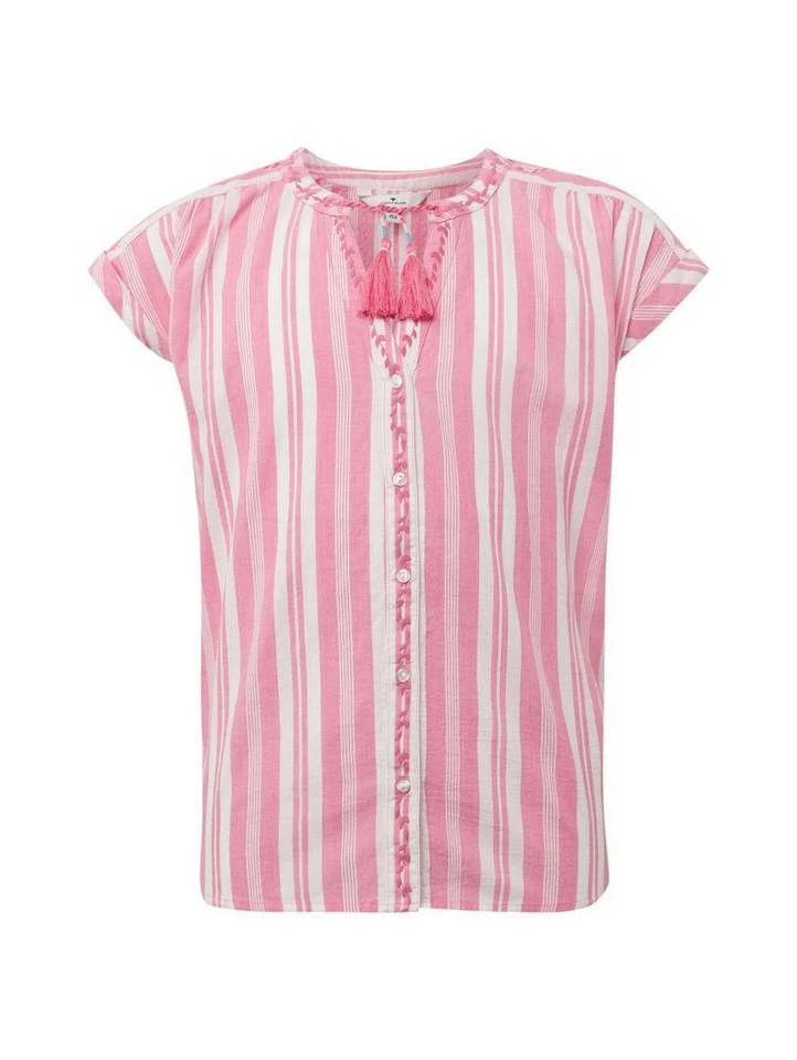 Gestreifte Kaftanbluse für Mädchen (unifarben mit Print, kurzärmlig mit V-Ausschnitt) aus Baumwollgewebe, mit Bändern und Quasten vorne am Ausschnitt, mit Logo-Coin vorne, mit ganzflächigem Streifenmuster, mit Print an den Schultern und der Frontblende, mit umgeschlagenen Saumkanten an den Ärmeln