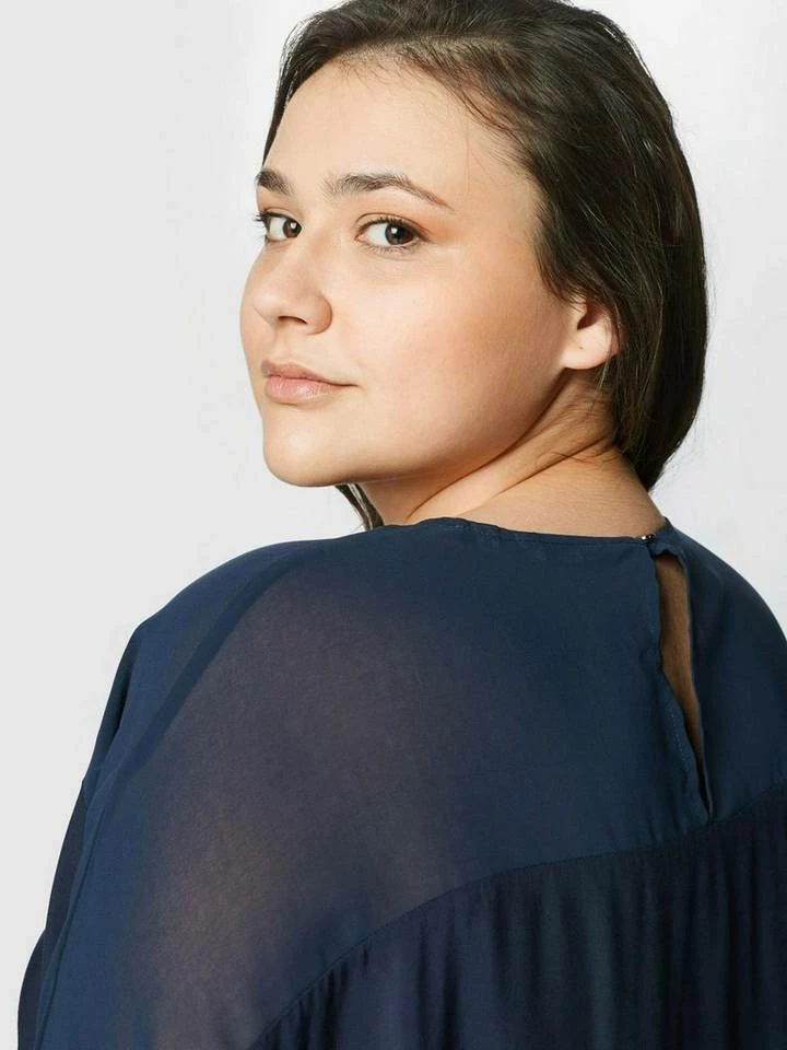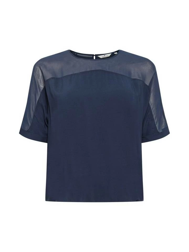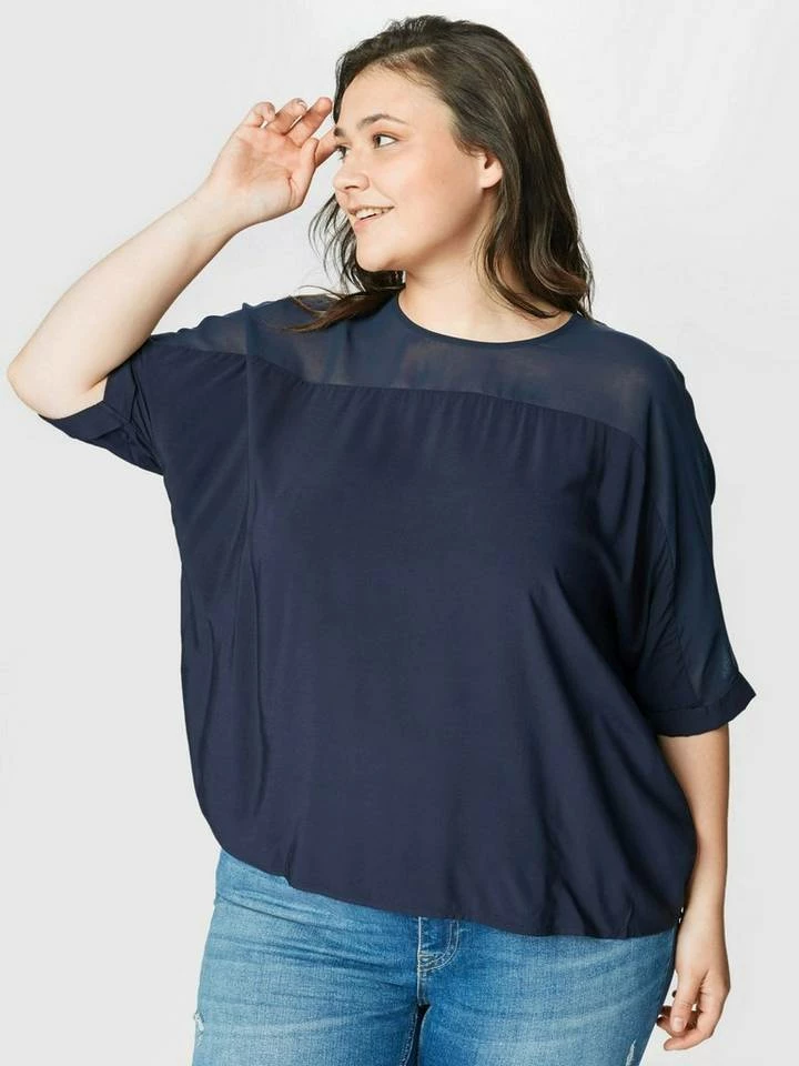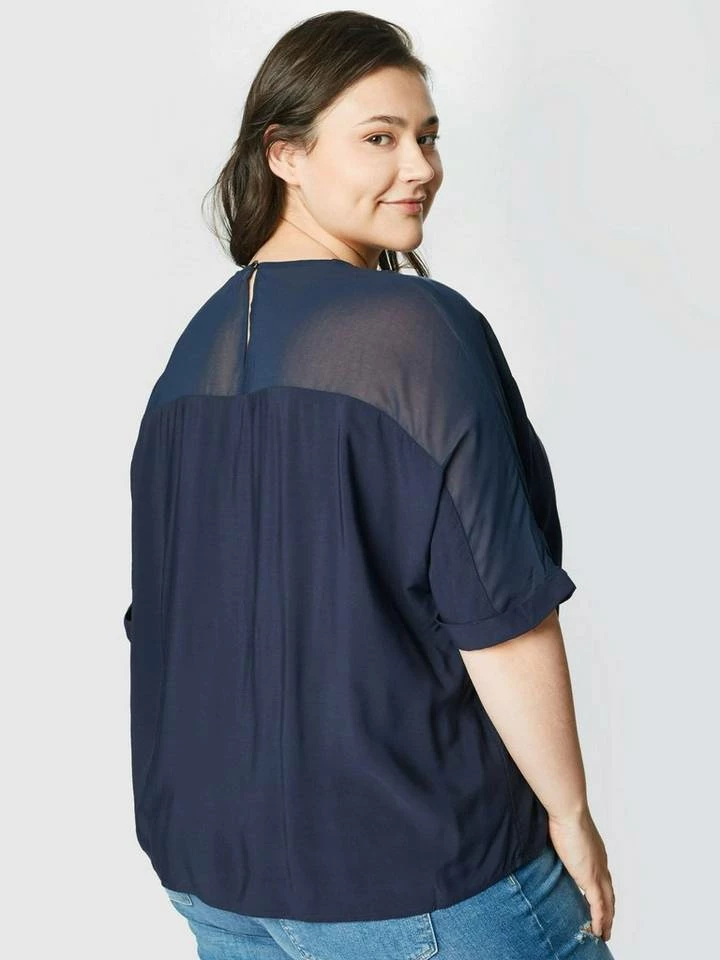 Kurzarmbluse mit Chiffoneinsatz für Frauen (kurzärmlig mit Rundhalsausschnitt und Knopf) aus weicher und fließender Viskose, mit fließendem Chiffoneinsatz an den Schultern, fixierter Ärmelaufschlag