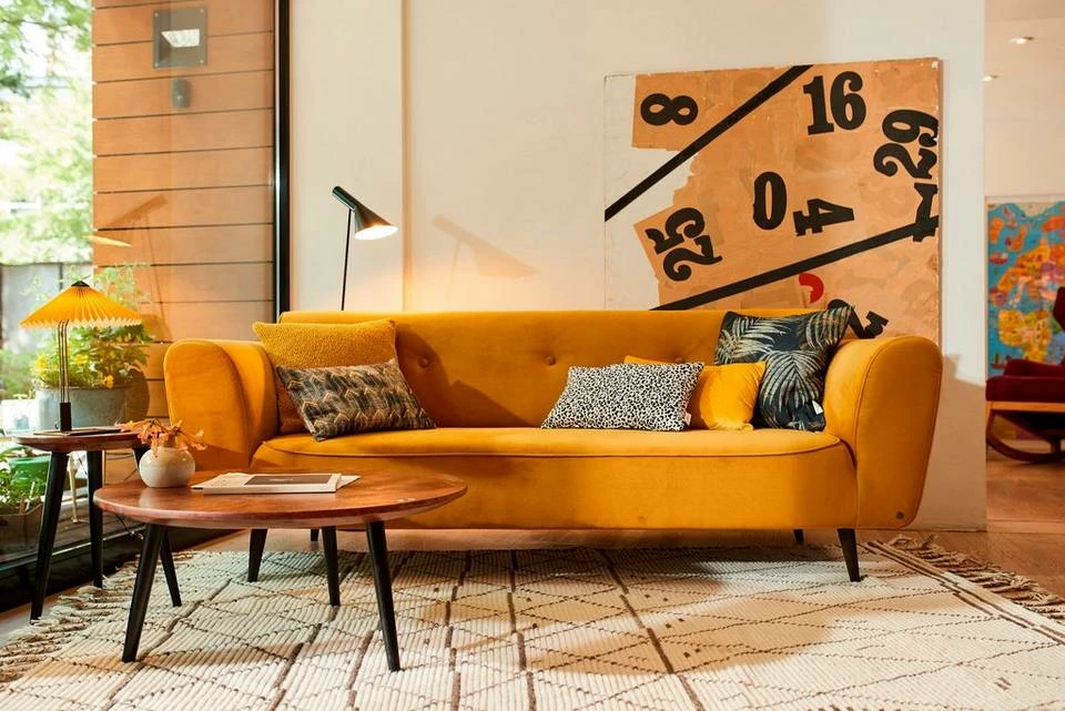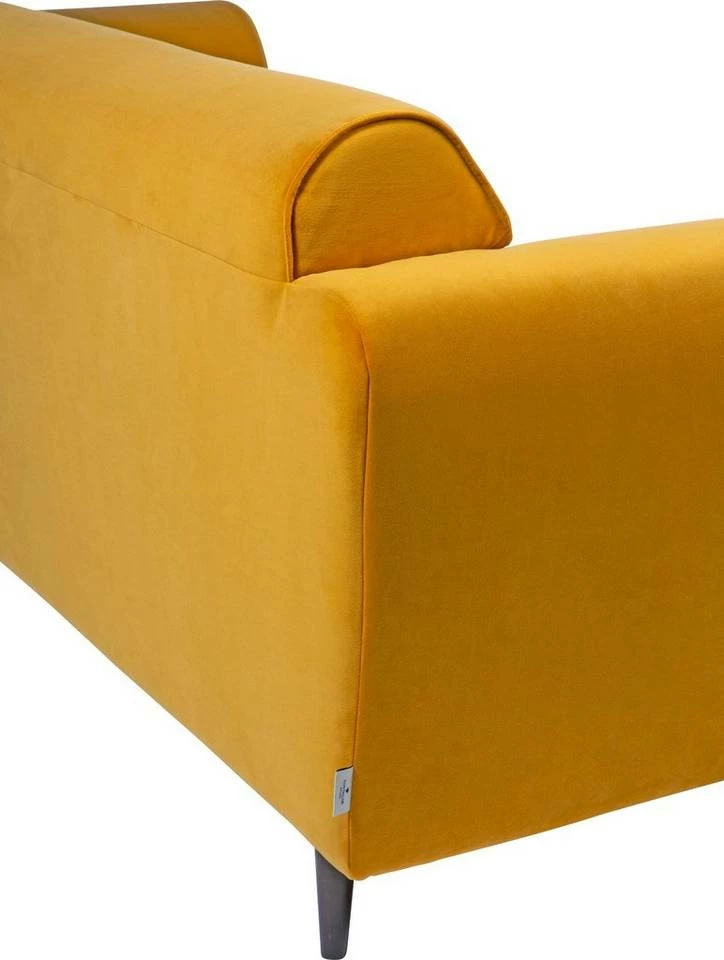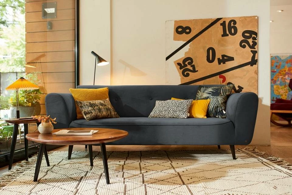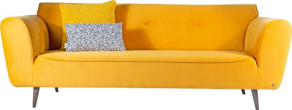 New Wave ist eine neue Sofaserie von TOM TAILOR mit geschwungenen, ausgestellten Armteilen. Die Rückenlehne ist höher als bei deren Modellen der Marken. Stylistisch orientiert sich das Modell am Retro- oder Midcenturystil. Hier in einem weichen Samtstoff und mit dunkelbraunen, ausgestellten Holzfüßen.
