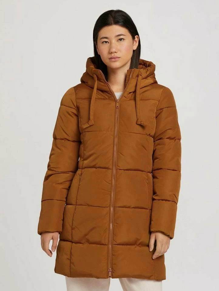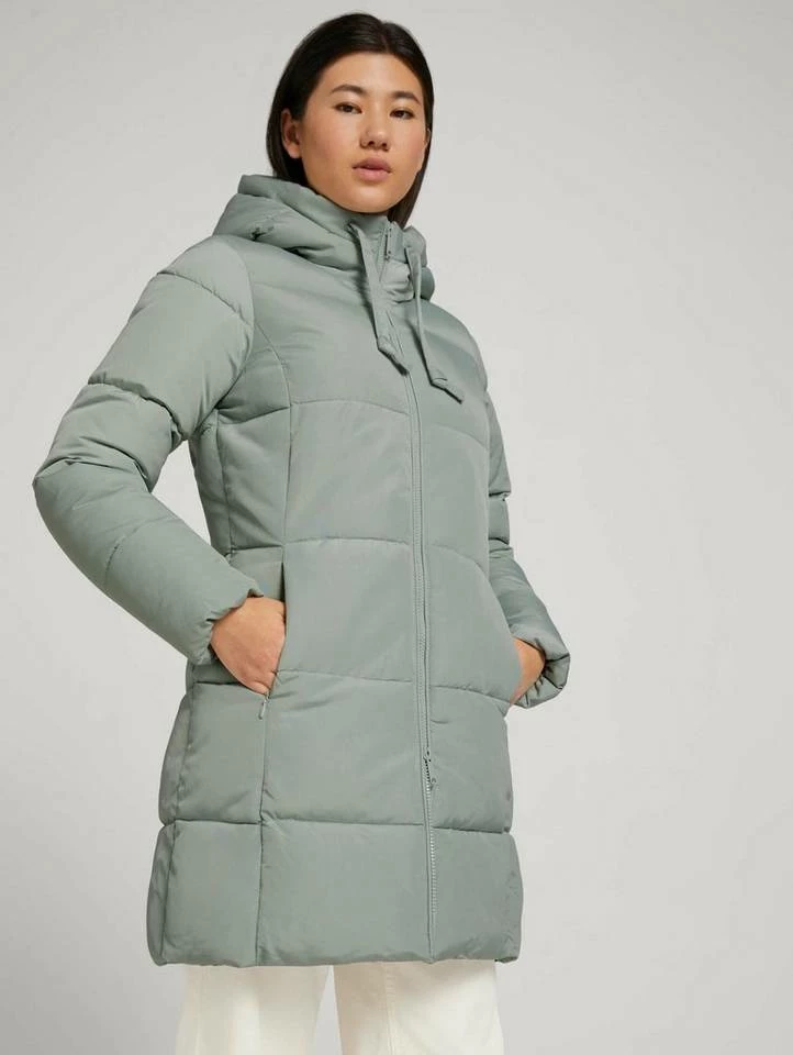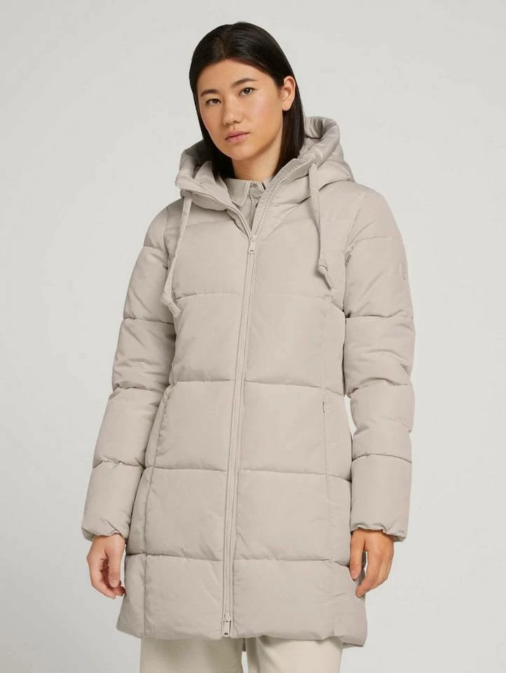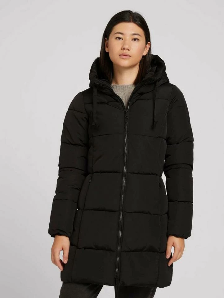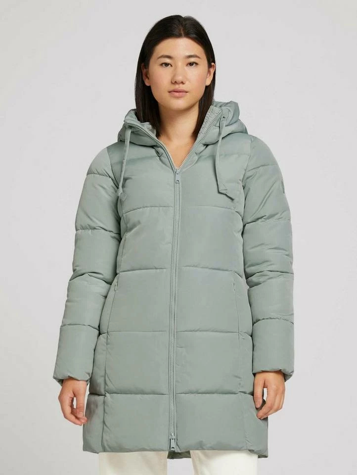 Lange Steppjacke für Frauen (langärmlig mit Kapuze und Reißverschluss) aus formbeständigem Gewebe, seitliche Reißverschlusstaschen, mit Steppungen und warmen Innenfutter