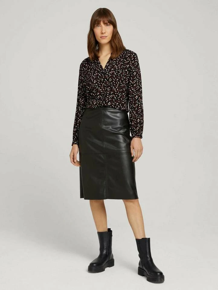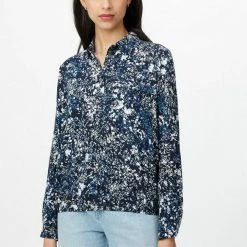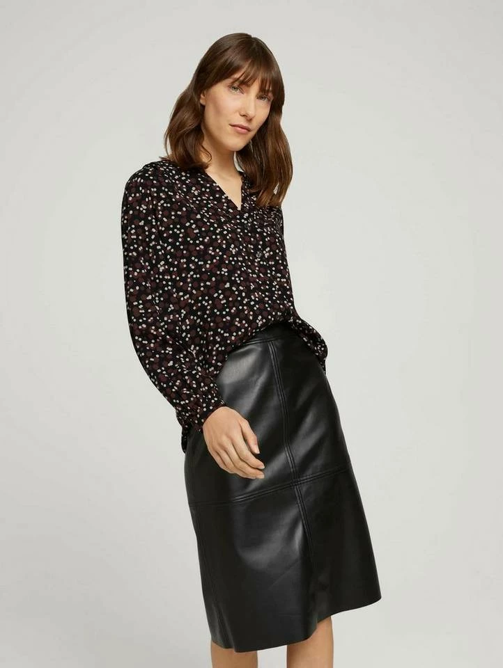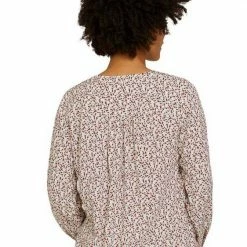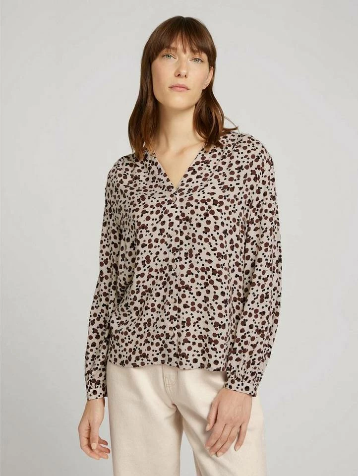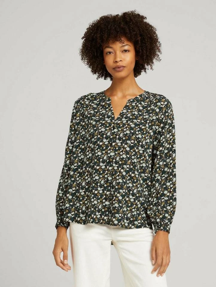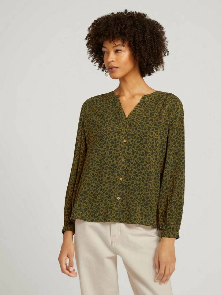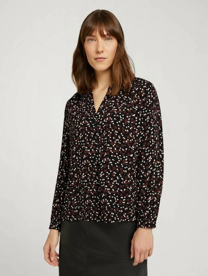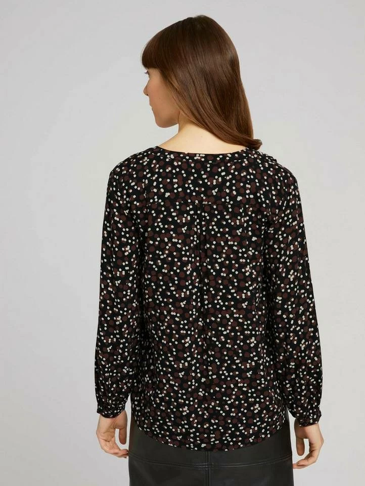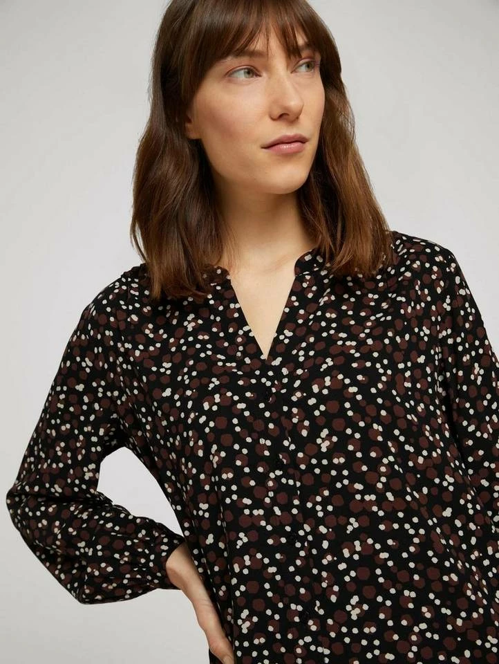 Gemusterte Henleybluse für Frauen (langärmlig mit Henleyausschnitt) aus fließendem, leicht transparentem Gewebe, gemustert, mit Faltenlegung an den Schultern