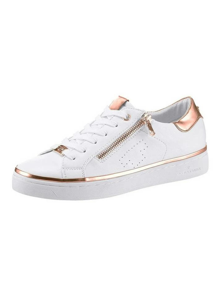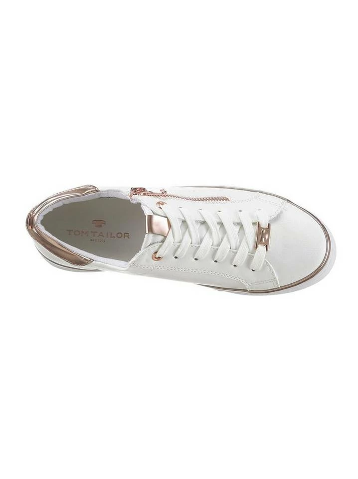 Trendstarker Schnürschuh von Tom Tailor mit angesagten Metallic-Elementen und modischer Plateau-Sohle. Innenfutter: Textil. Innensohle: Lederimitat. Praktische Schnürung vorne und seitlicher Zier-Reißverschluss. Rutschhemmende TR-Laufsohle mit ca. 40 mm Absatz. Weite F.