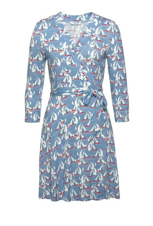 Das reduziert-lässige Jerseykleid von Tom Tailor Polo Team kommt mit kleinen, aber feinen Details daher. Souverän inszeniert mit auffallend schönem Allover-Musterprint in maritimer Optik. Eng anliegendes Oberteil in raffinierter Wickel-Optik mit V-Ausschnitt, trendigen 3/4-Ärmeln und Bindeband auf Taillenhöhe. Ausgestellter Rockteil mit schwingendem Saum. Länge ca. 101 cm. Weich fließende, elastische Jersey-Qualität aus 95% Viskose/5% Elasthan.