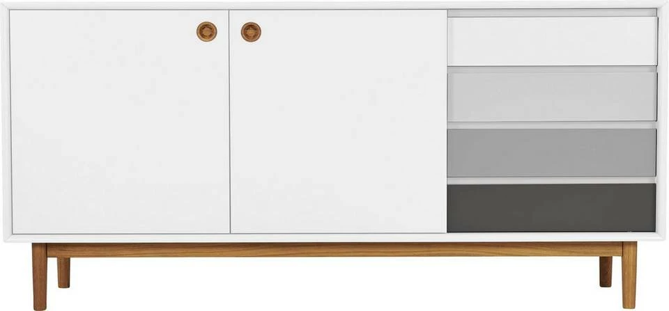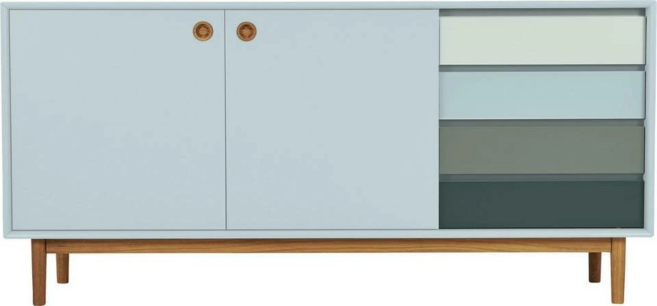Das in Schweden gefertigte edle Sideboard »COLOR BOX« der Marke TOM TAILOR ist ein wahrer Blickfang in deinem Zuhause. Seine Optik zeichnet sich durch attraktive Schubladenfronten in verschiedenen Farben und dekorative Knopfgriffe im Holzdekor aus. Da die Kommode in mehreren edlen Farbausführungen zur Verfügung steht, ist sie harmonisch in das bestehende Interieur integrierbar. Ein Hingucker ist sie in skandinavisch, zeitgemäß und extravagant eingerichteten Räumen. Auf seiner großflächigen Ablage bietet der Schrank viel Platz für Deko-Objekte und Zimmerpflanzen. Darunter ist er mit Türen und mehreren Schubladen ausgestattet, die reichlich Stauraum verbergen. Hier lassen sich beispielsweise Geschirr, Schalen und Wohnaccessoires aufbewahren. Qualitativ punktet die Anrichte mit einer hochwertigen Materialauswahl. Ein Blickfang in jedem Wohnbereich, Ess- und Gästezimmer: das stilvolle Sideboard »COLOR BOX« TOM TAILOR.