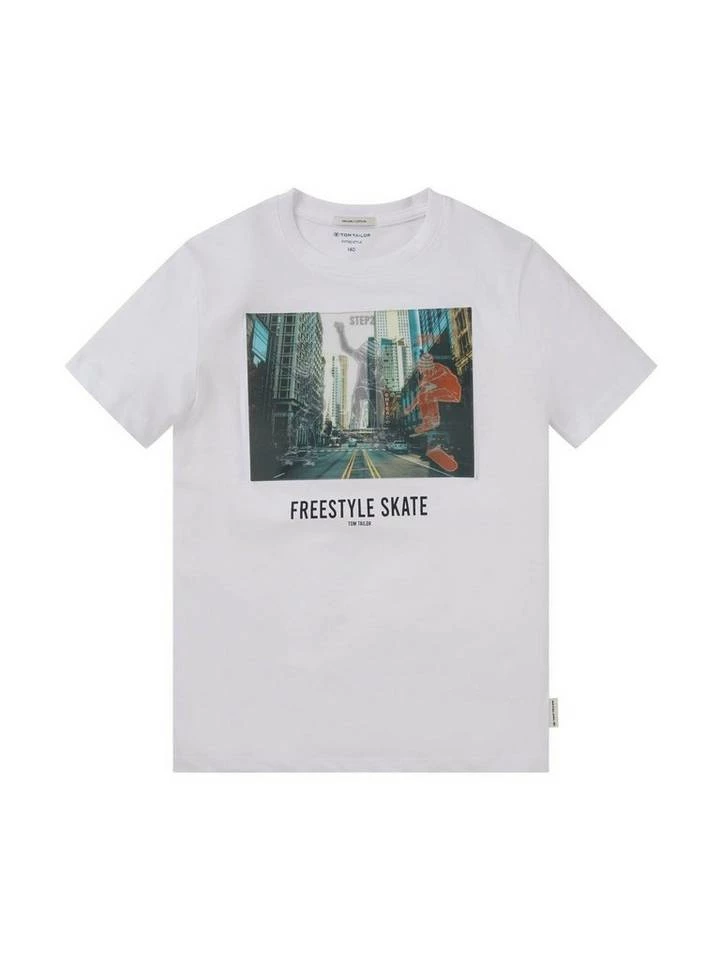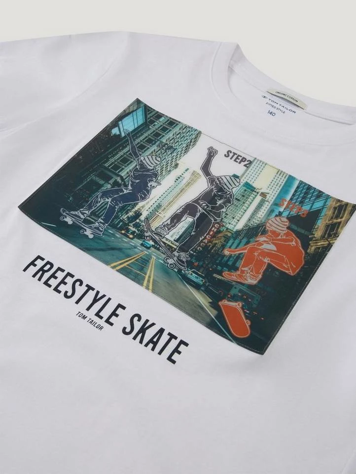 T-Shirt mit Fotoprint und Schriftzug für Jungen (kurzärmlig mit Rundhalsausschnitt) mit Bio-Baumwolle aus nachhaltigem Anbau, mit Ripp am Saumkragen, mit Flag Label am Saum, mit Fotoprint und Schriftzug auf der Front
