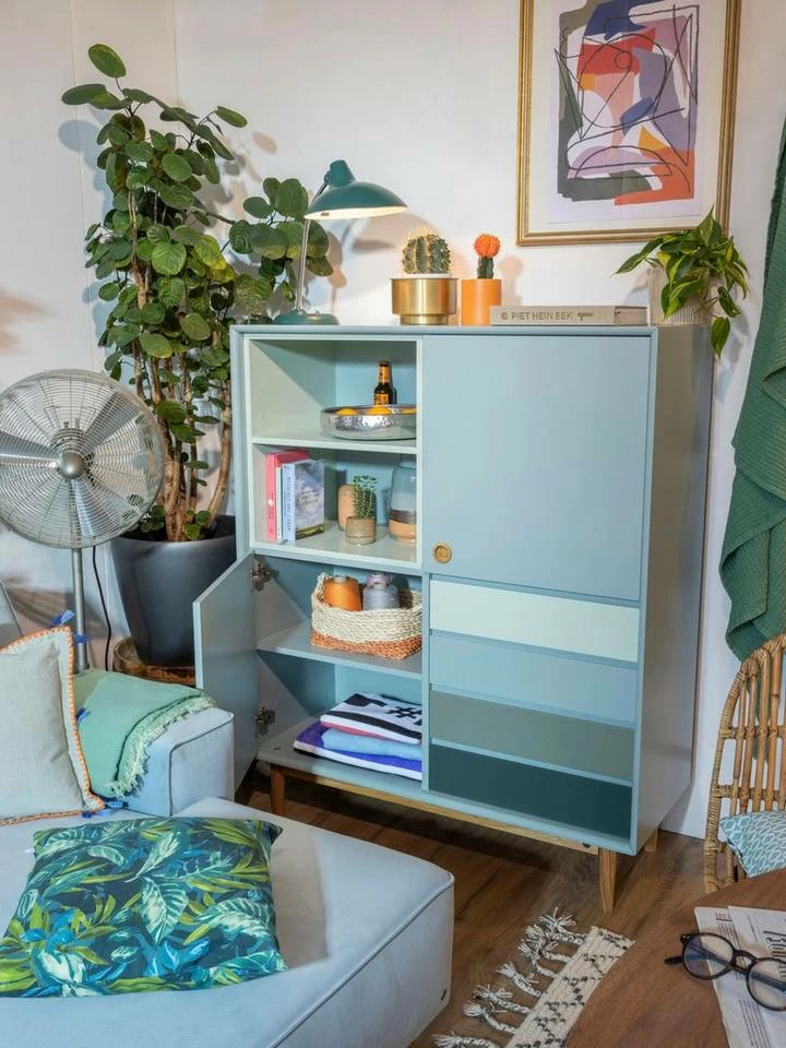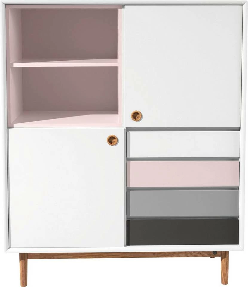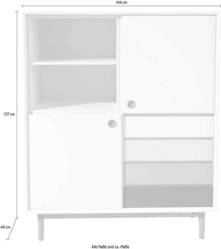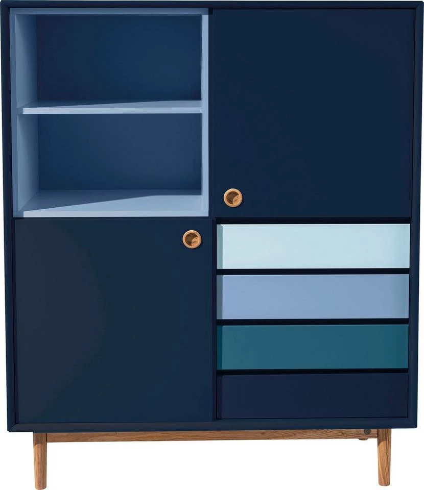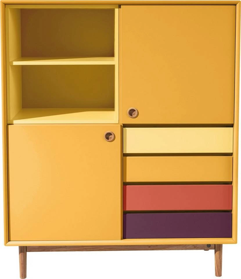 Das Highboard »COLOR BOX« von TOM TAILOR in extravaganter Farbkombination setzt einen edlen Akzent in den heimischen vier Wänden. Formschöne Füße in Eiche-Massivholz und dekorative Knopfgriffe ergänzen das stilvolle Design. Den optischen Blickfang bilden die attraktiven Schubladenfronten, die in unterschiedlichen Farben gestaltet sind. Mit ihrem außergewöhnlichen Design passt die Hochkommode zu unterschiedlichsten Wohnstilen, von skandinavisch bis mediterran. Hinter ihren Türen und in den offenen Fächern bietet die in Schweden gefertigte Kommode reichlich Platz für Bücher und dekorative Accessoires. Ausgestattet ist der Schrank zudem mit mehreren Schubladen, die weitere Stauraummöglichkeiten verbergen. Durch die integrierte Soft-Close-Funktion lassen sich Türen und Schubladen materialschonend und leise schließen. Für die Herstellung der Kommode kommen Materialien in hochwertiger Qualität zum Einsatz. Ein besonderes Einrichtungselement im Zuhause: das Highboard »COLOR BOX« von TOM TAILOR in attraktiver Farbkombination.