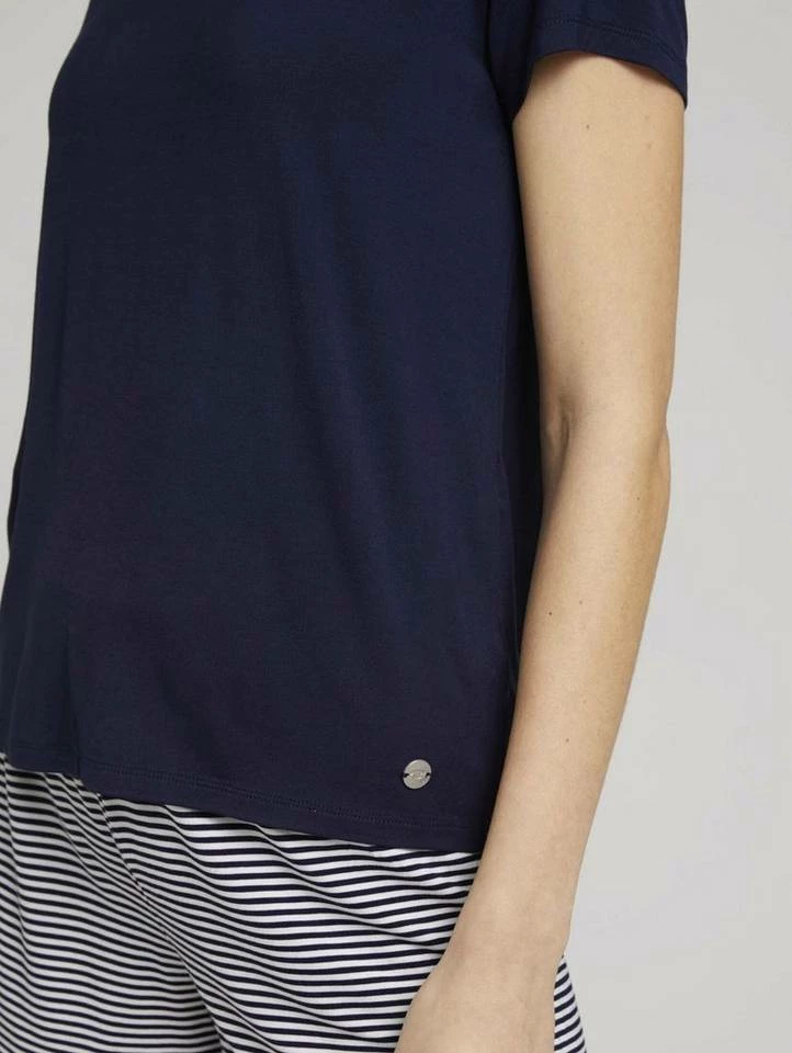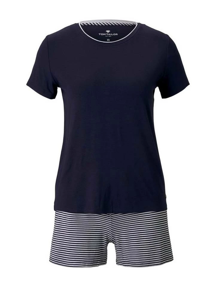 Maritimes Pyjama-Set mit Shorts für Frauen (kurzärmlig mit Rundhalsausschnitt) aus fließender und dehnbarer Viskose, Hose: kurz und gestreift mit elastischem Bund, T-Shirt: Unifarben