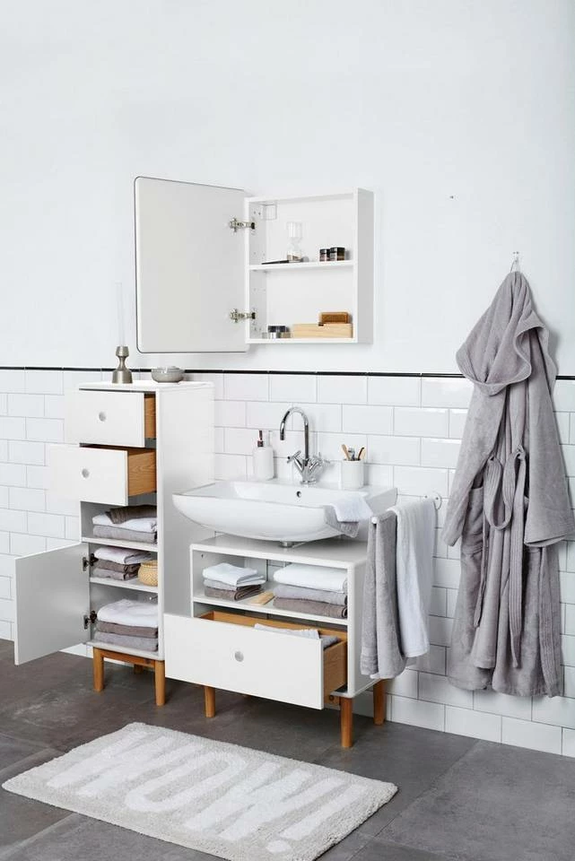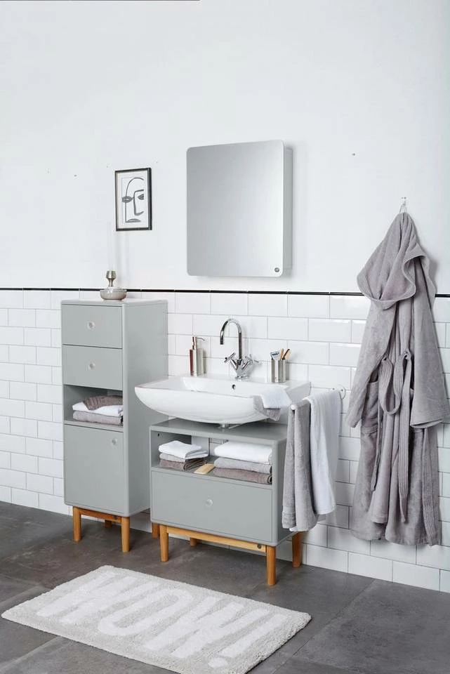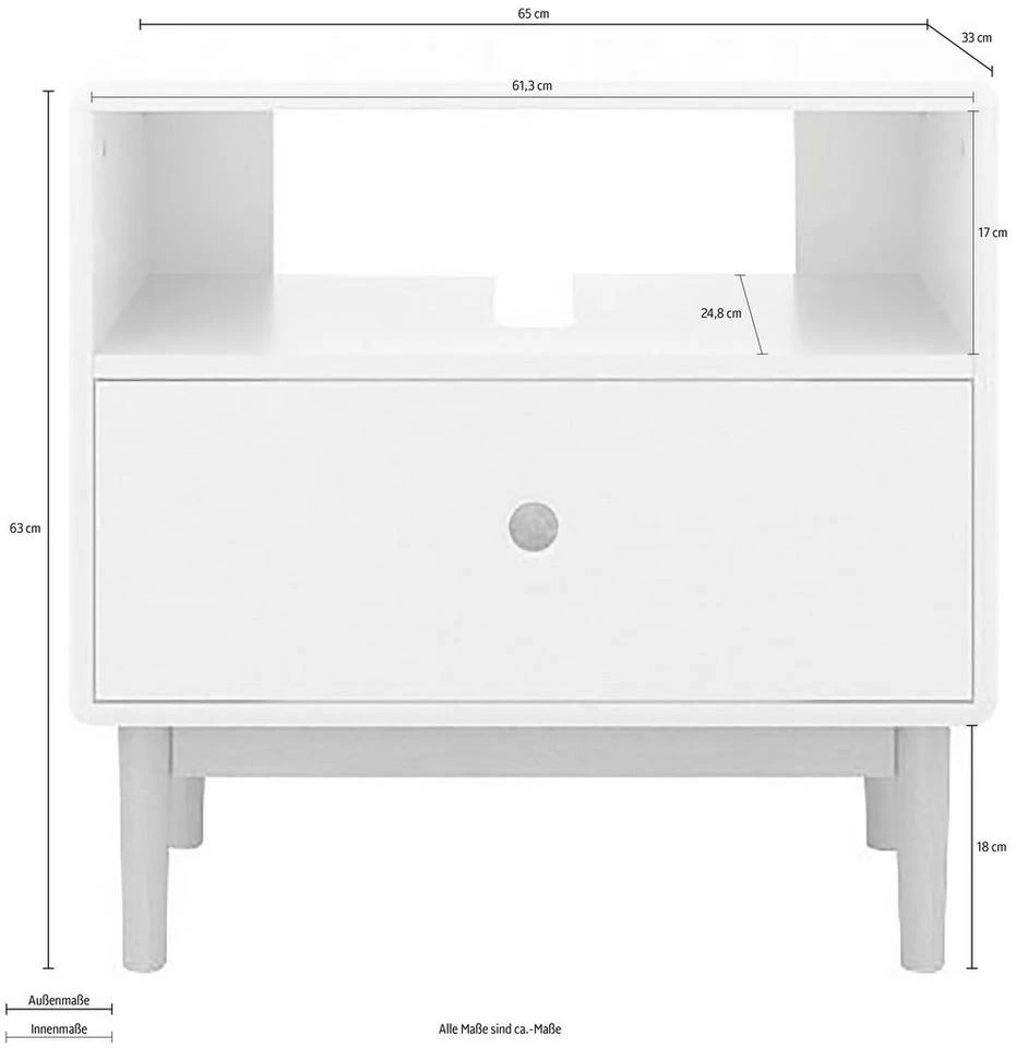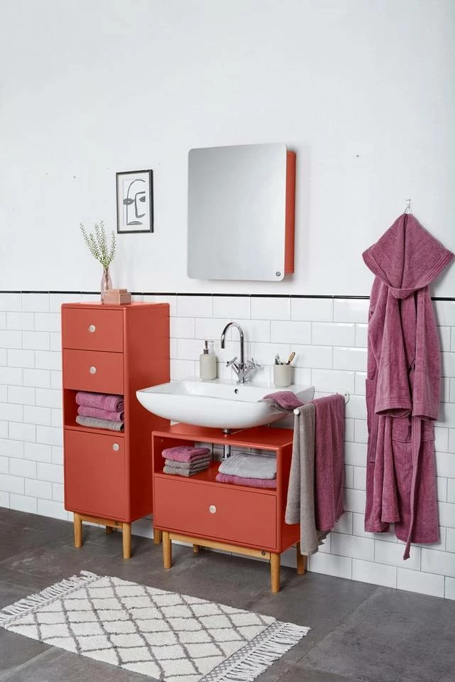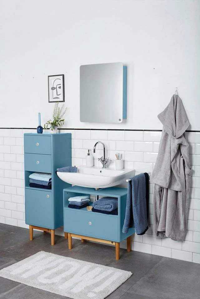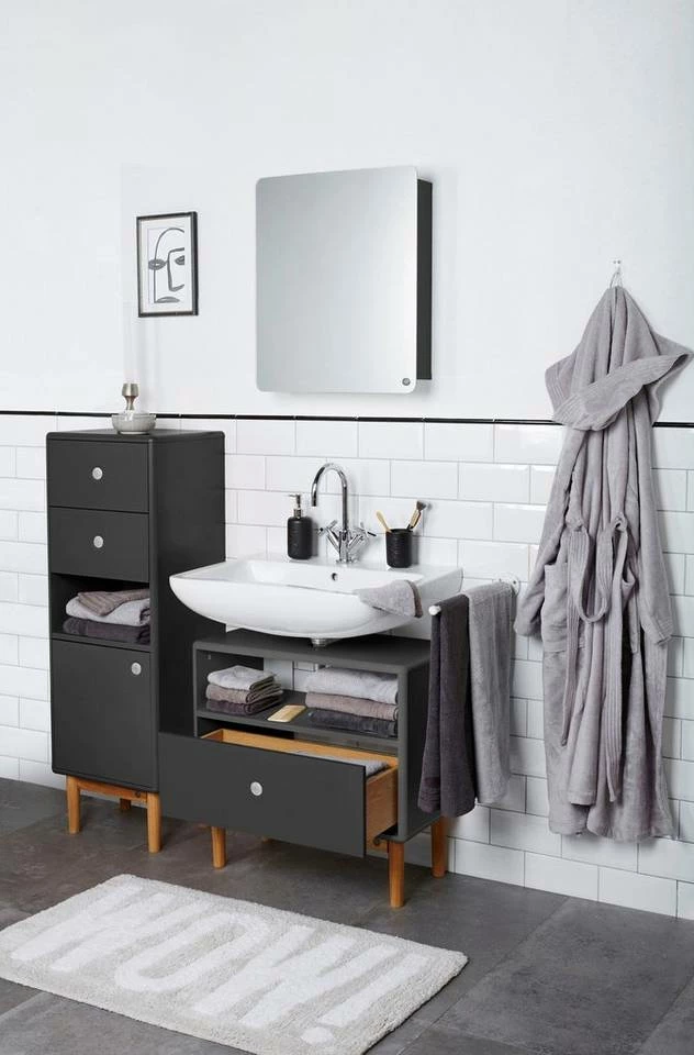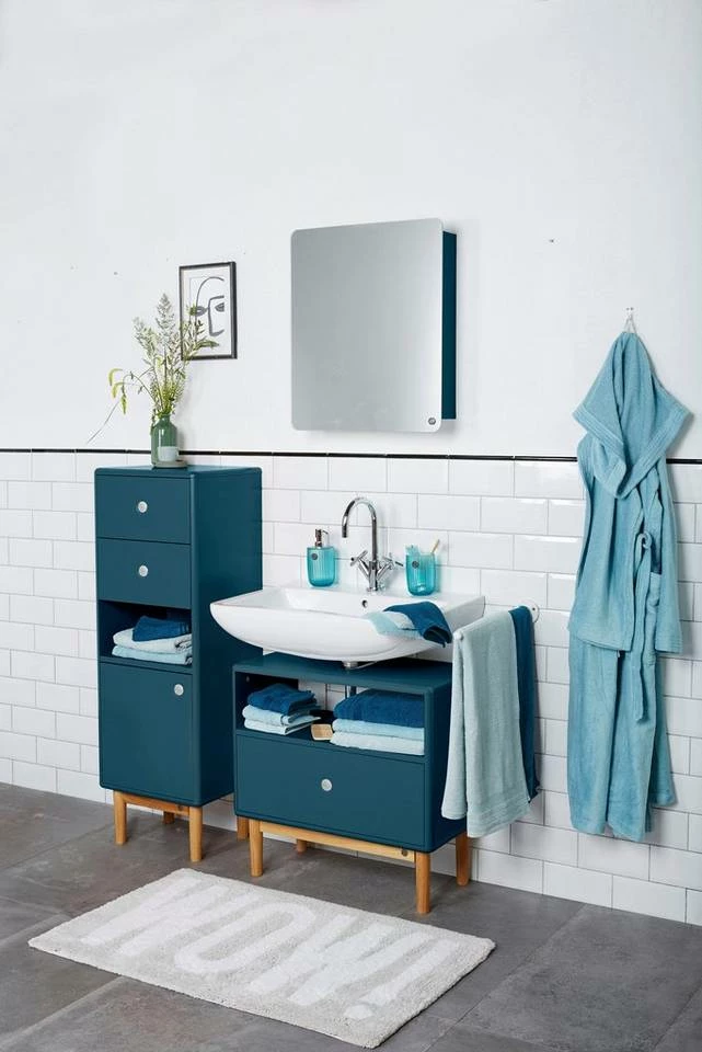 In trendiger Farbkombination präsentiert sich der kompakte Waschbeckenunterschrank »COLOR BATH« von TOM TAILOR. Er lässt sich universell unter das vorhandene Waschbecken platzieren und sorgt für ein Highlight in deinem Bad oder Gäste-WC. Neben den abgerundeten Kanten trägt das kontrastfarbene Massivholz-Untergestell mit runden Füßen zur stylischen Optik bei. Je nach Größe und Form des Waschbeckens bietet der Oberboden des Badschranks eine Ablagefläche. Handtücher oder andere Badutensilien finden im offenen Fach darunter Platz. Außerdem stellt der Unterschrank einen geräumigen Auszug mit Push-to-Open-Funktion zur Verfügung. Über den dekorativen Knopfgriff aus Metall lässt sich das Schubfach leicht bedienen. Zum Einsatz kommen qualitätsvolle Holzwerkstoffe in hochwertiger Verarbeitung. Dank Lackierung besitzen sie leicht zu pflegende Oberflächen. Damit sich der Badschrank bündig an die Wand stellen lässt, sind Ausschnitte für den Siphon integriert. Somit verschwindet die Waschbeckeninstallation unsichtbar im Innenraum. Als hochwertiges Badmöbel made in Sweden überzeugt der kompakte Waschbeckenunterschrank »COLOR BATH« aus dem Hause TOM TAILOR.