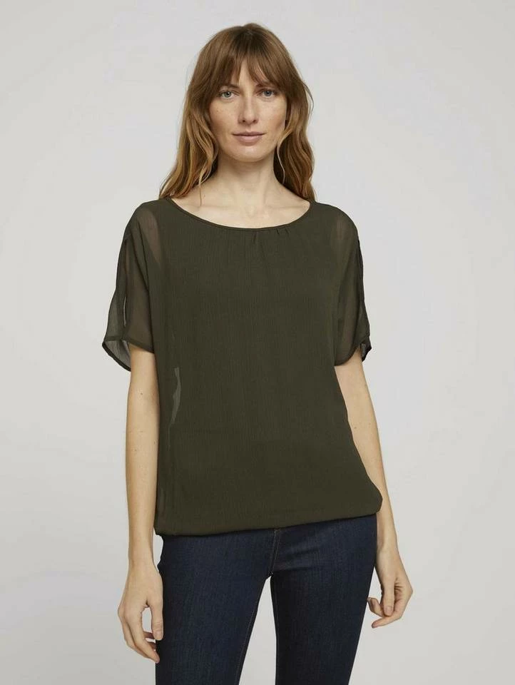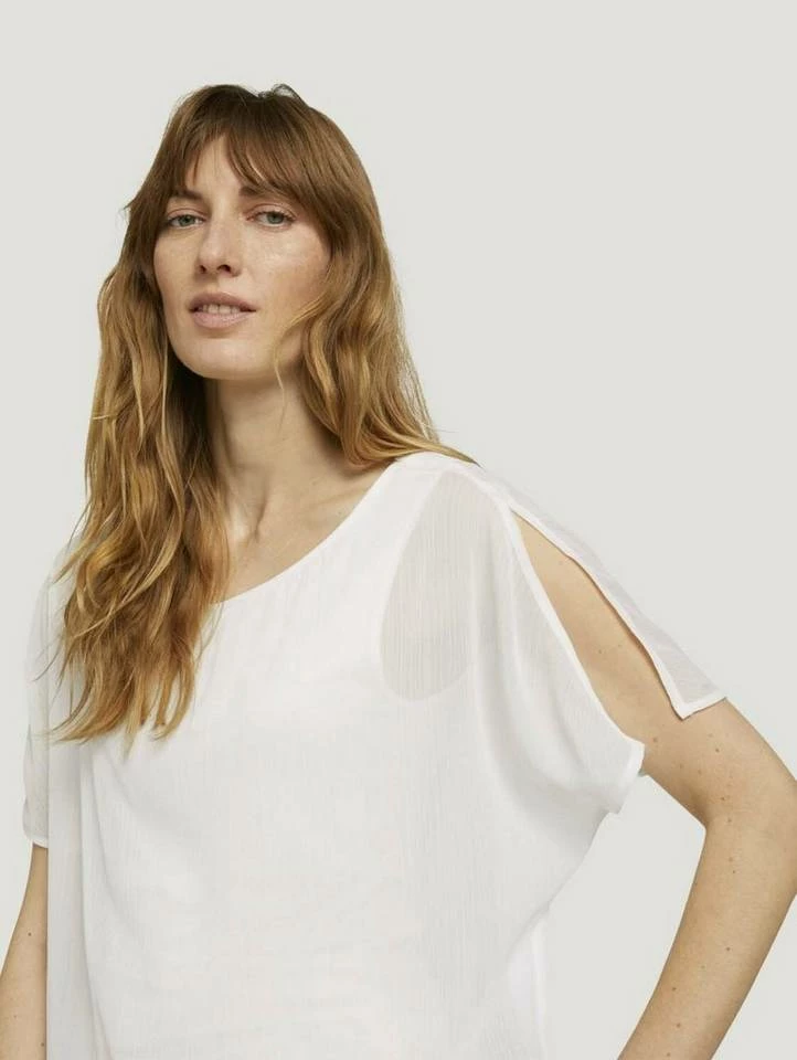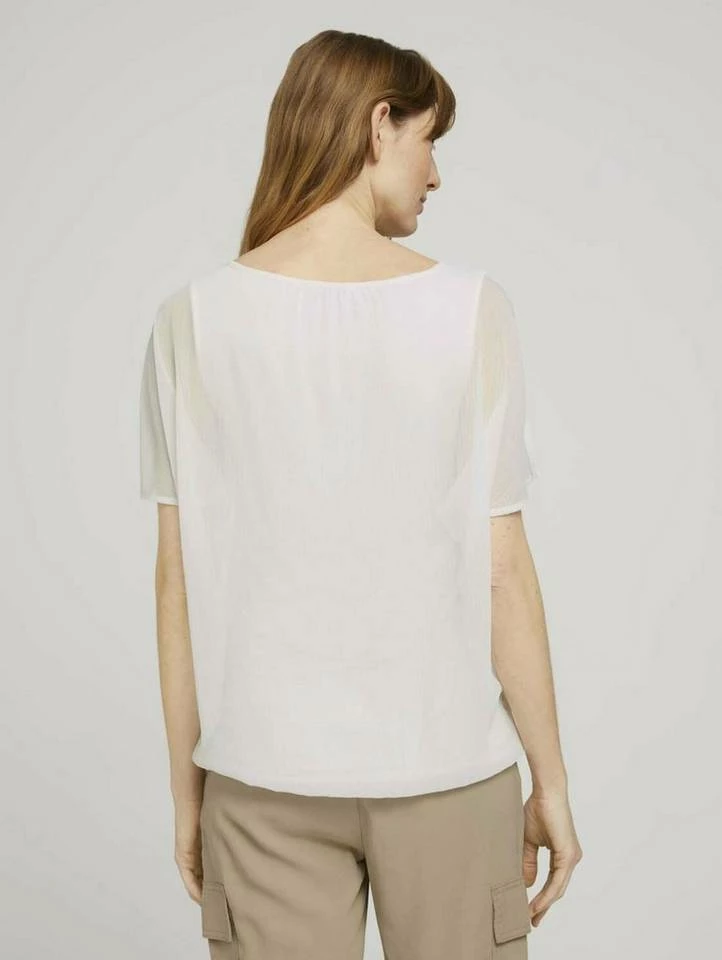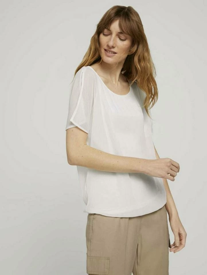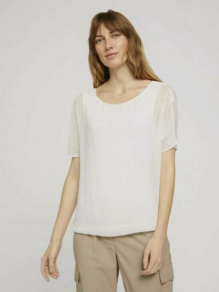 Fließende Bluse im Materialmix für Frauen (kurzärmlig mit Rundhalsausschnitt) im Materialmix: Oberteil aus strukturiertem Chiffon, Unterteil aus dehnbarem Jersey, mit elastischem Bund am Saum, feine Raffung am Ausschnitt, mit Schlitzen am Ärmel