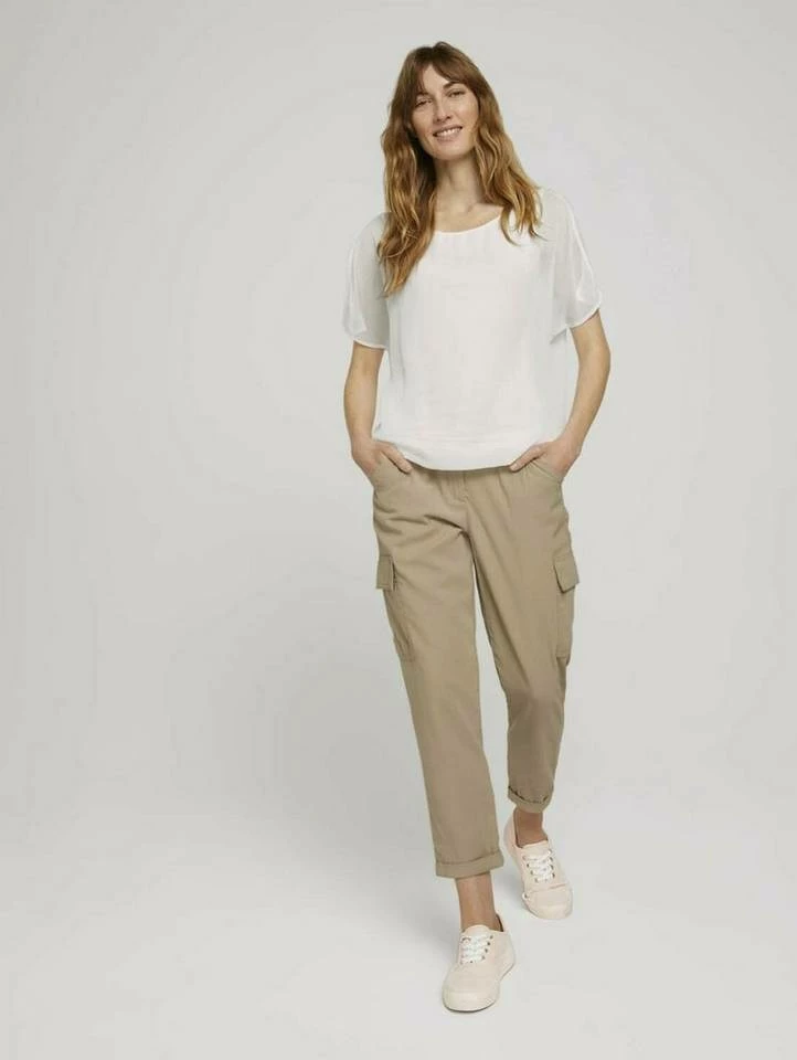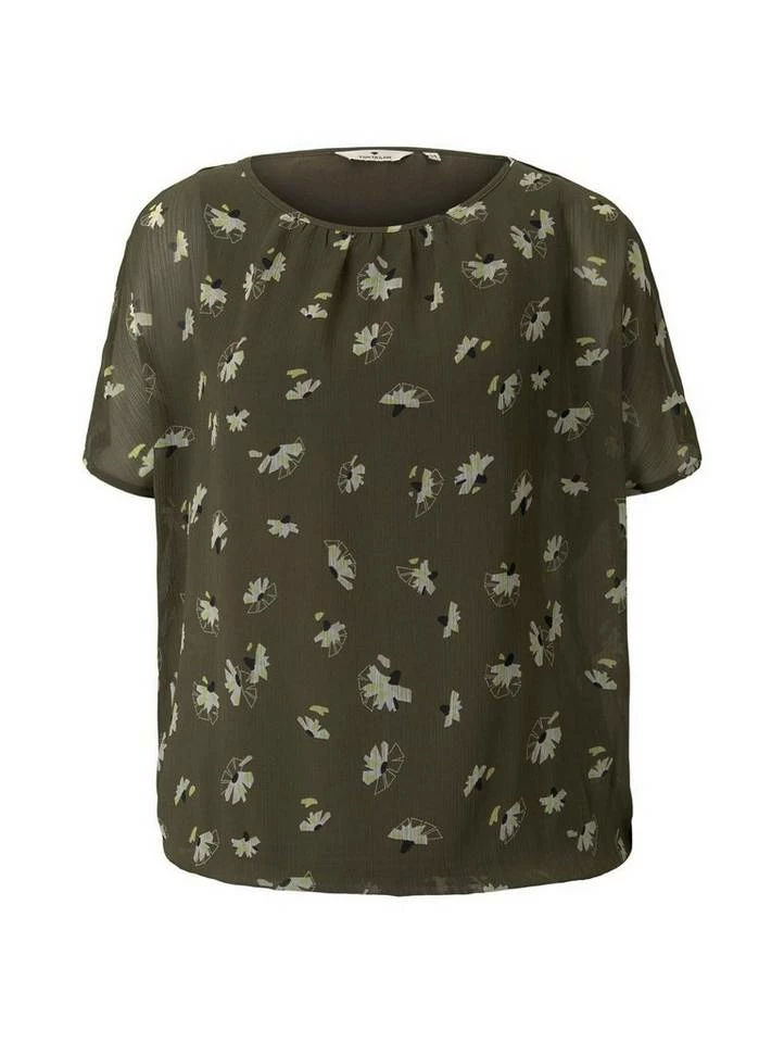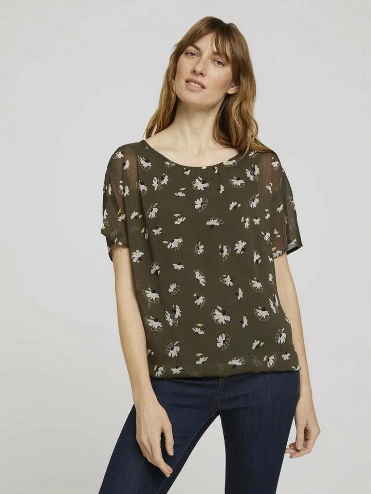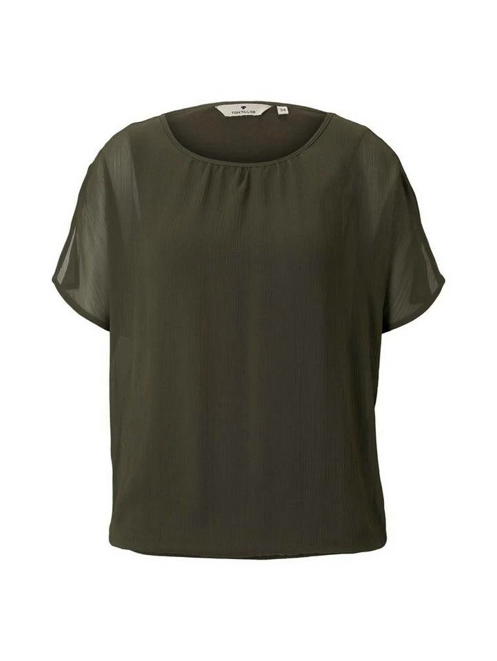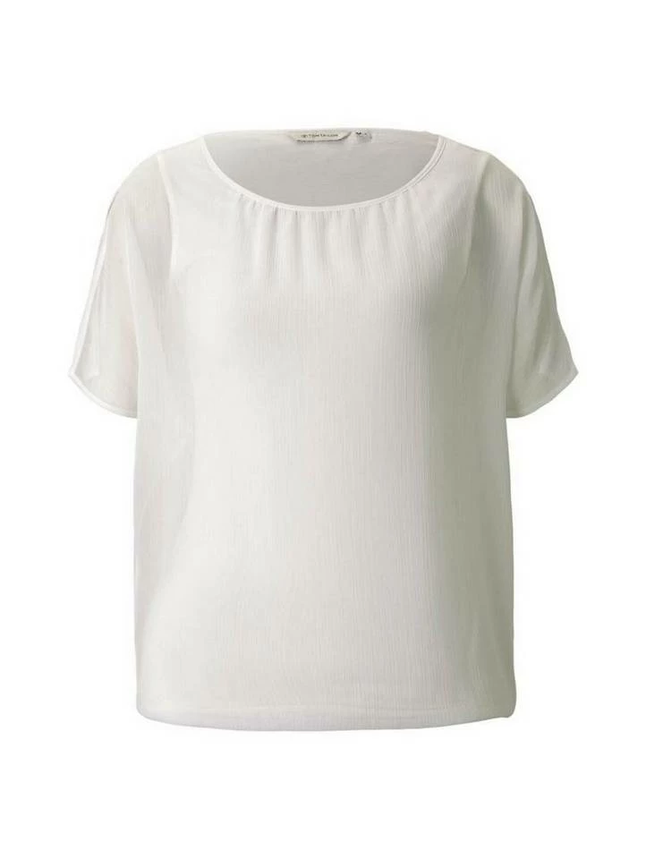 Fließende Bluse im Materialmix für Frauen (kurzärmlig mit Rundhalsausschnitt) im Materialmix: Oberteil aus strukturiertem Chiffon, Unterteil aus dehnbarem Jersey, mit elastischem Bund am Saum, feine Raffung am Ausschnitt, mit Schlitzen am Ärmel